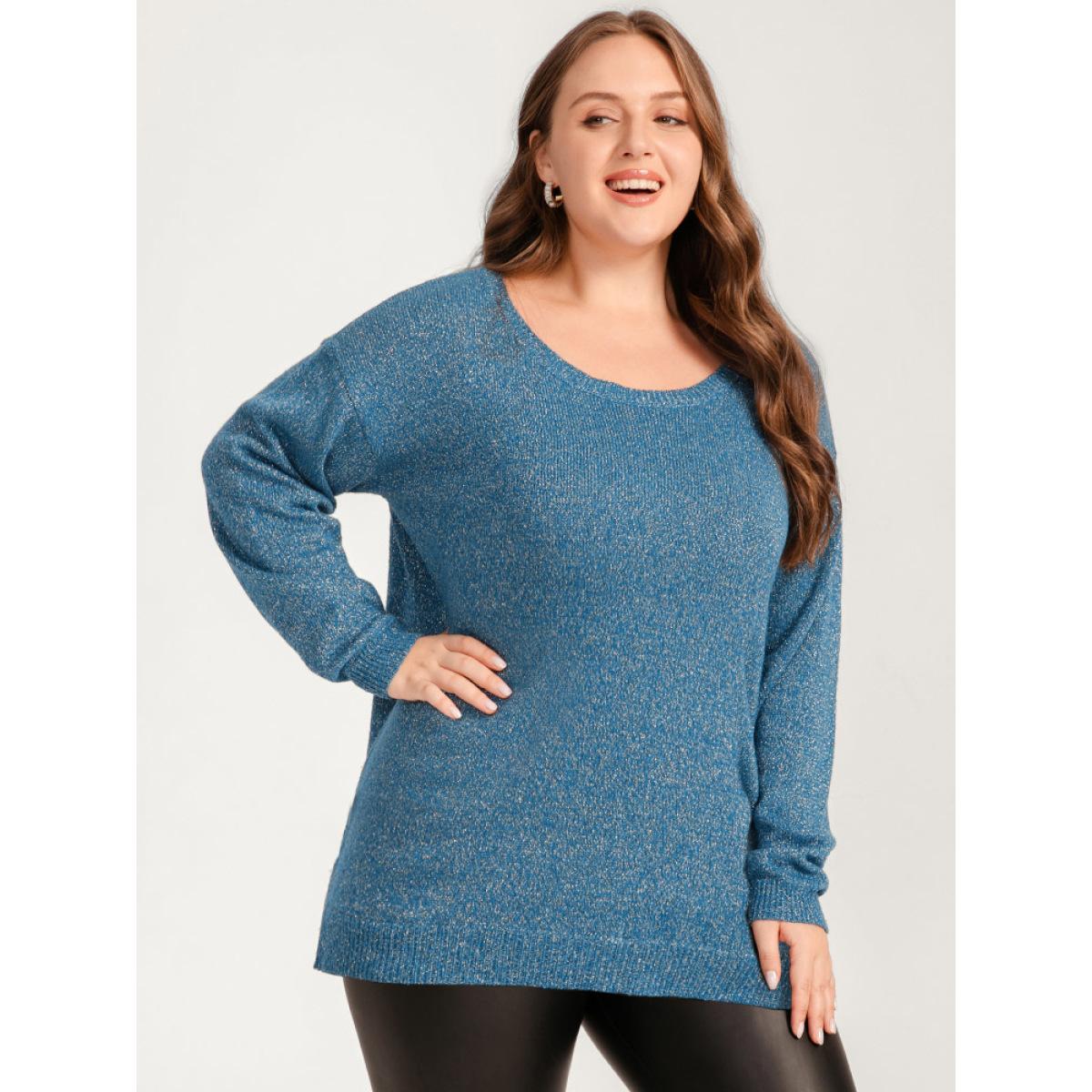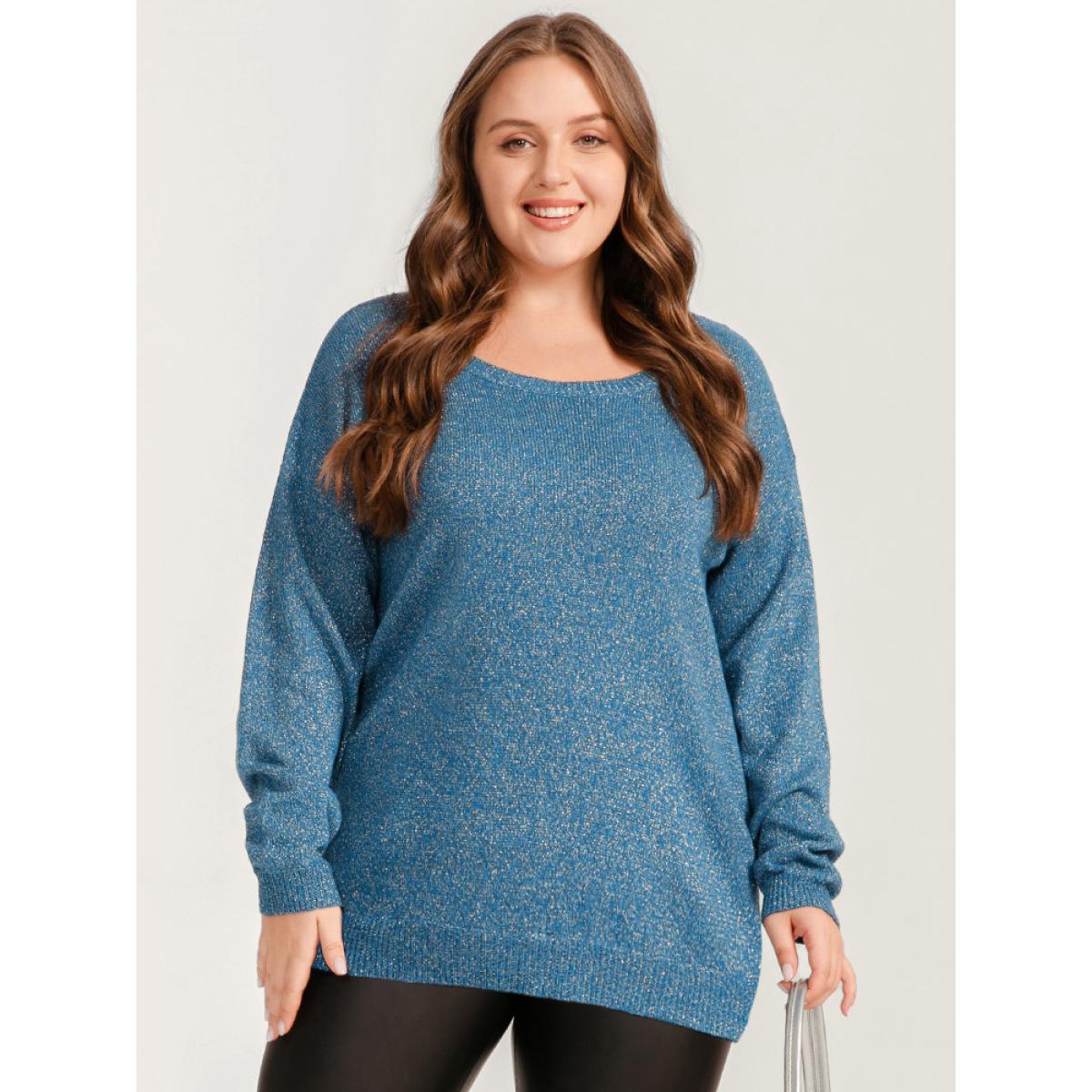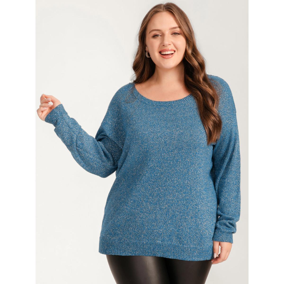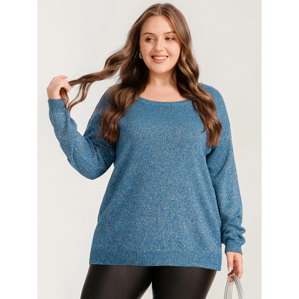 Plus Size Solid Pointelle Knit Round Neck Glitter Heather Knit Top Aegean Women Casual Long Sleeve Round Neck Dailywear Pullovers BloomChic 12/L