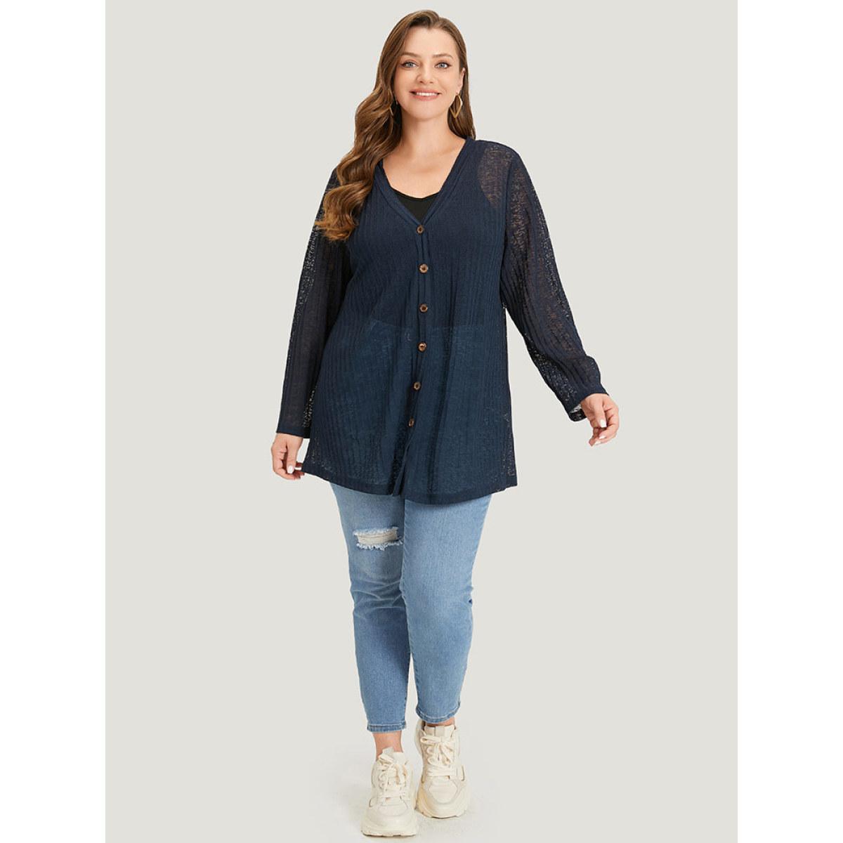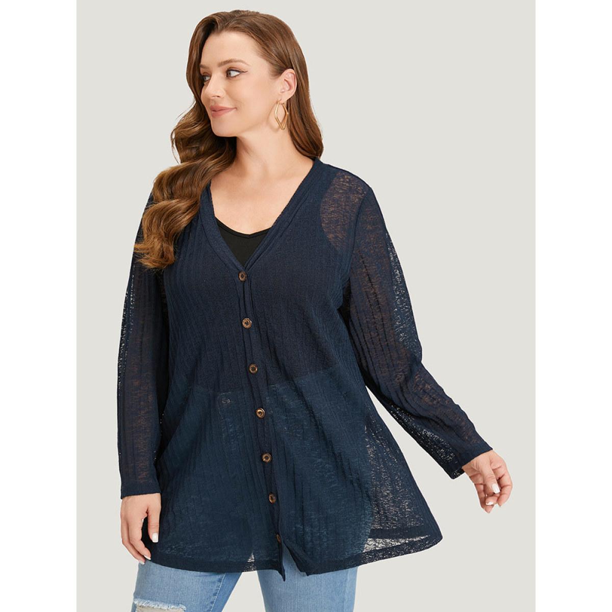 Plus Size Solid Rib Knit Button Through Mesh Kimono Women DarkBlue Casual See through Dailywear Kimonos BloomChic 14-16/1X Product Image