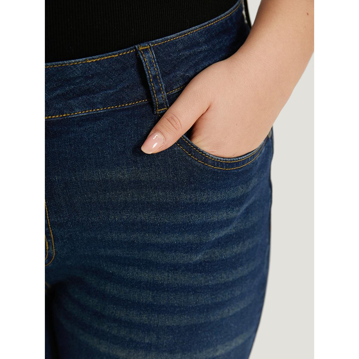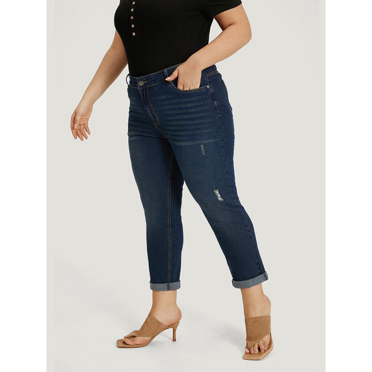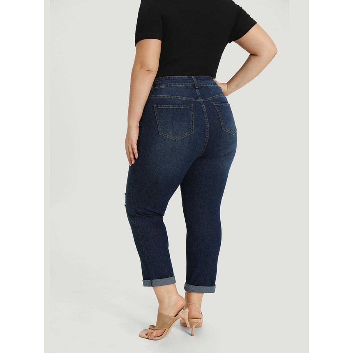 Plus Size Solid Ripped Roll Hem Pocket Straight Leg Jeans Women Indigo Casual Plain Plain High stretch Pocket Jeans BloomChic 24/3X