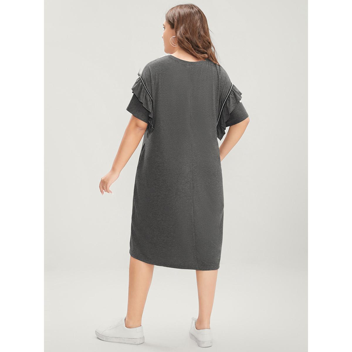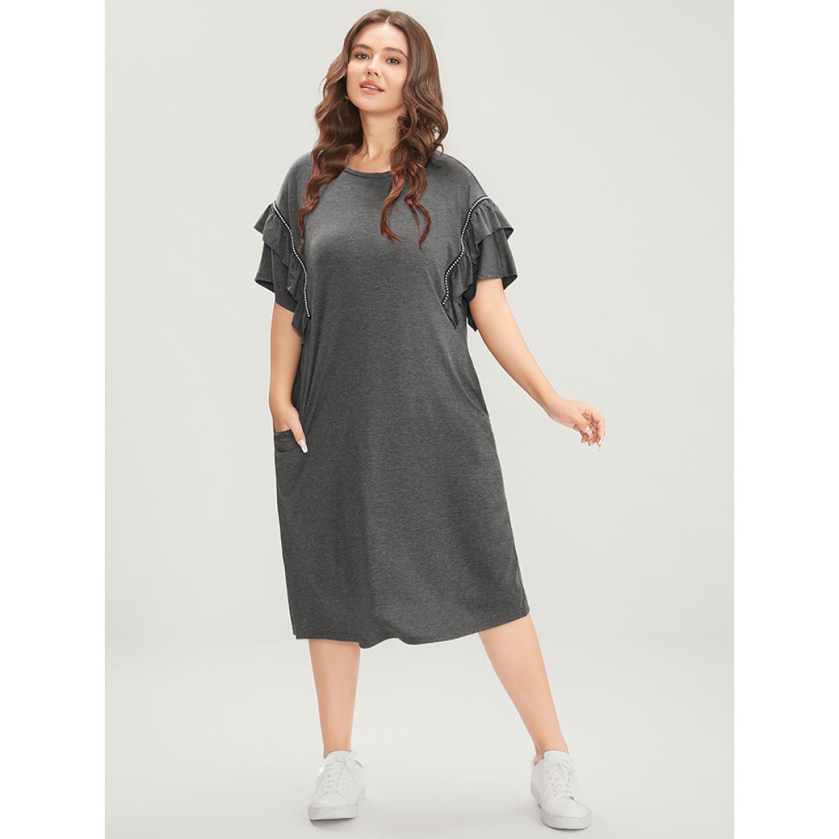 Plus Size Solid Round Neck Pocket Beaded Webbing Ruffle Trim Dress DimGray Women Casual Gathered Round Neck Short sleeve Curvy Midi Dress BloomChic 14-16/1X