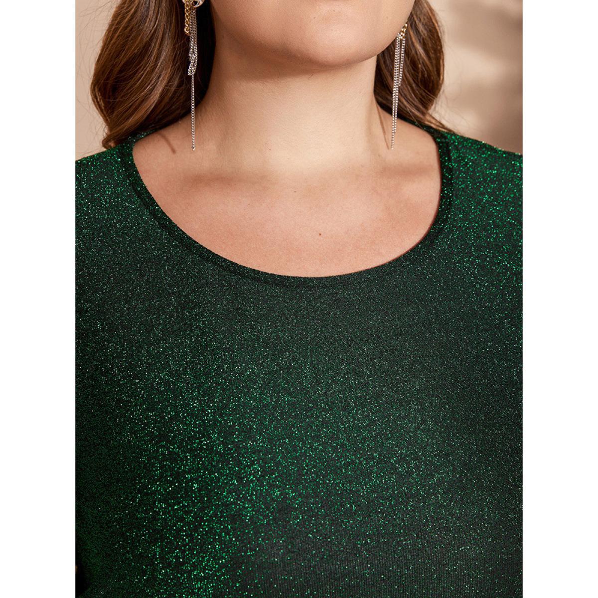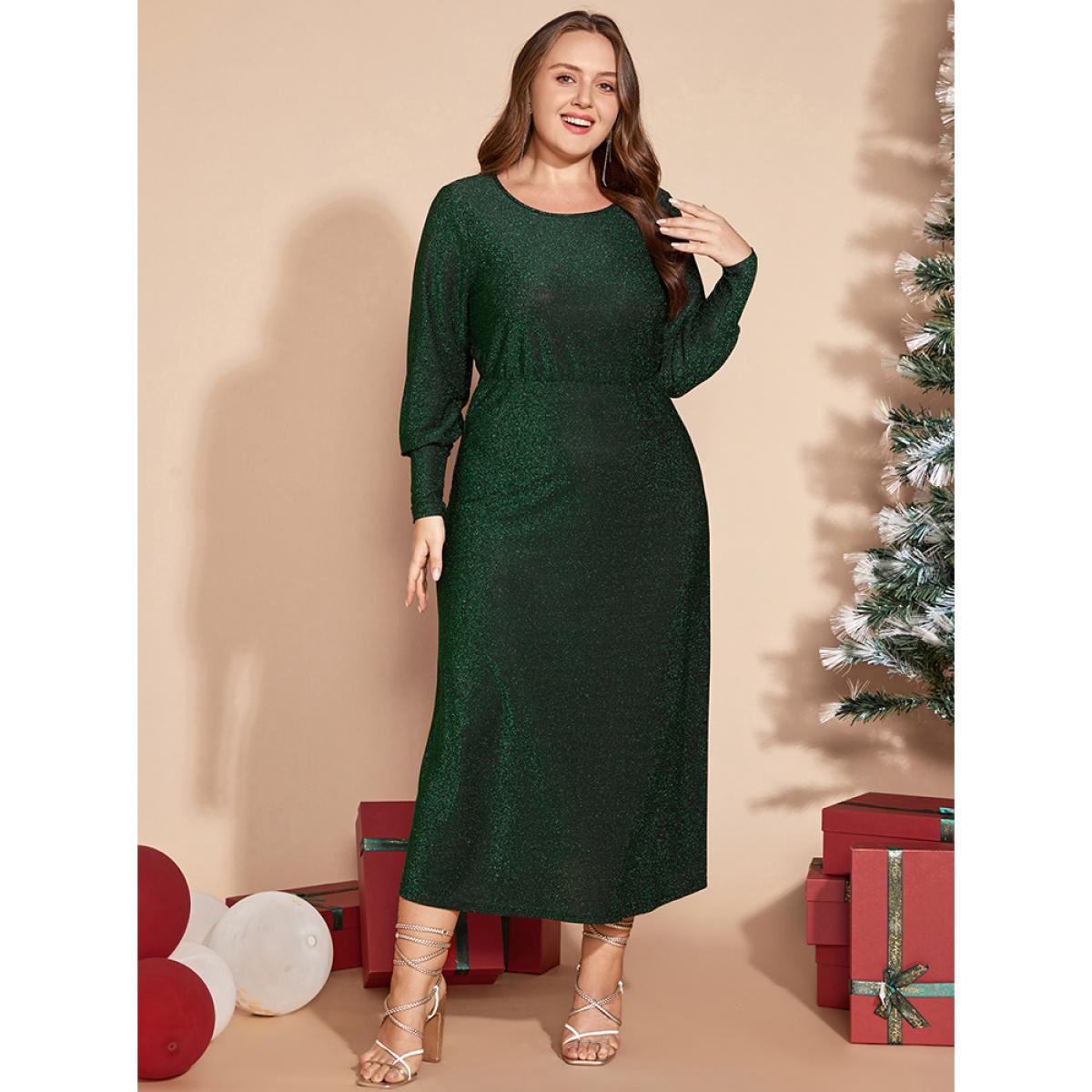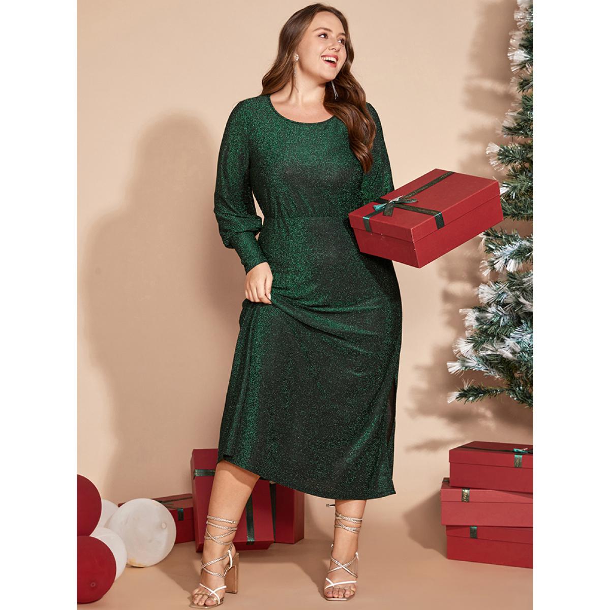 Plus Size Solid Round Neck Split Hem Glitter Dress Emerald Women Party Arc Hem Round Neck Long Sleeve Curvy Midi Dress BloomChic 22-24/3X