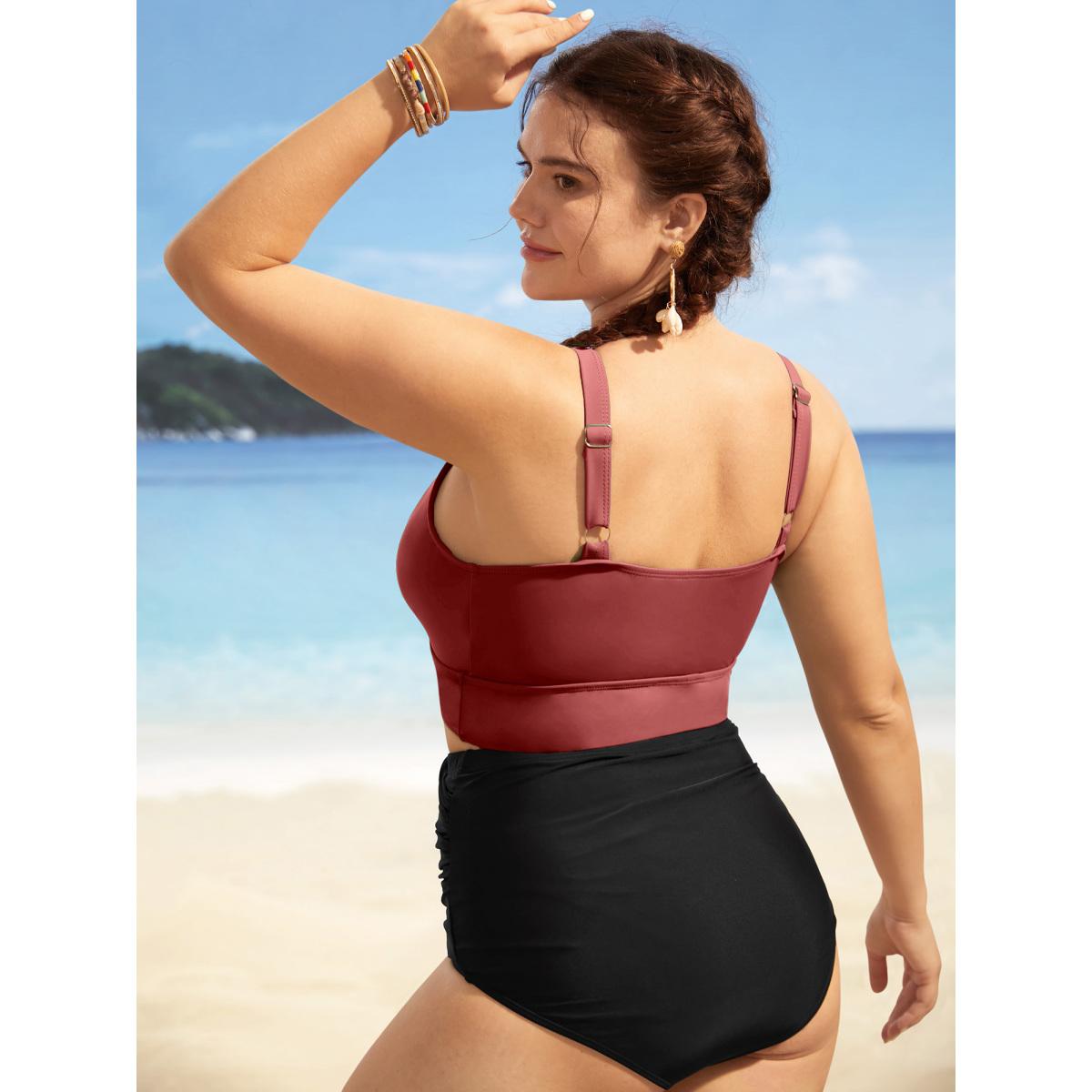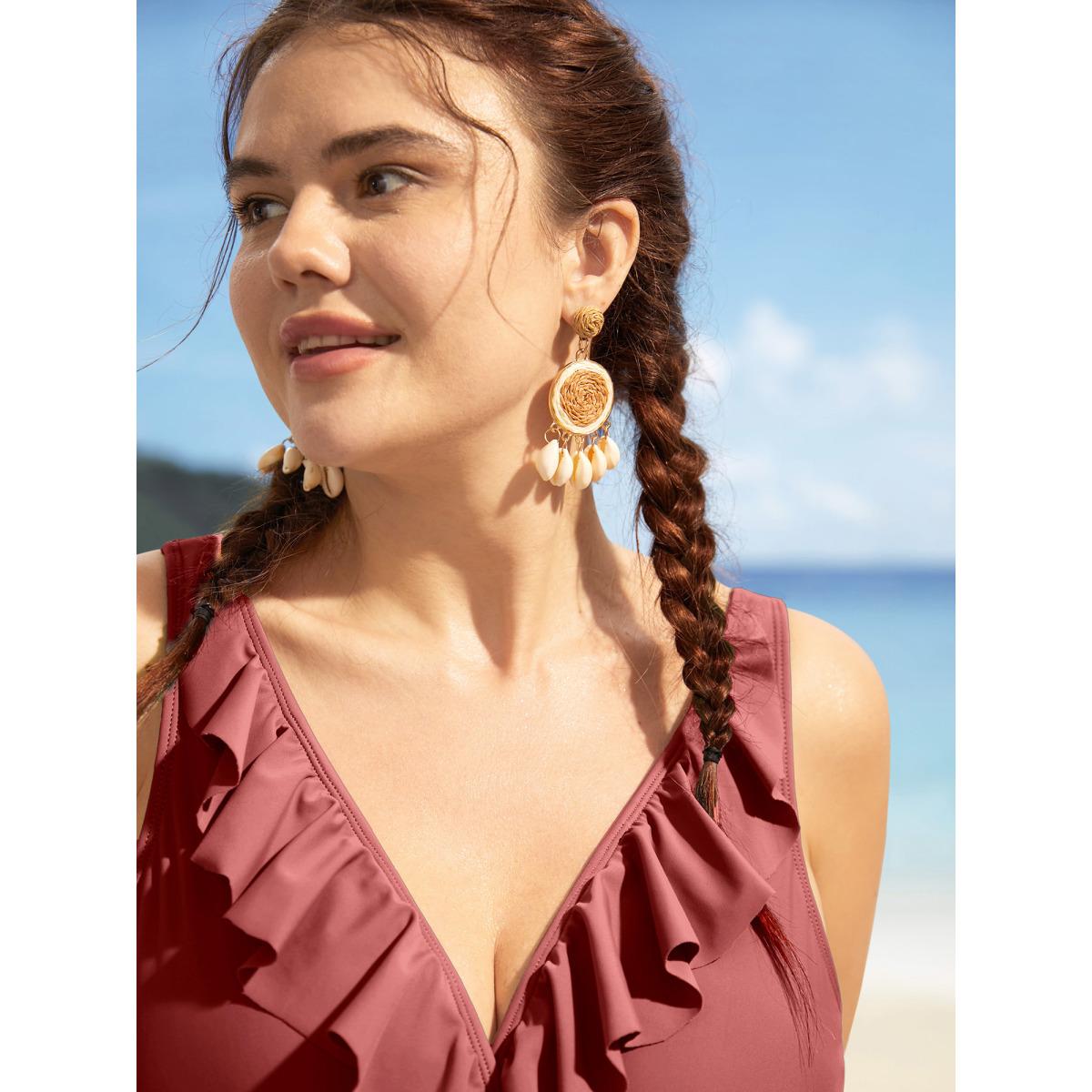 Plus Size Solid Ruffle Surplice Neck Trim Swim Top Women's Swimwear Russet Resort Ruffles High stretch Skinny Overlap Collar Curve Swim Tops BloomChic 18-20/2X