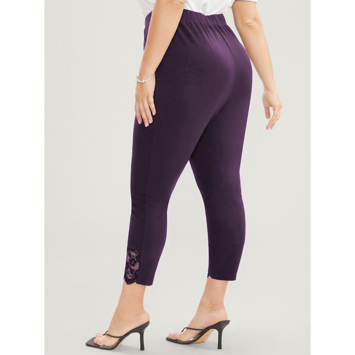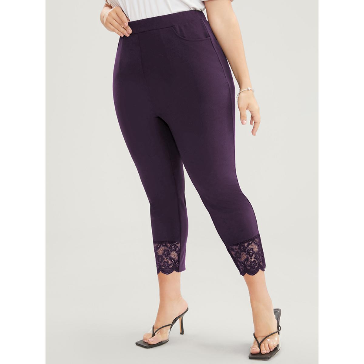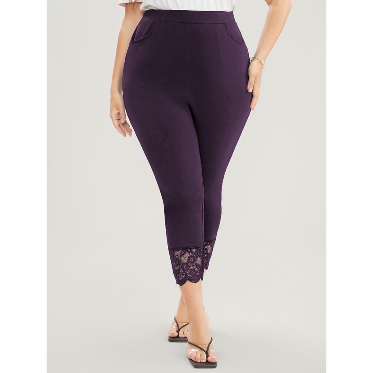 Plus Size Solid Scalloped Trim Elastic Waist Pocket Lace Hem Pants Women Eggplant Elegant Bodycon High Rise Everyday Pants BloomChic 22-24/3X