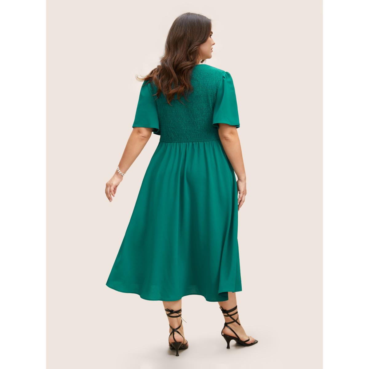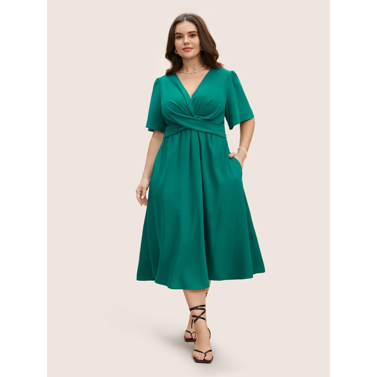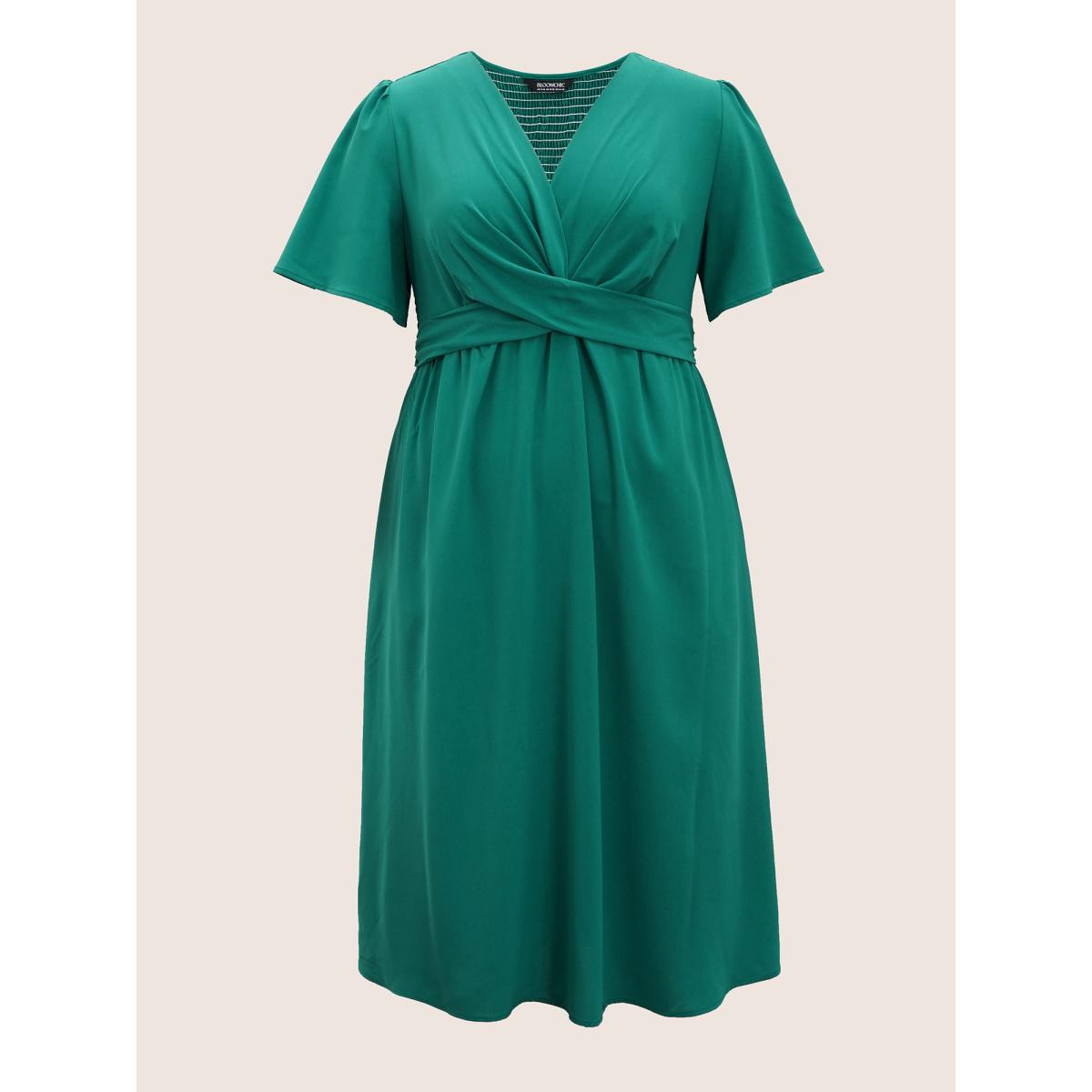 Plus Size Solid Shirred Crossover Flutter Sleeve Dress Emerald Women Elegant Twist V-neck Short sleeve Curvy BloomChic 14-16/1X