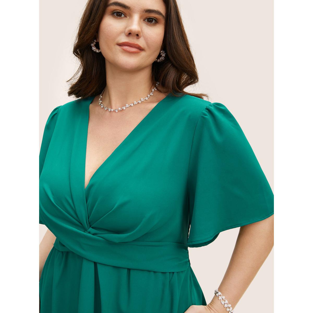 Plus Size Solid Shirred Crossover Flutter Sleeve Dress Emerald Women Elegant Twist V-neck Short sleeve Curvy BloomChic 14-16/1X Product Image
