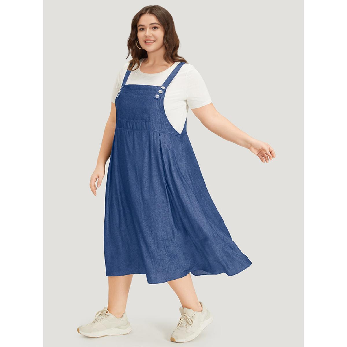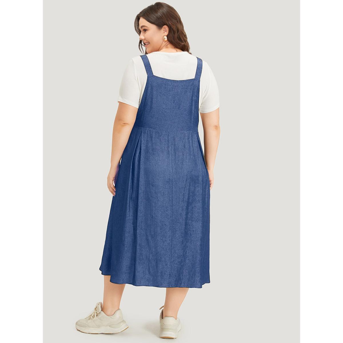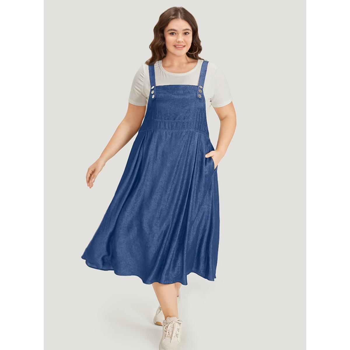 Plus Size Solid Sleeveless Gathered Pocket Overall Midi Dress Blue Women Casual Adjustable Straps Spaghetti Strap Sleeveless Curvy Midi Dress BloomChic 14-16/1X
