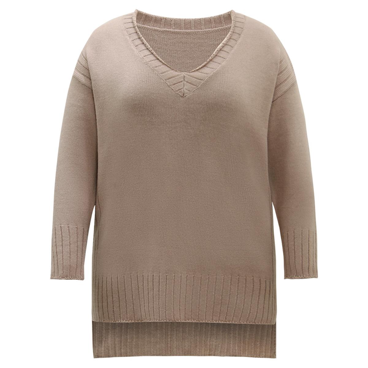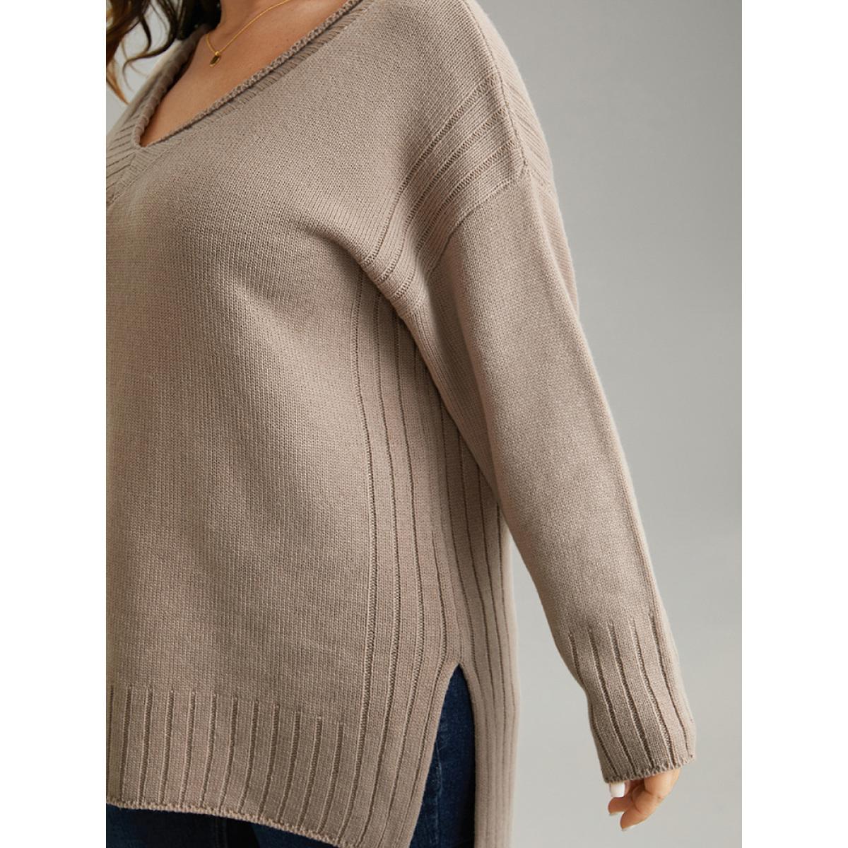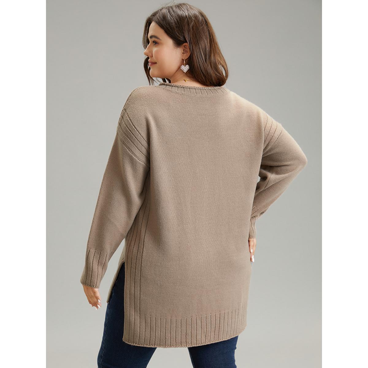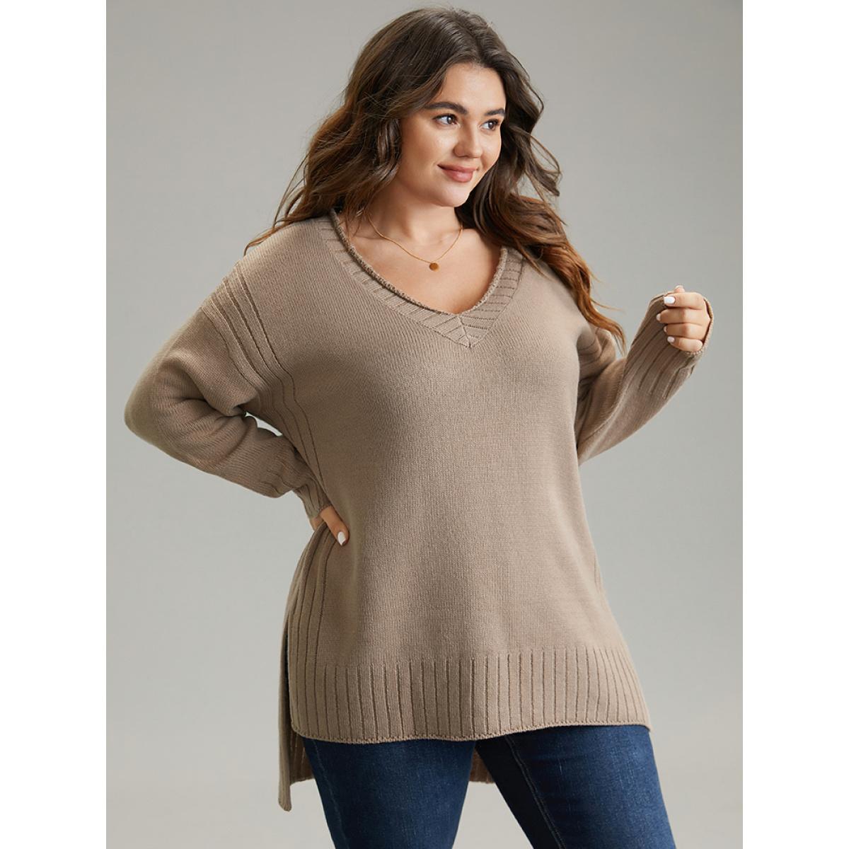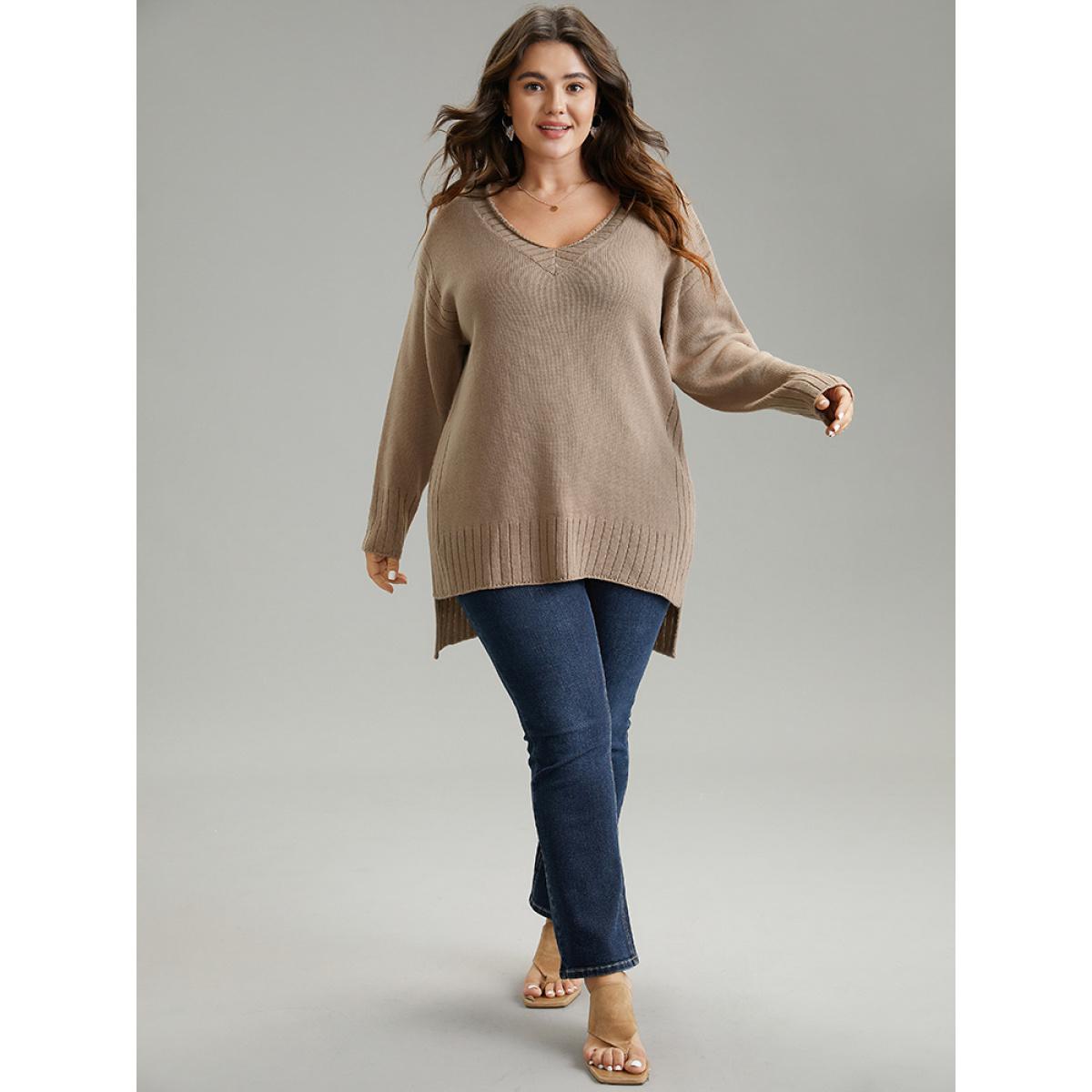 Plus Size Solid Split Side High Low Hem Pullover Tan Women Casual Loose Long Sleeve V-neck Dailywear Pullovers BloomChic 26/4X