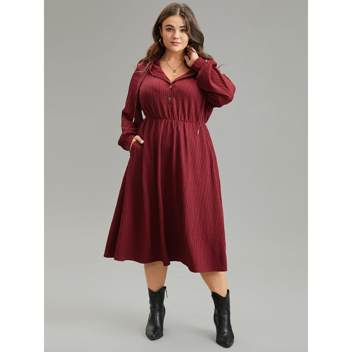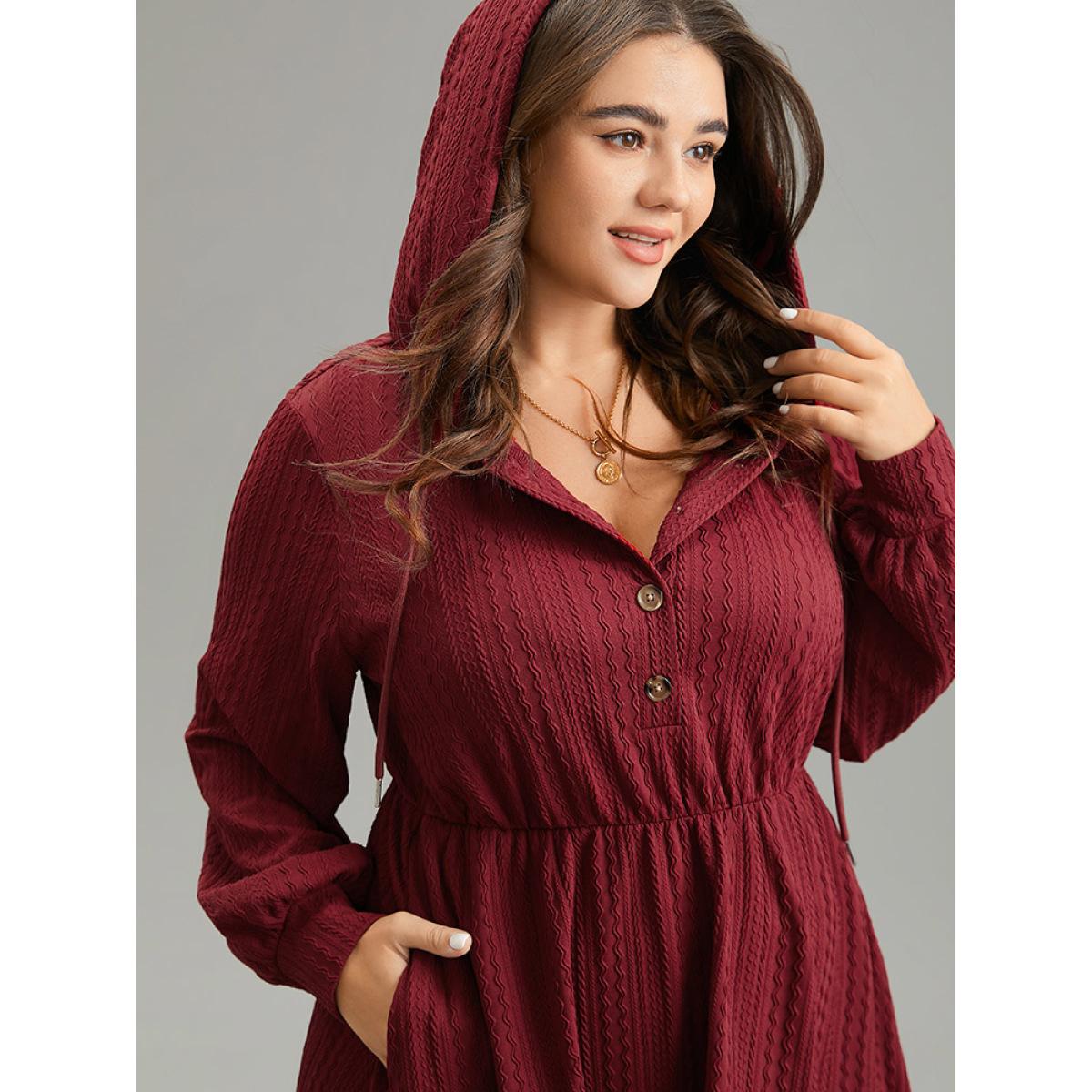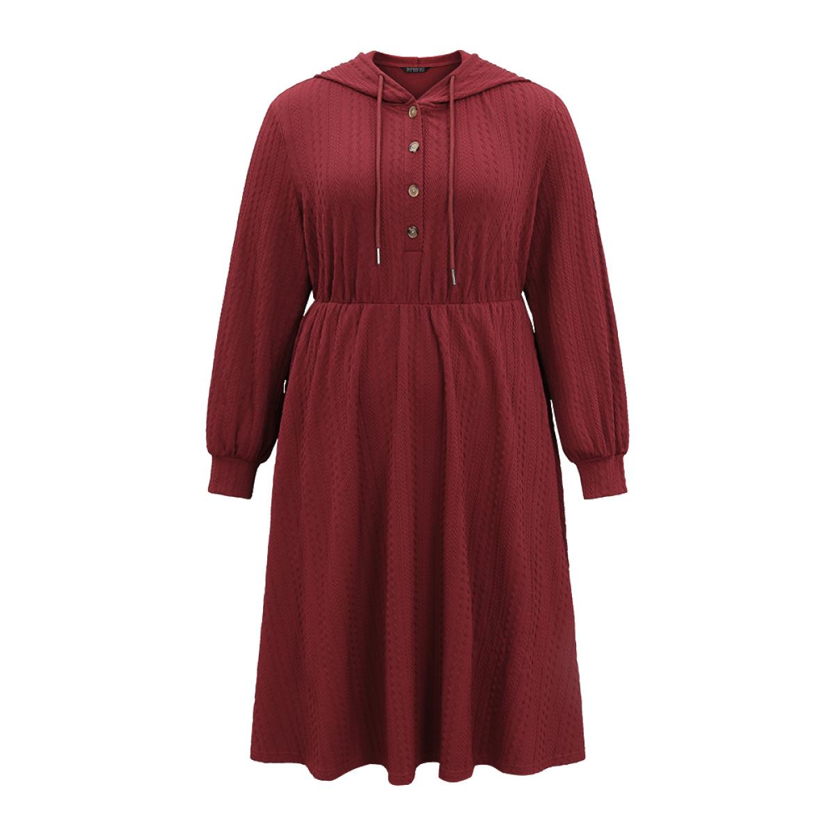 Plus Size Solid Textured Hooded Button Up Dress Scarlet Women Casual Texture Hooded Long Sleeve Curvy Midi Dress BloomChic 26/4X