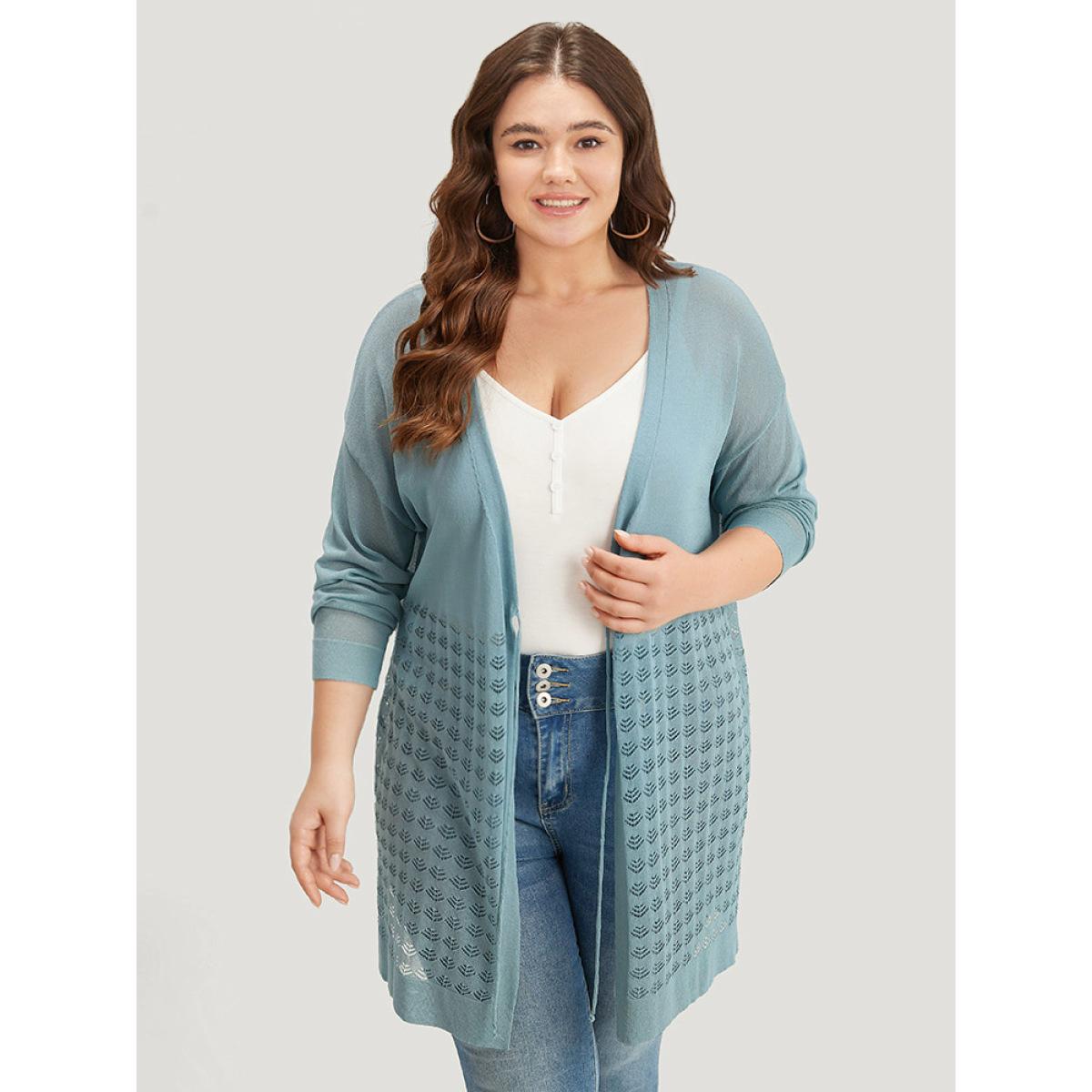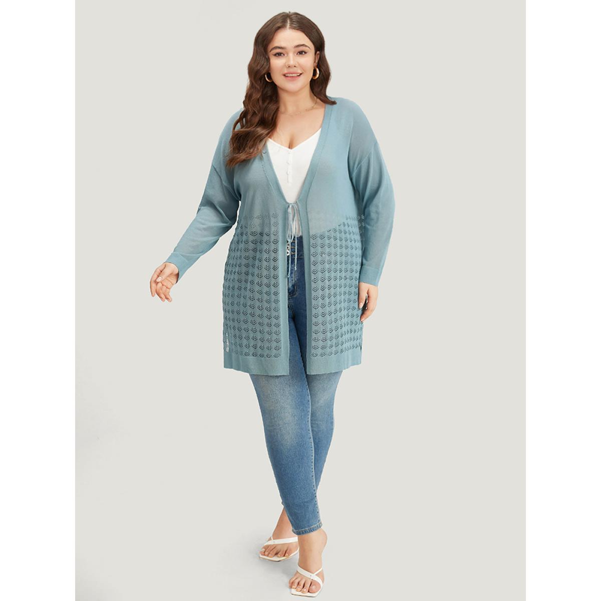 Plus Size Solid Ties Front Geo Eyelet Cardigan Mint Women Casual Loose Long Sleeve Everyday Cardigans BloomChic 12/L