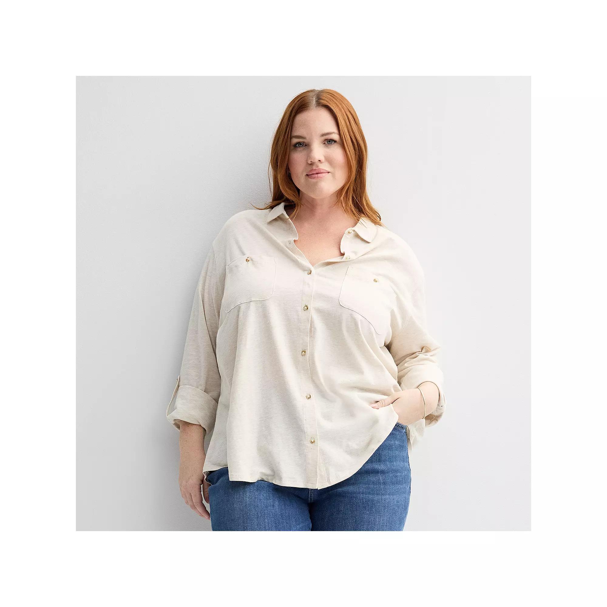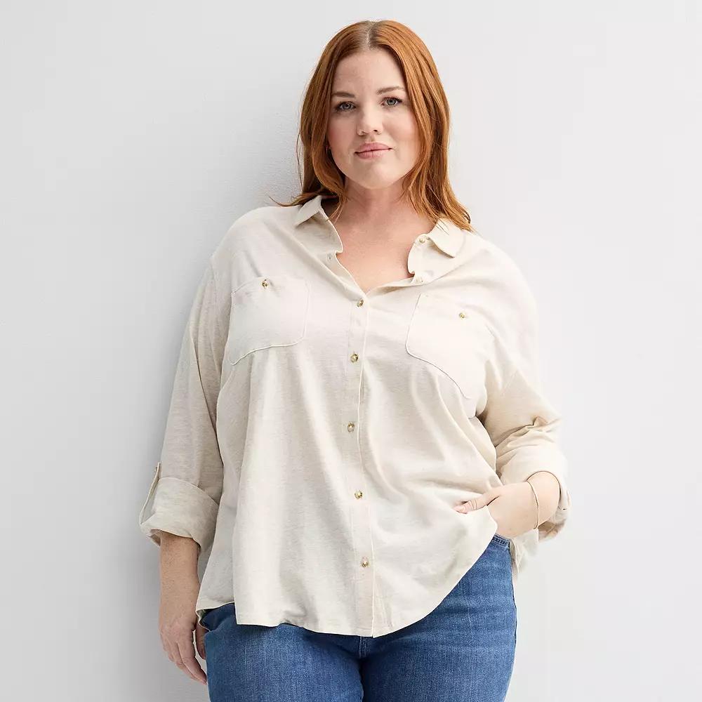 You'll love the style and comfort of this Plus Size Collared 3/4 Sleeve Button Down Shirt from Sonoma Goods For Life. Click on this WOMEN'S GUIDE to find the perfect fit and more!You'll love the style and comfort of this Plus Size Collared 3/4 Sleeve Button Down Shirt from Sonoma Goods For Life. Click on this WOMEN'S GUIDE to find the perfect fit and more!FEATURES Collared neckline Button closure 2 front pockets Set-in 3/4-length sleeves Sewn-rolled cuffs Shirttail hem Knit constructionFIT & SIZING Regular fit 30 1/2-in. length from shoulder to hemFABRIC & CARE Cotton, polyester Machine wash ImportedRESPONSIBLE Supports more sustainable cotton farming Size: 1X. Color: Oat Heather. Gender: female. Age Group: adult.