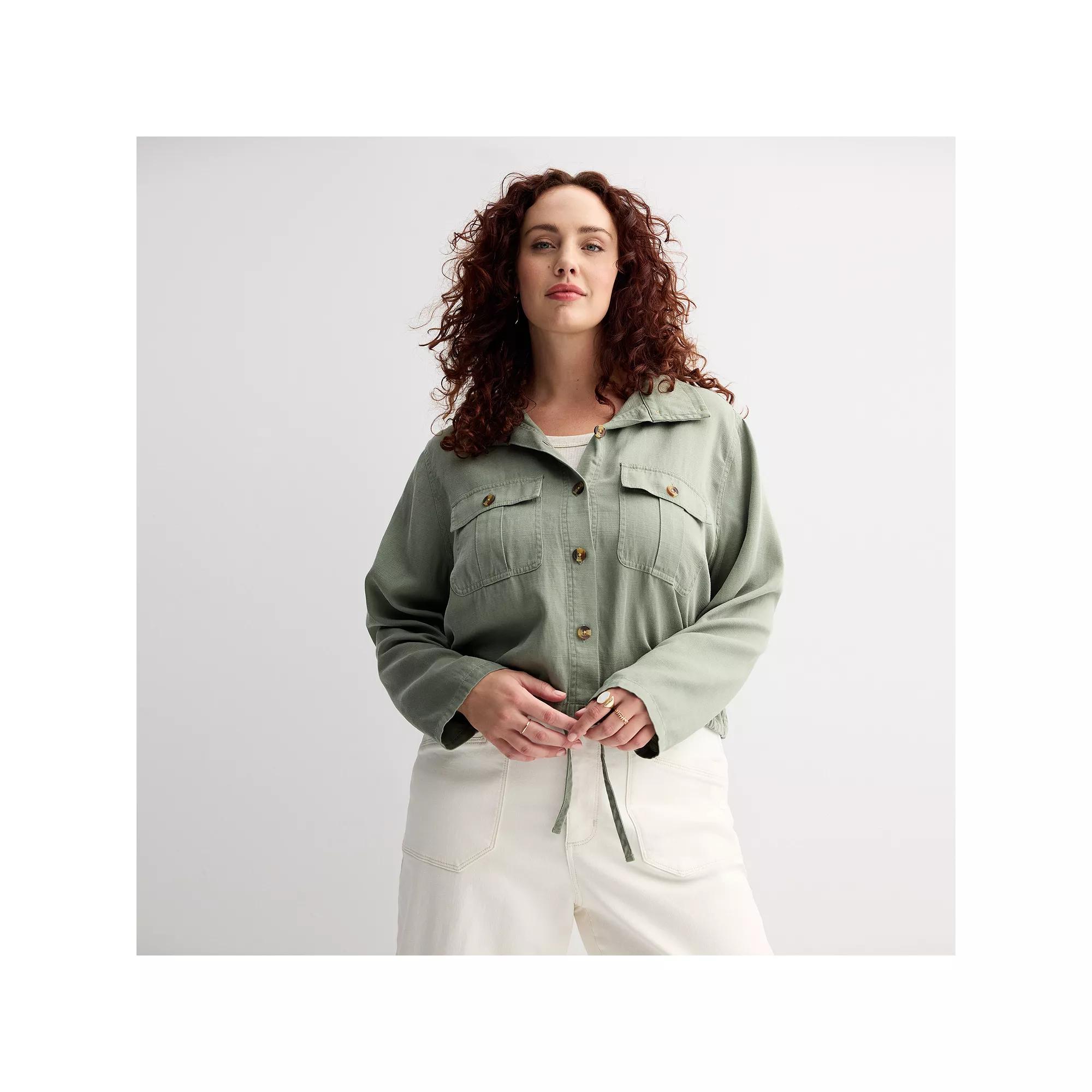 You'll love wearing this plus size Sonoma Goods For Life cropped summer button front jacket.Click on this WOMEN'S GUIDE to find the perfect fit and more!You'll love wearing this plus size Sonoma Goods For Life cropped summer button front jacket.Click on this WOMEN'S GUIDE to find the perfect fit and more!FEATURES 2 functional pockets at front Drawstring hem Button closure Long sleeves UnlinedFIT & SIZING Loose fit 22 1/2-in. length from shoulder to hemFABRIC & CARE Lyocell, rayon, linen Machine wash and tumble dry low Imported Size: 5X. Color: Madri Green. Gender: female. Age Group: adult.