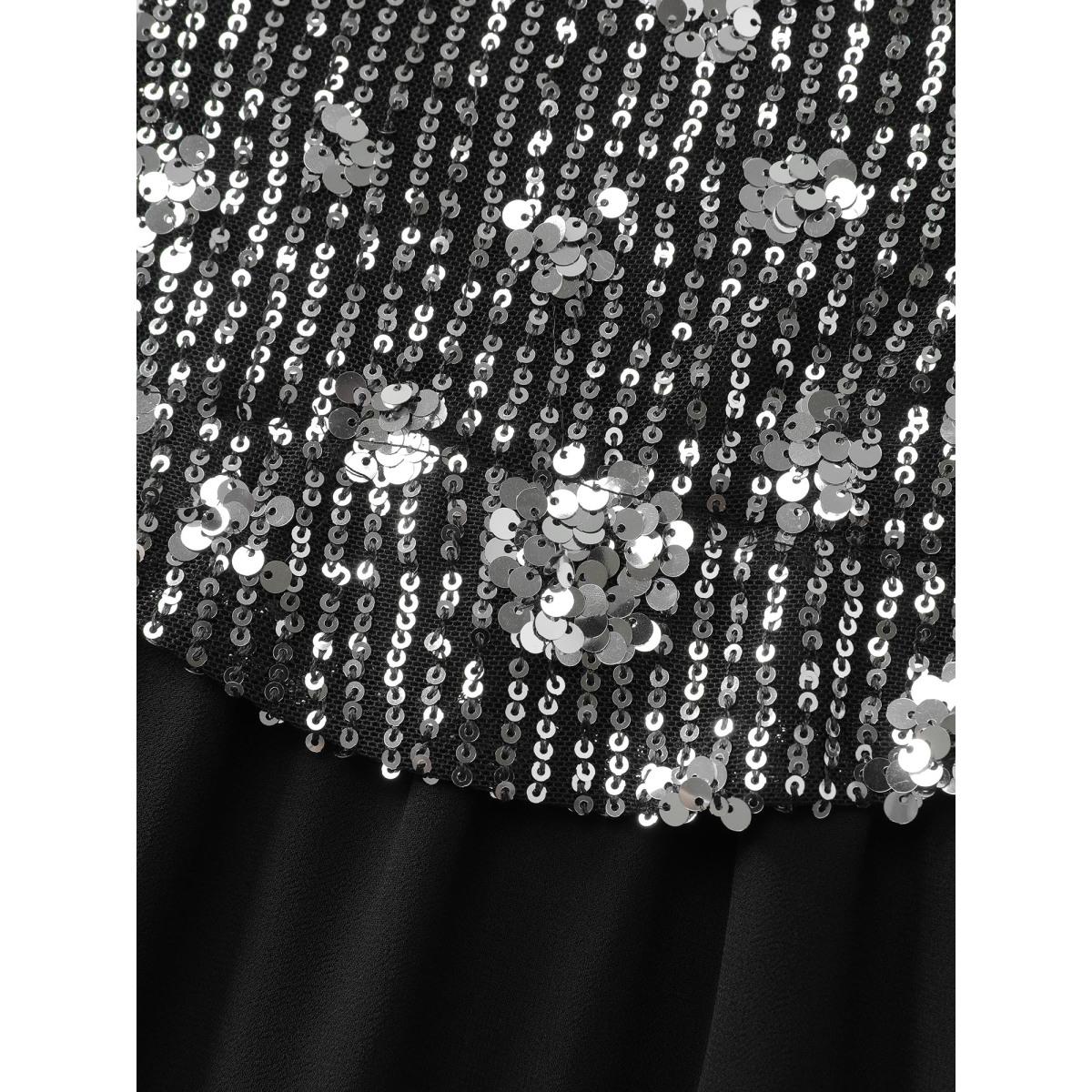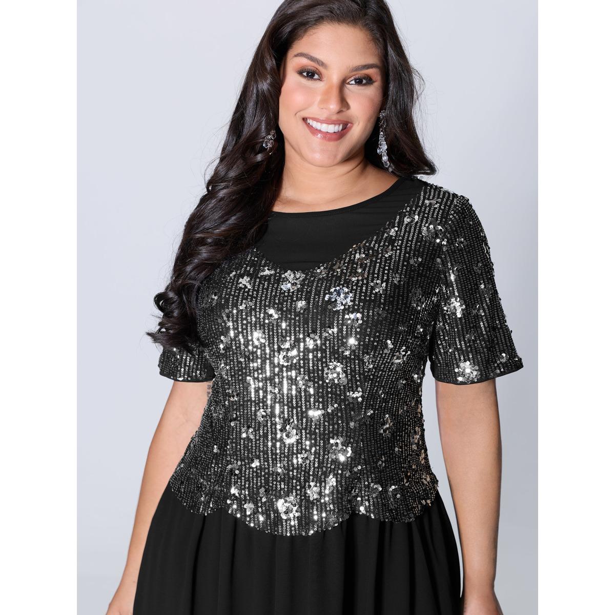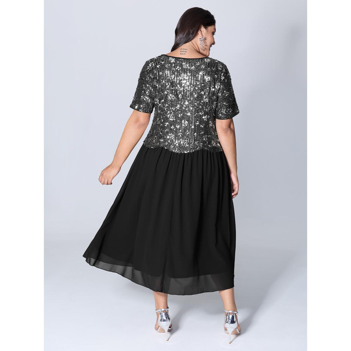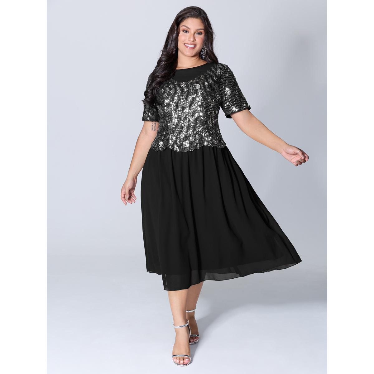 Plus Size Sparkly 2-In-1 Color Contrast Midi Dress Black Women Party&Cocktail Contrast Round Neck Short sleeve Curvy BloomChic 14-16/1X