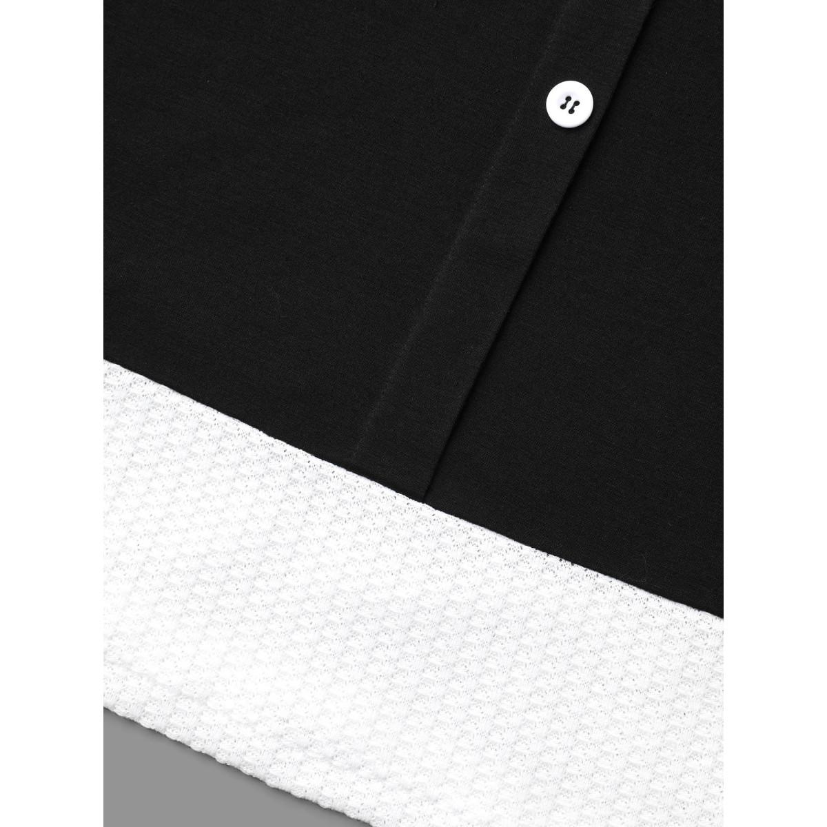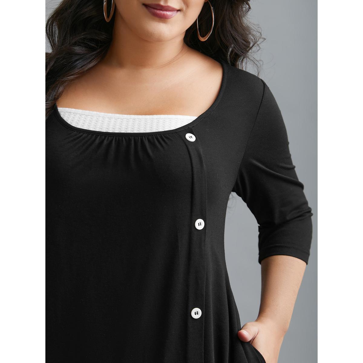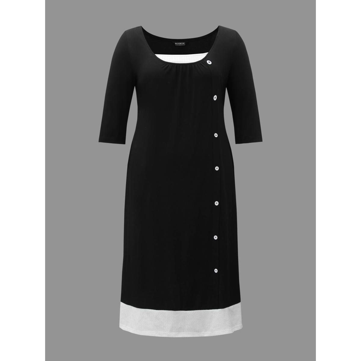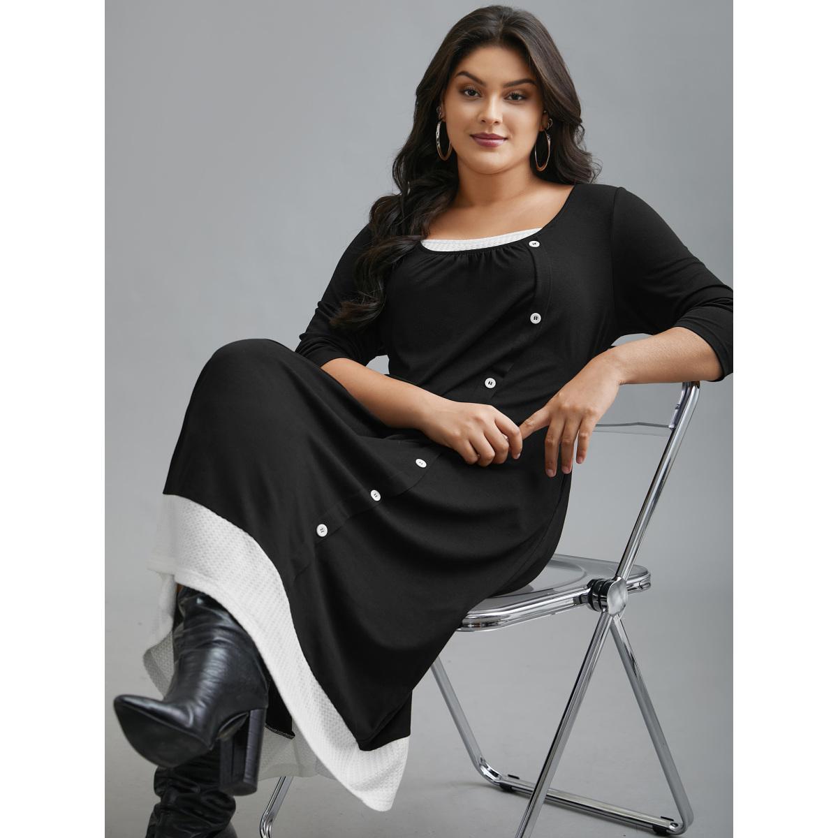 Plus Size Square Neck Color Block Button Detail Dress Black Women Elegant Gathered Knit Dresses Bloomchic 10/M