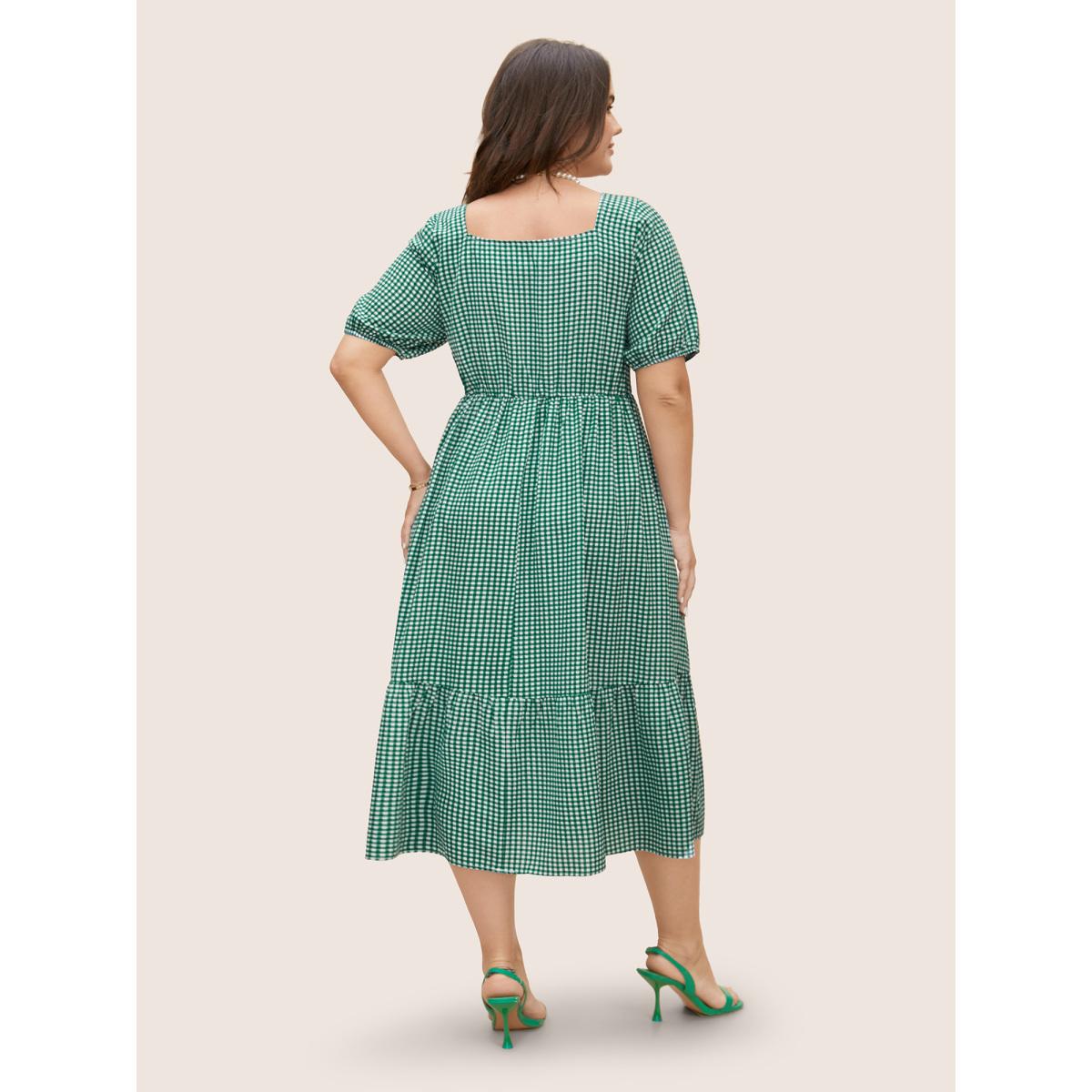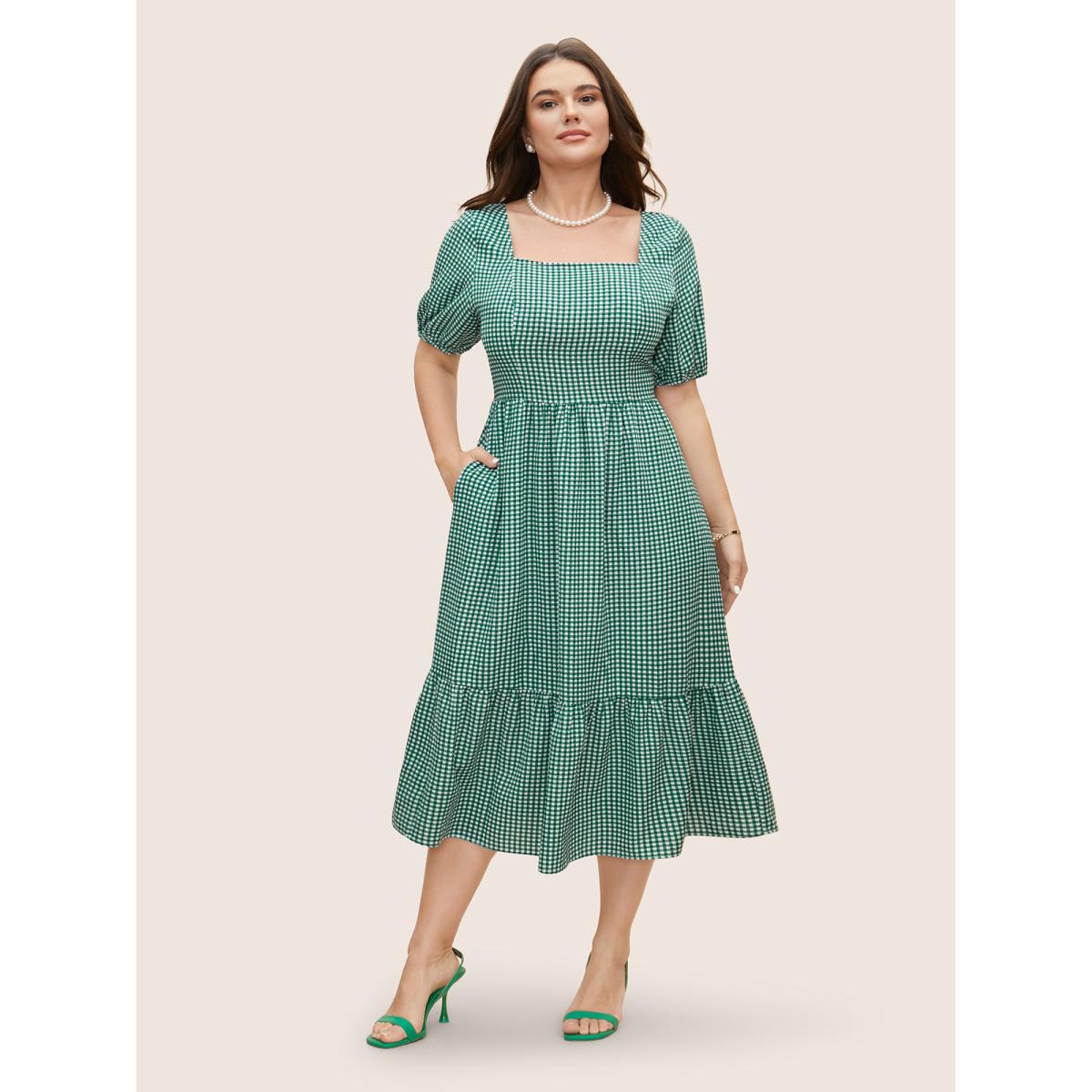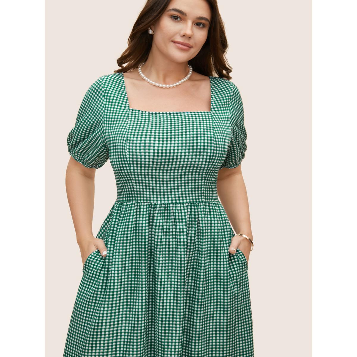 Plus Size Square Neck Gingham Elastic Waist Midi Dress Emerald Women Elegant Gathered Square Neck Half Sleeve Curvy BloomChic 28/5X