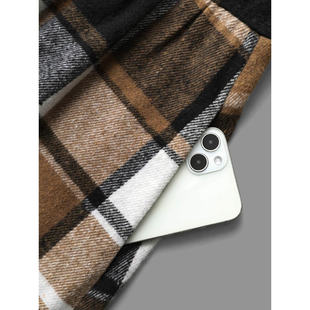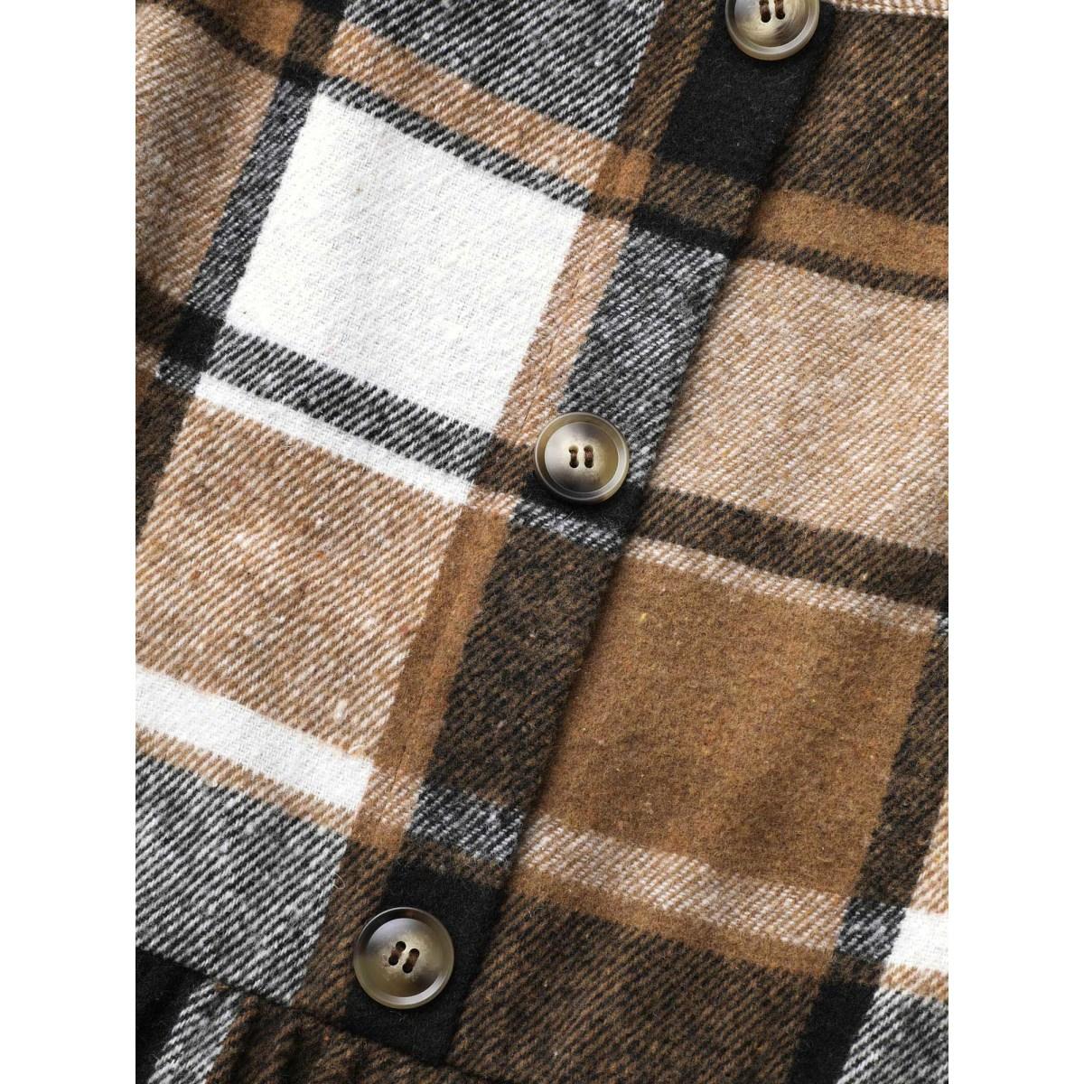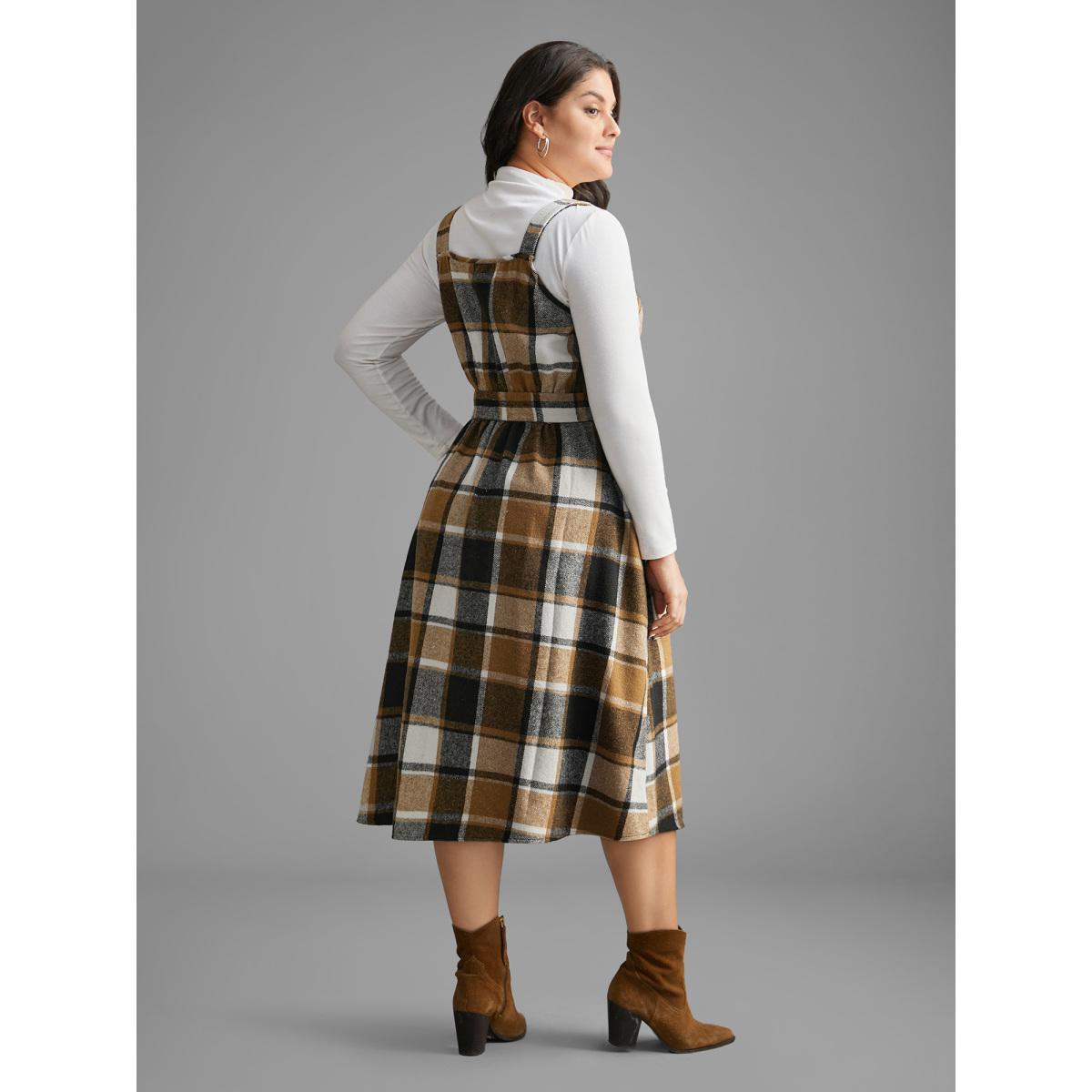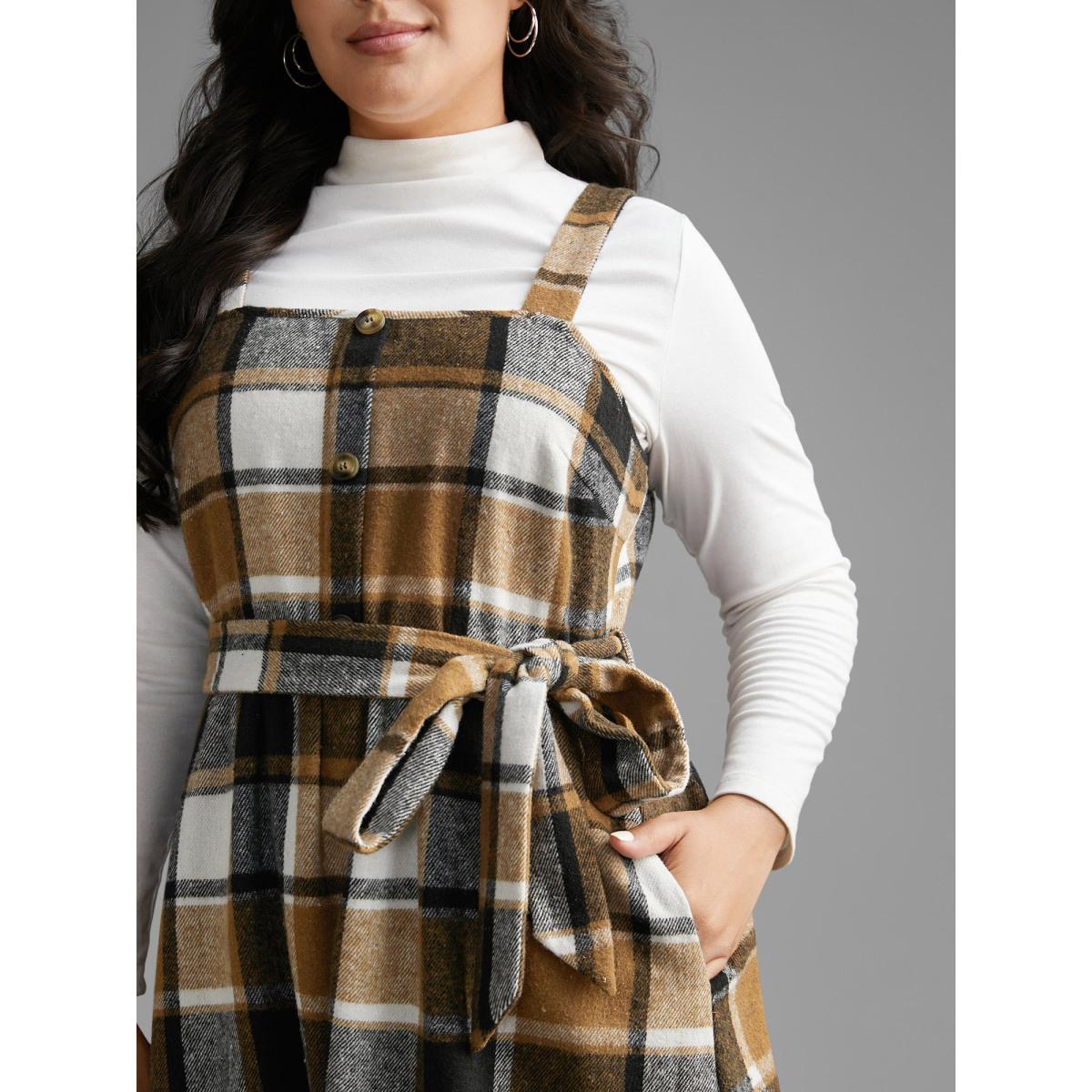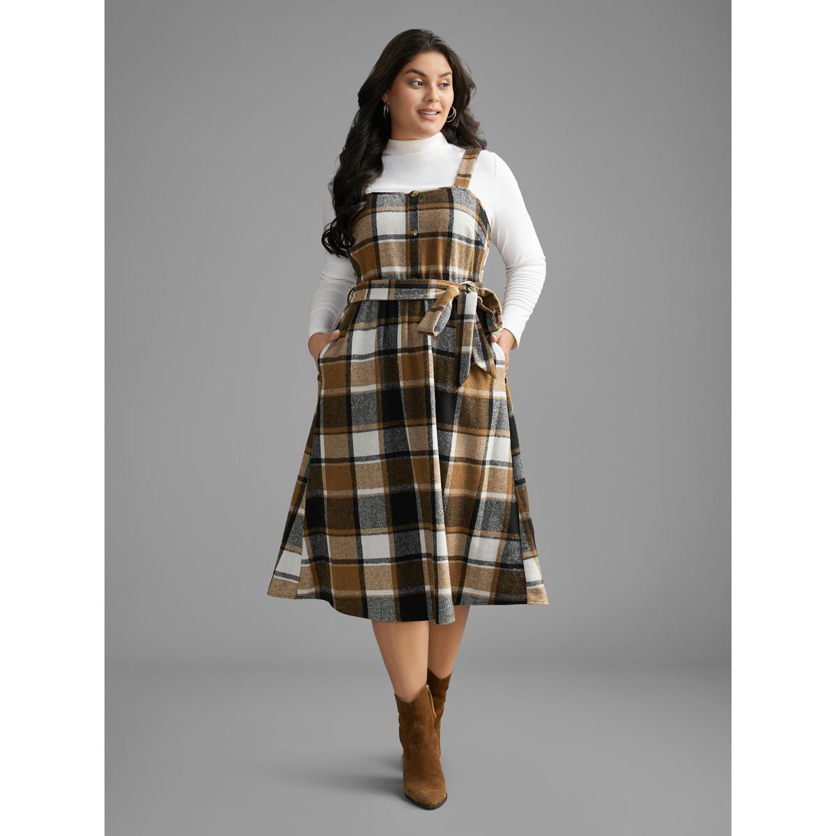 Plus Size Square Neck Plaid Button Detail Belted Dress Wheat Women Casual Belted Square Neck Sleeveless Curvy BloomChic 18-20/2X