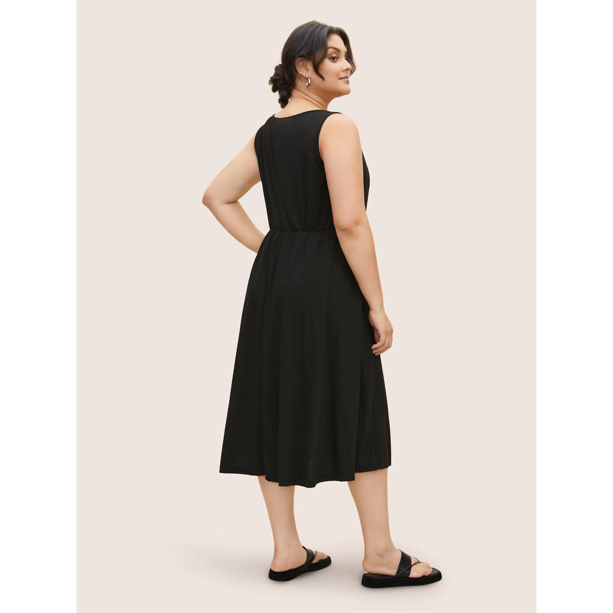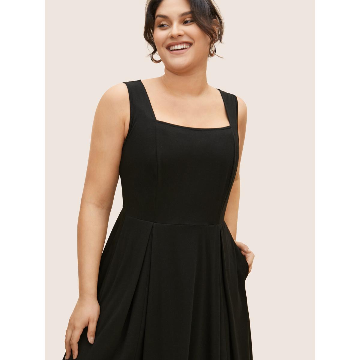 Plus Size Plain Pocket Drawstring Square Neck Tank Dress Black Women Casual Plain Square Neck Sleeveless Curvy Midi Dress BloomChic 22-24/3X