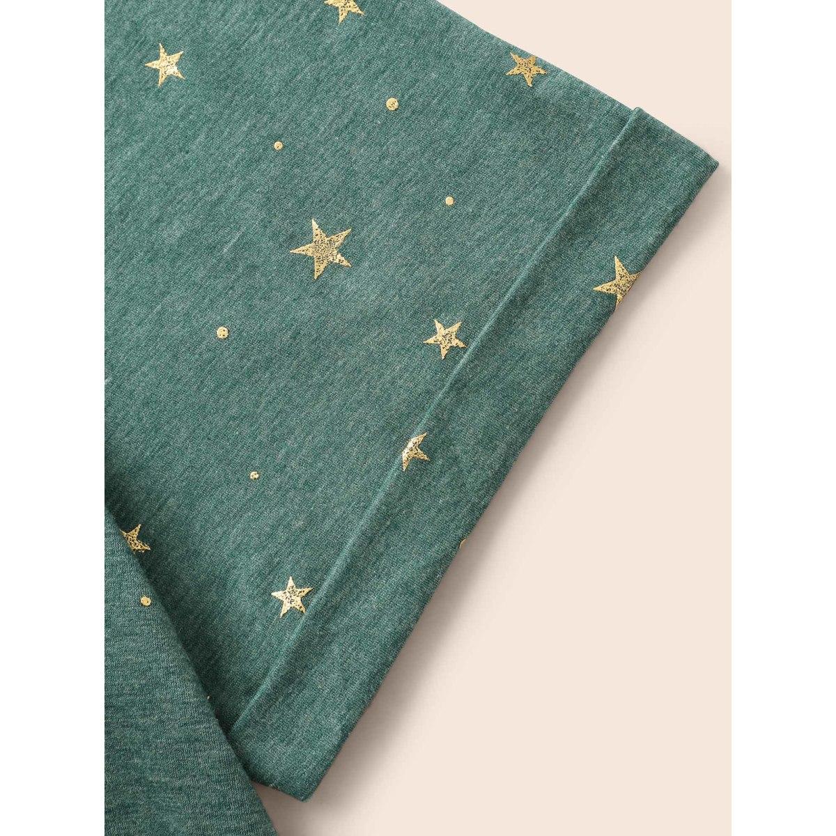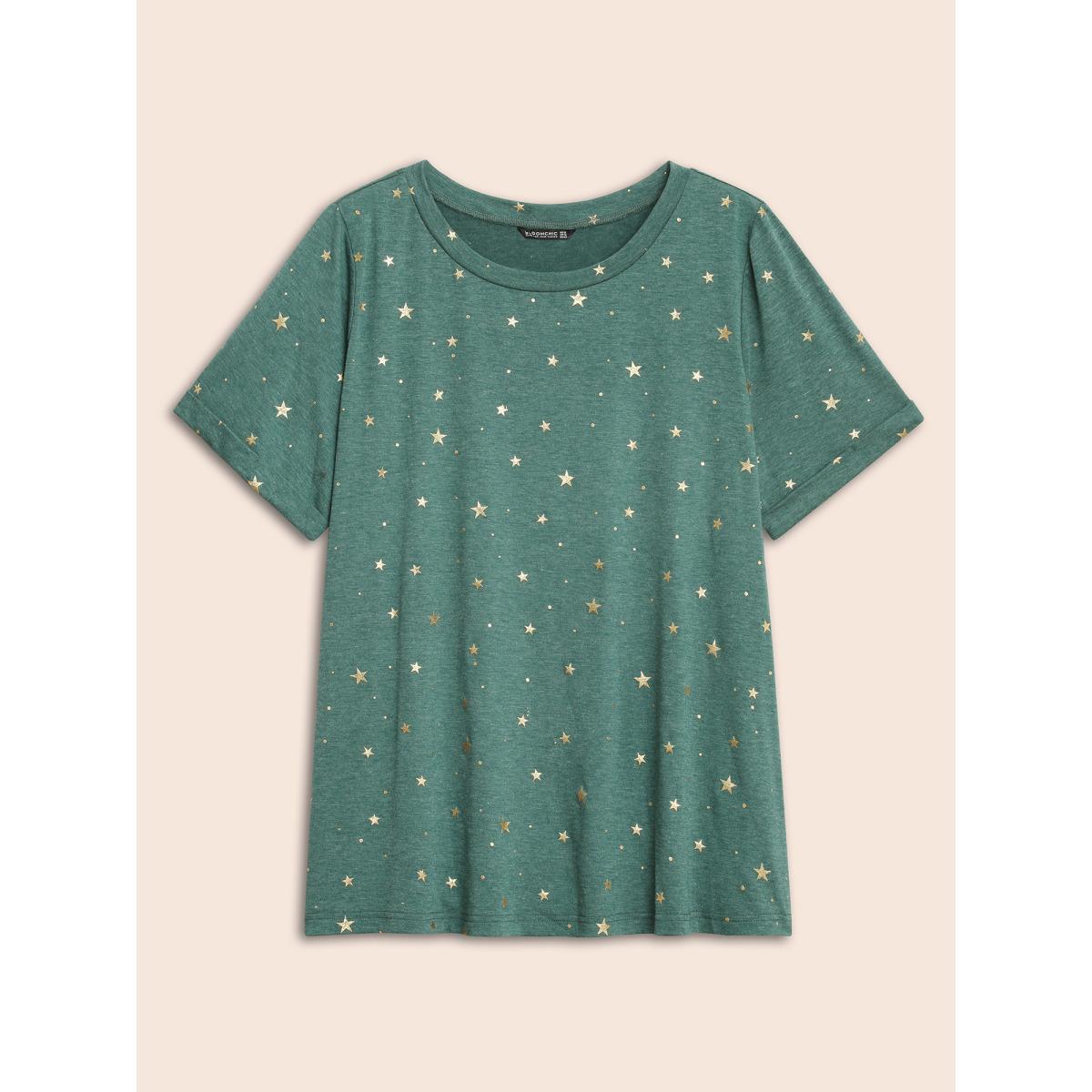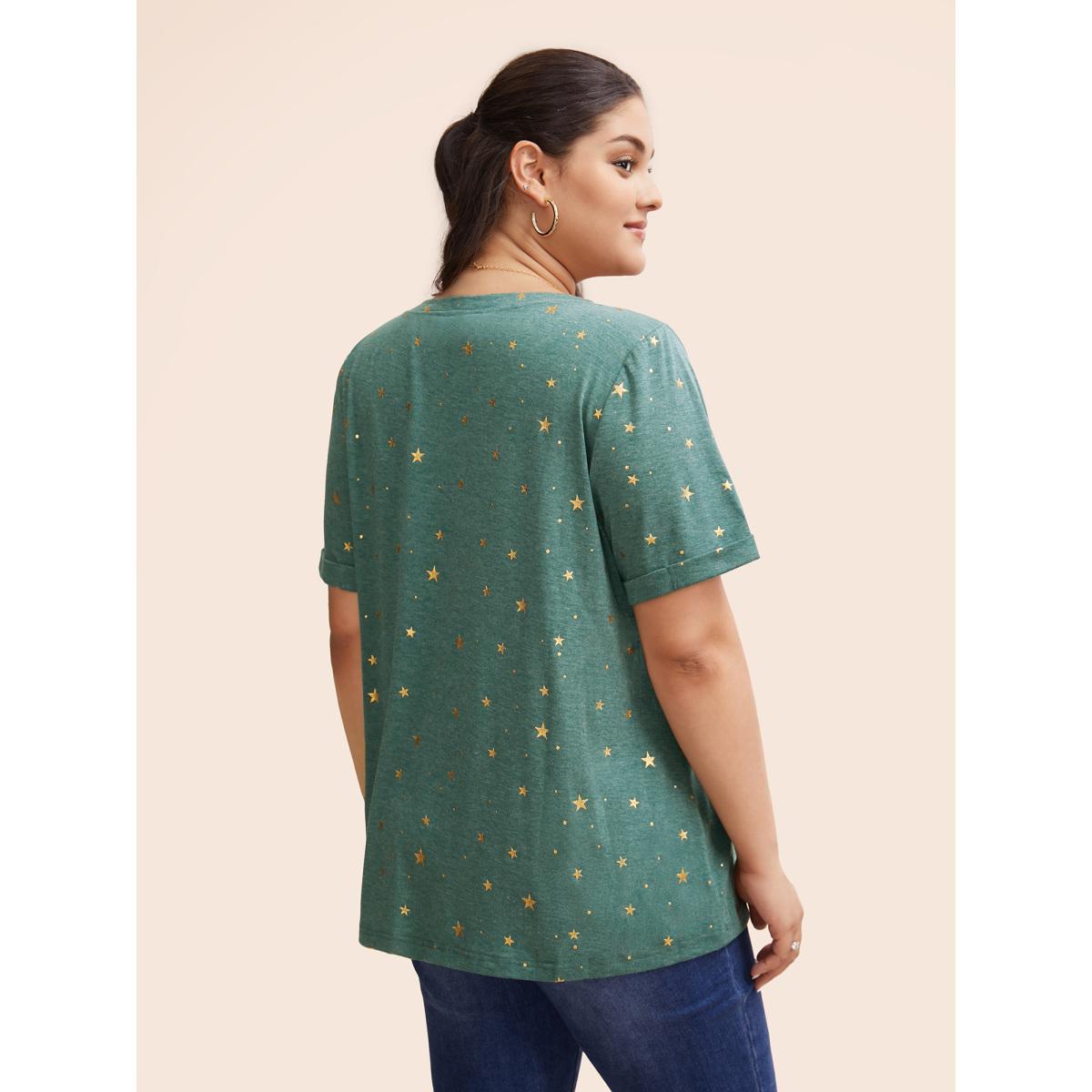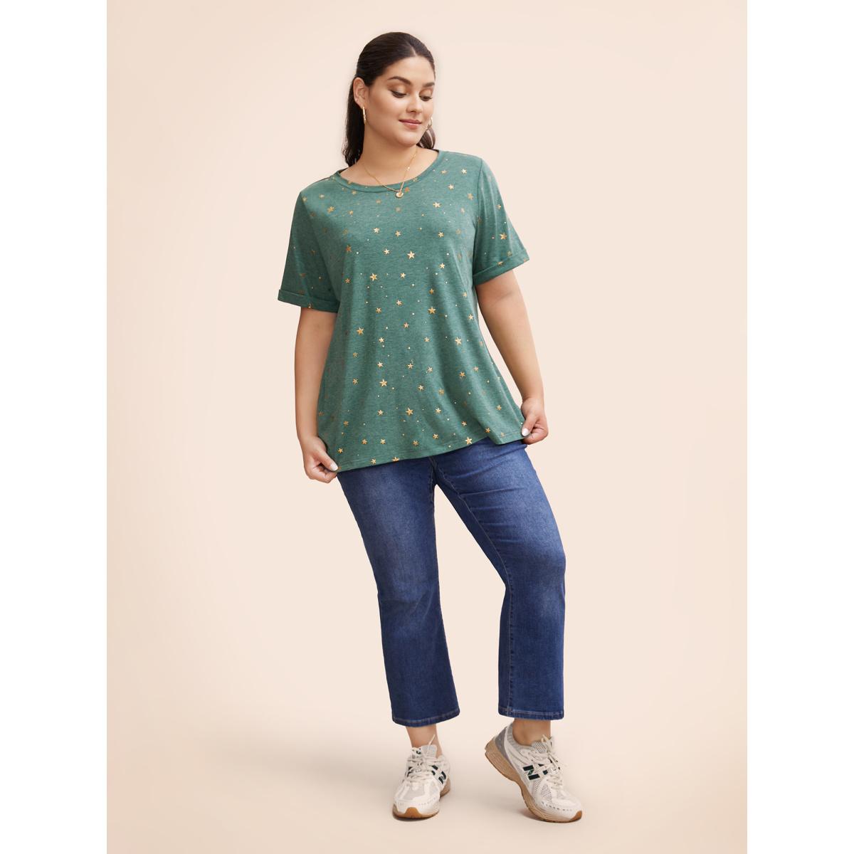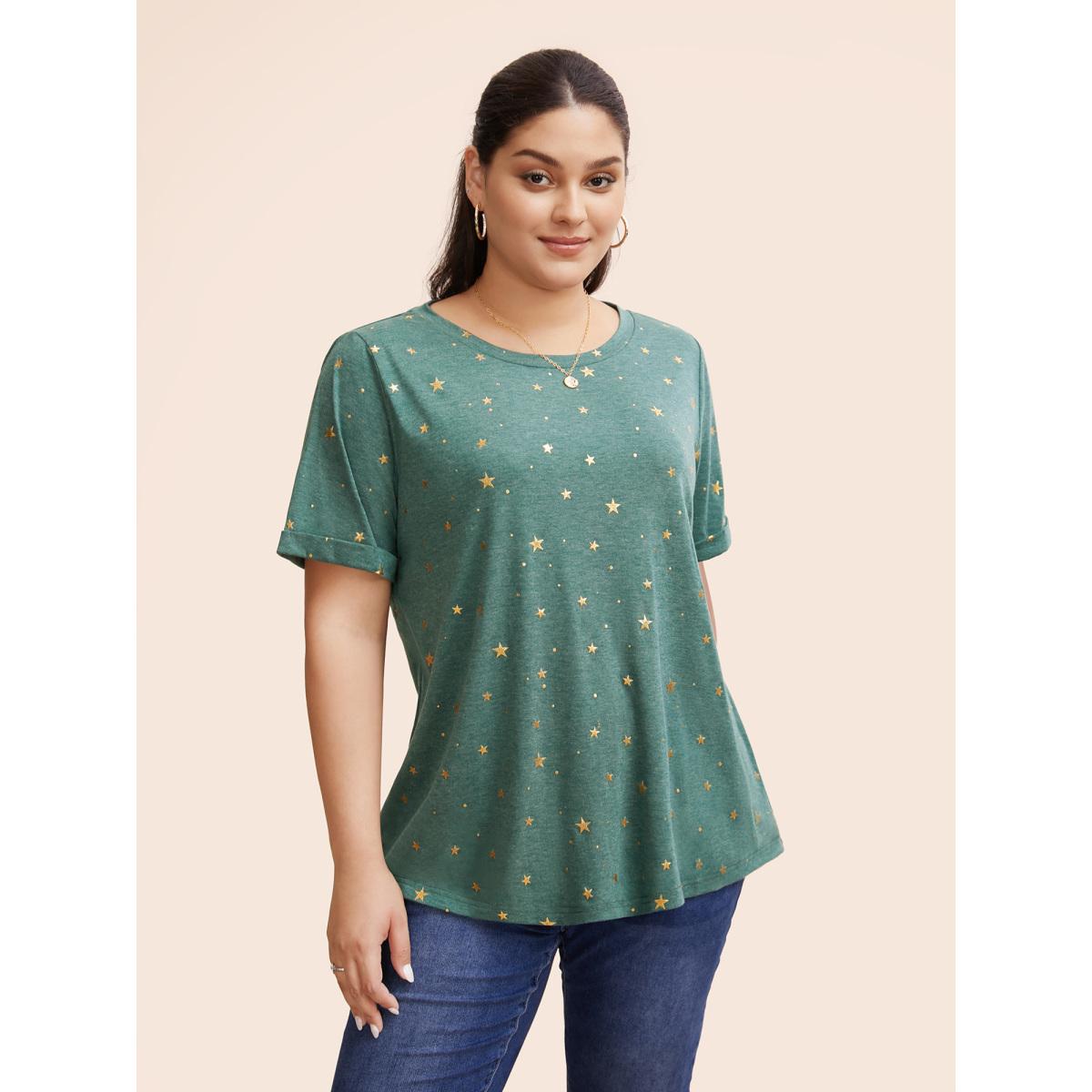 Plus Size Star Glitter Cuffed Sleeve Crew Neck T-shirt Cyan Women Casual Heather Moon and Star Round Neck Dailywear T-shirts BloomChic 12/L