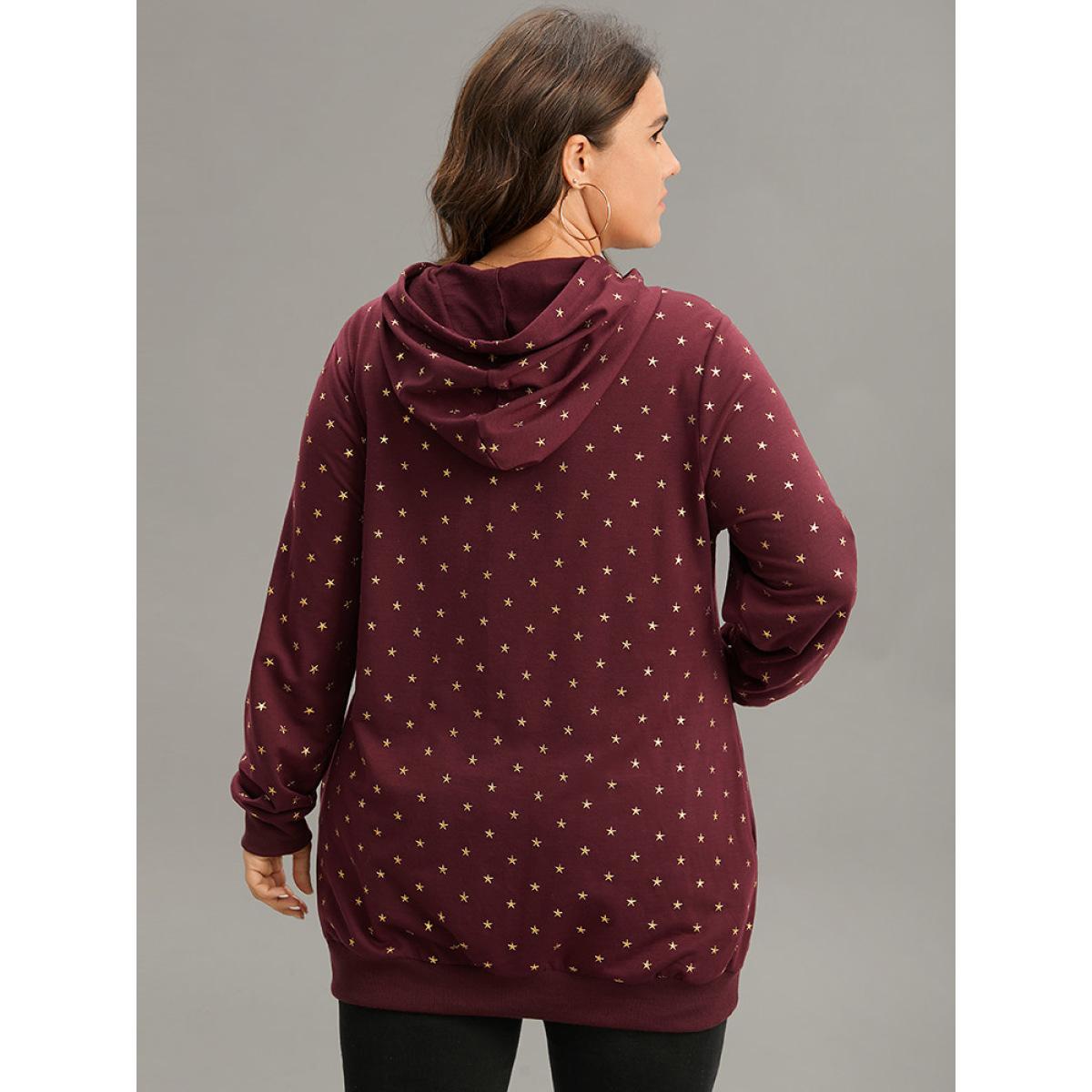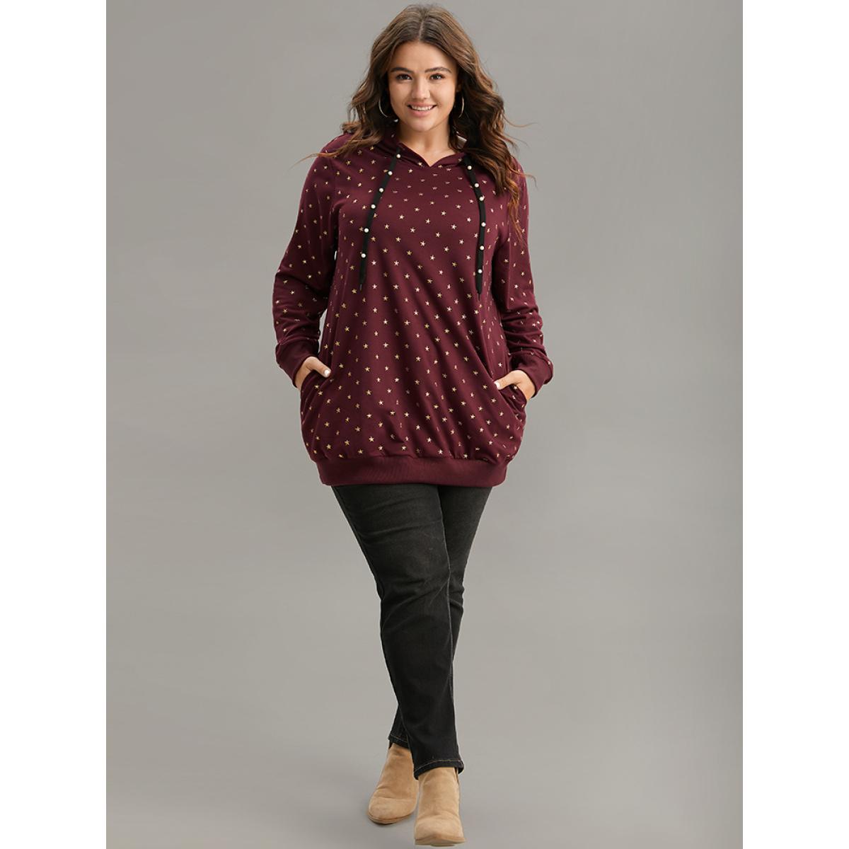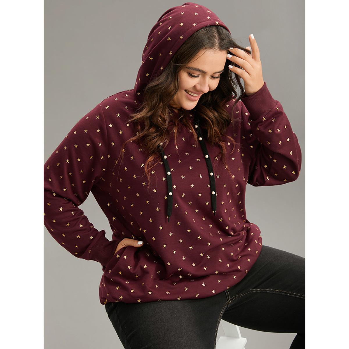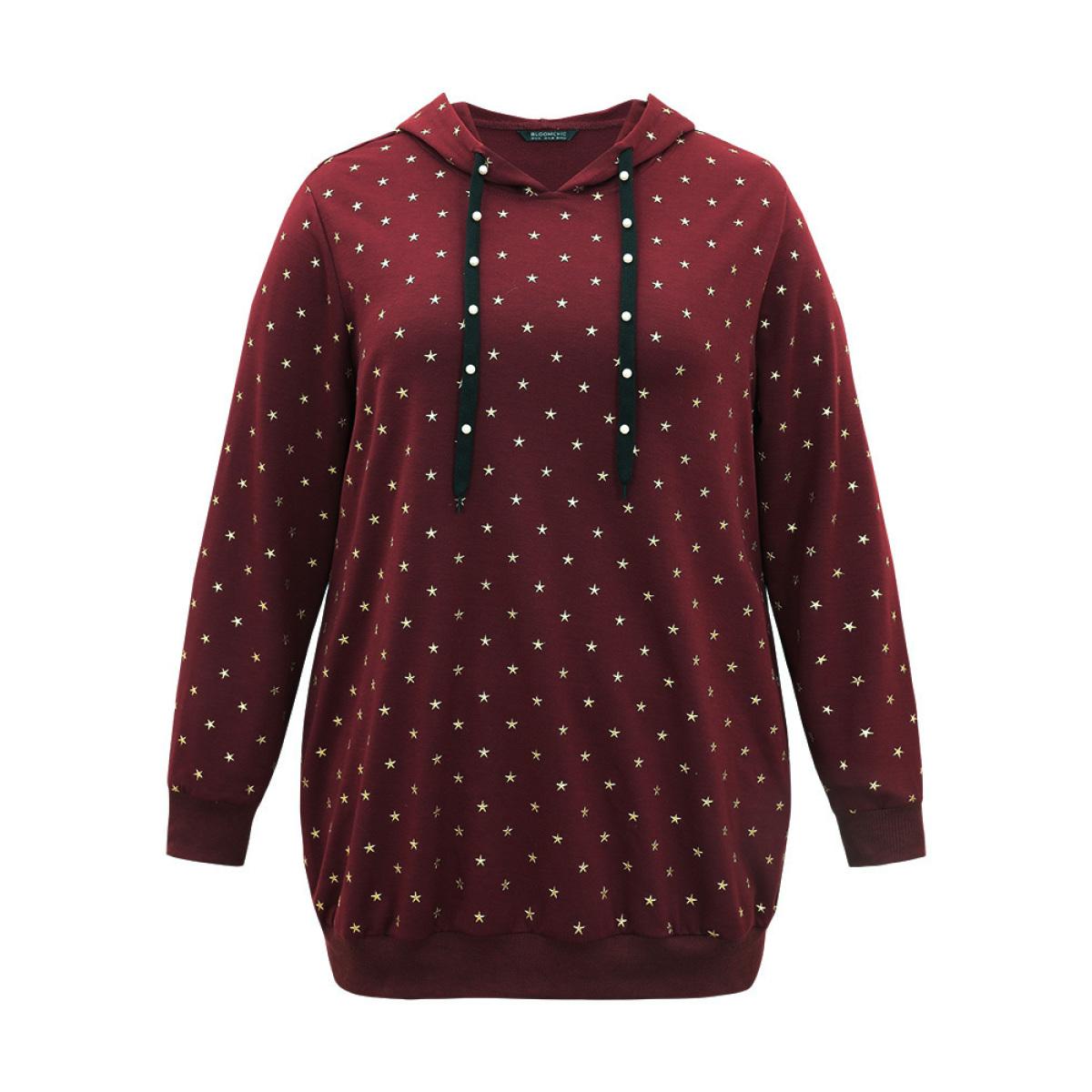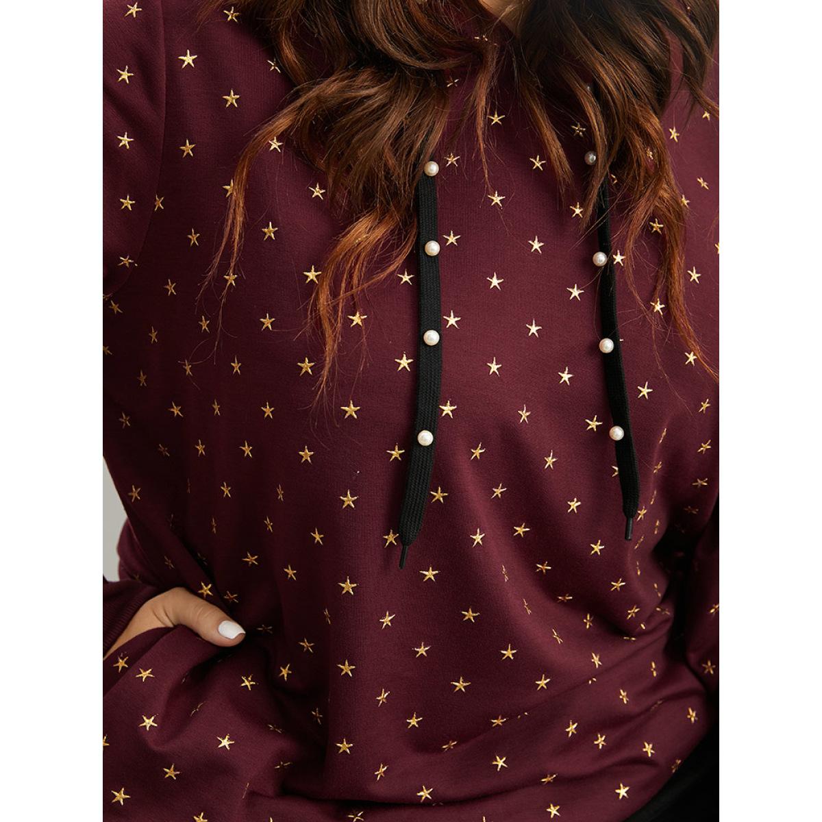 Plus Size Star Glitter Rib Knit Pearl Beaded Hooded Sweatshirt Women Red Casual Rib Knit Hooded Dailywear Sweatshirts BloomChic 12/L