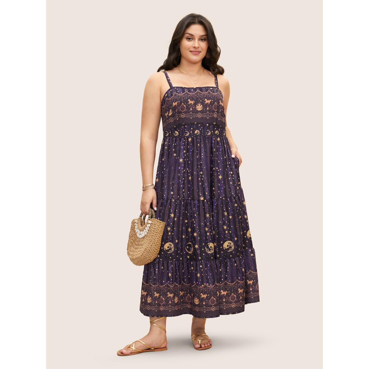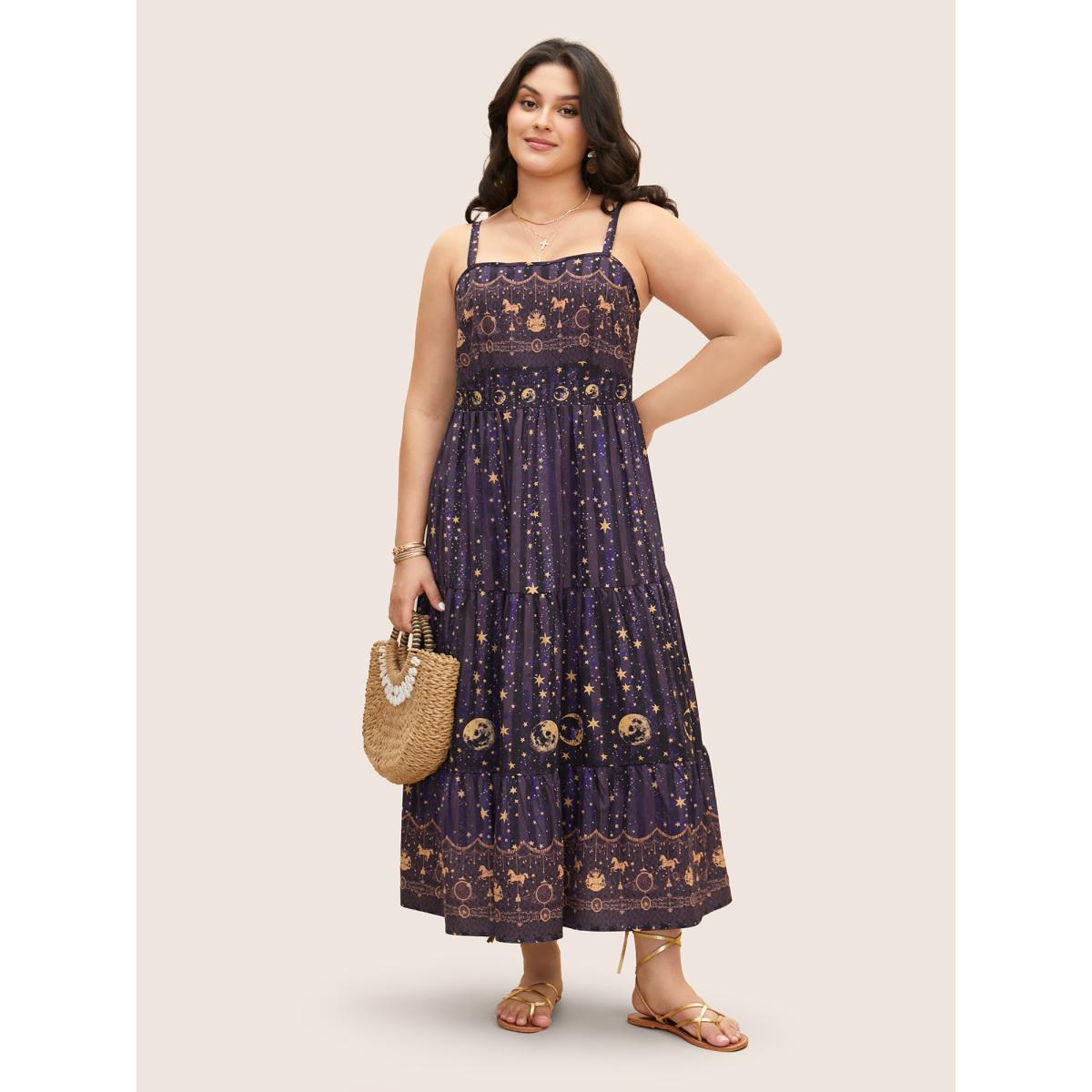 Plus Size Star & Moon Print Elastic Waist Maxi Cami Dress Deeppurple Women Boho Patchwork Non Sleeveless Curvy BloomChic 26/4X