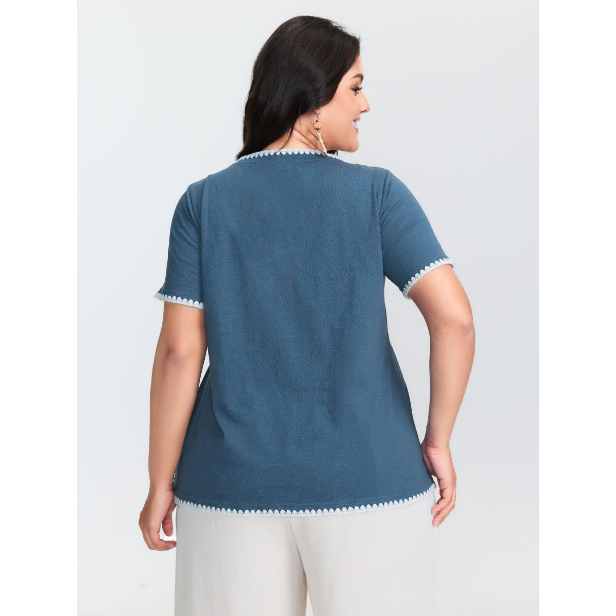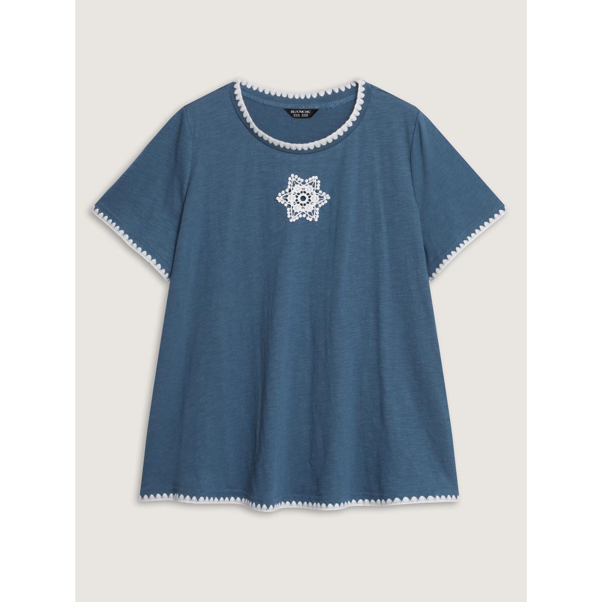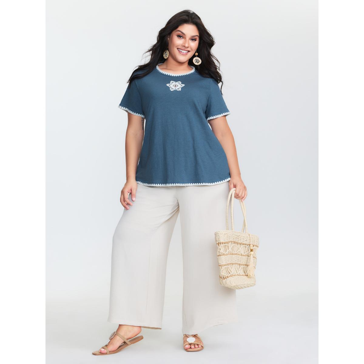 Plus Size Floral Embroidered Keyhole Dolman Sleeve T-shirt Blue Women Elegant Cut-Out Bohemian Print Keyhole Cut-Out Dailywear T-shirts BloomChic 10/M