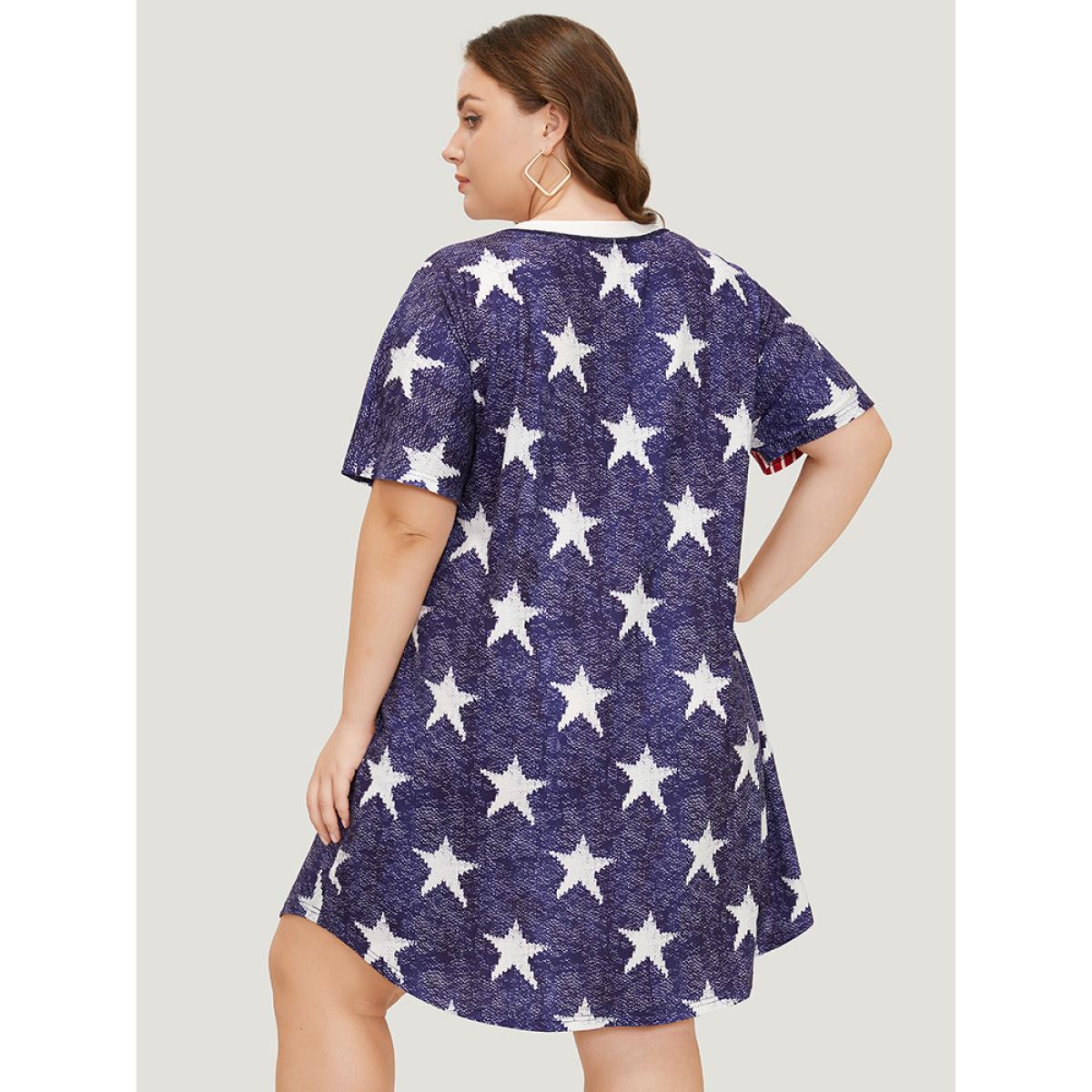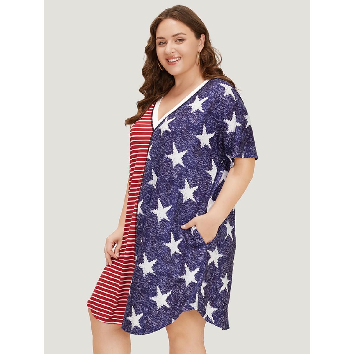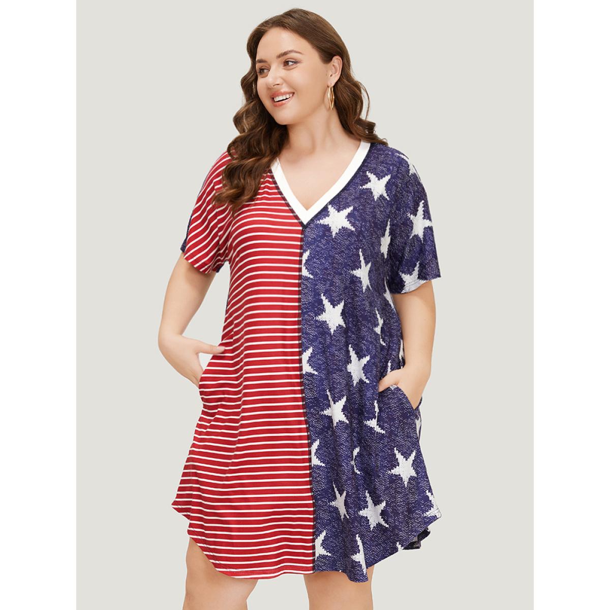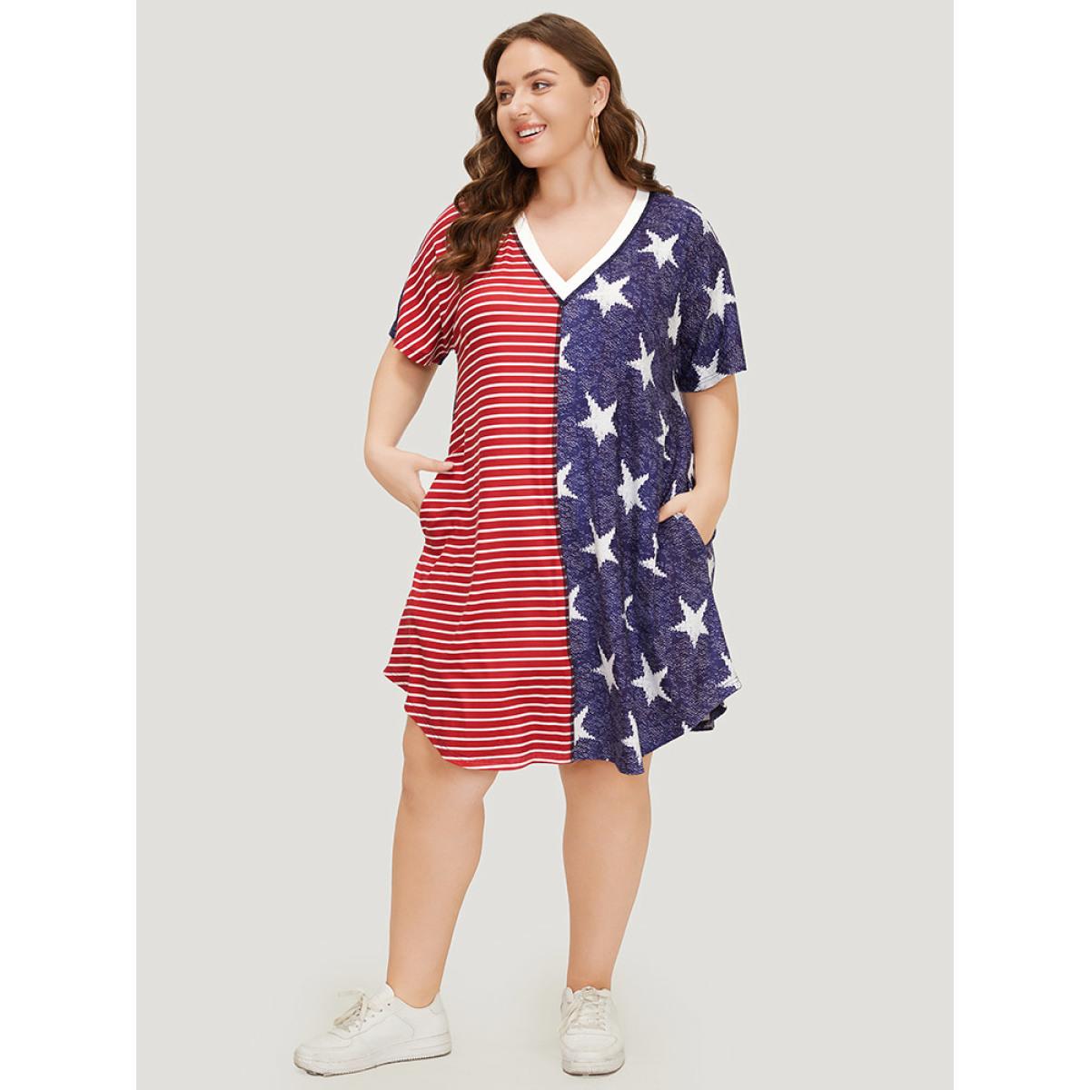 Plus Size Star & Striped Patchwork Curved Hem Pocket Dress Multicolor Women Casual Arc Hem V-neck Short sleeve Curvy Knee Dress BloomChic 10/M