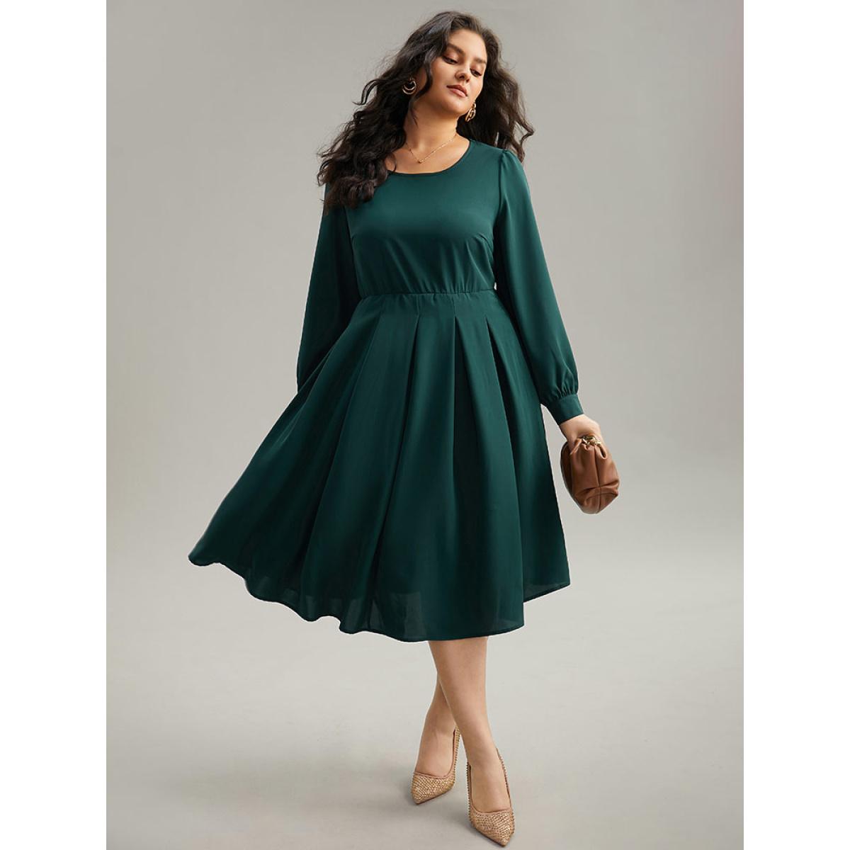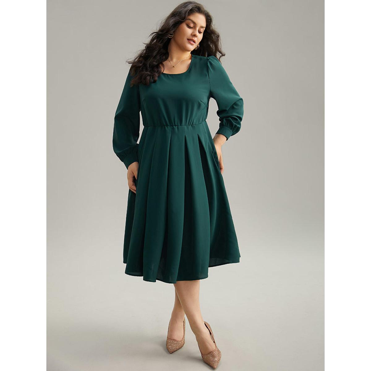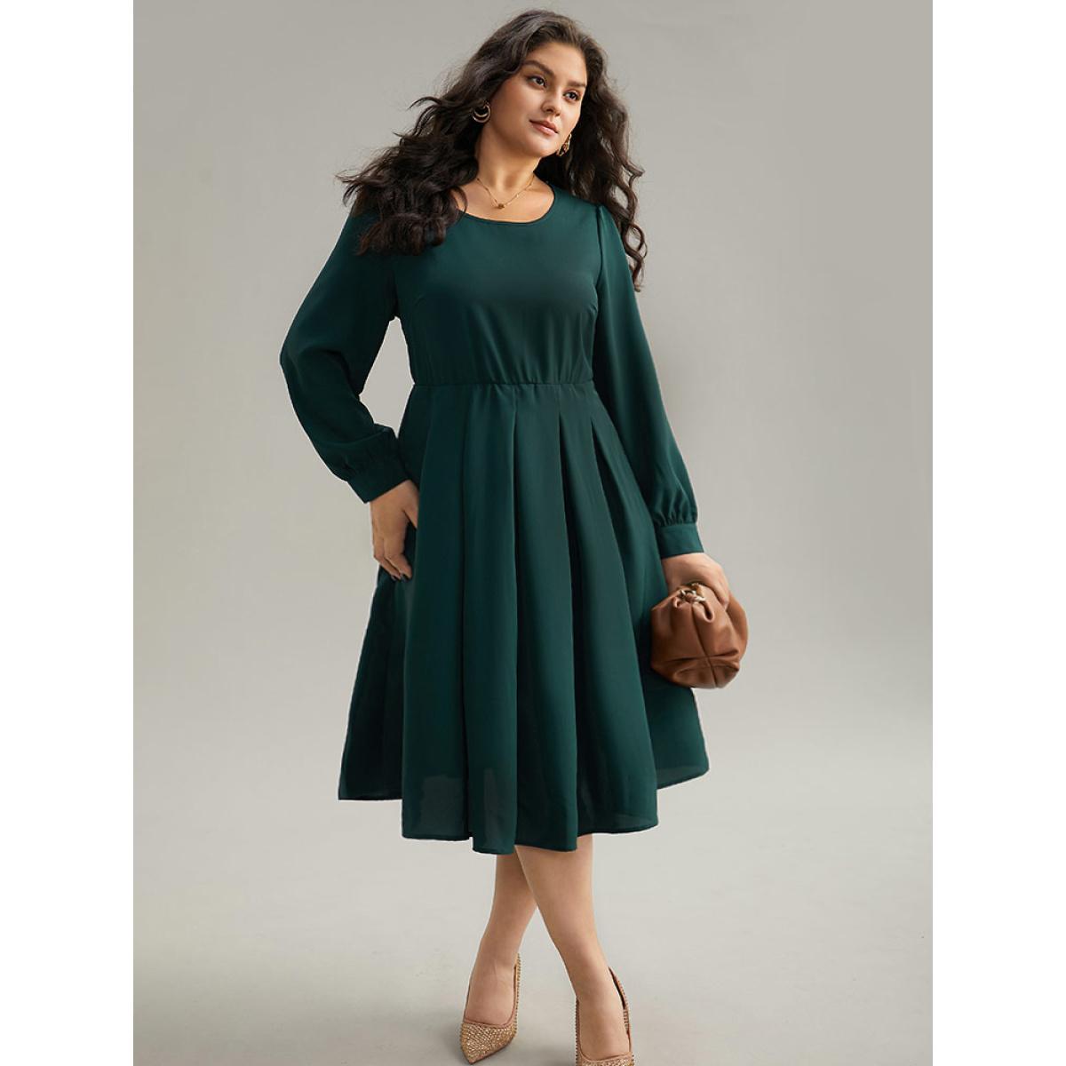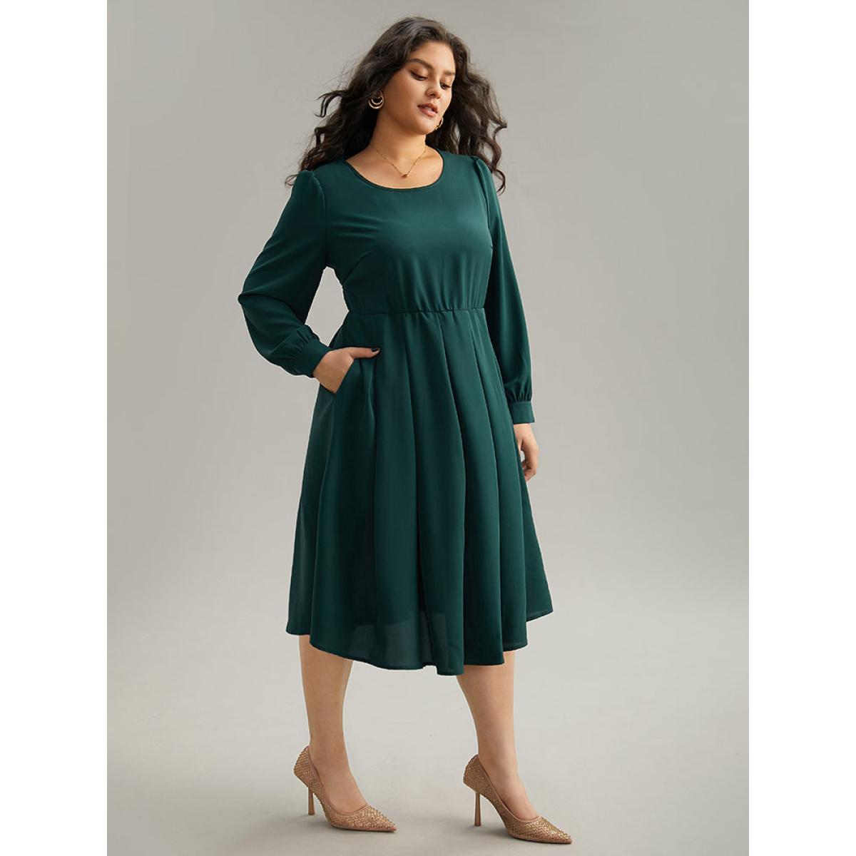 Plus Size Static-Free Plain Pleated Pocket Dress DarkGreen Women Elegant Plain Round Neck Long Sleeve Curvy Midi Dress BloomChic 26/4X
