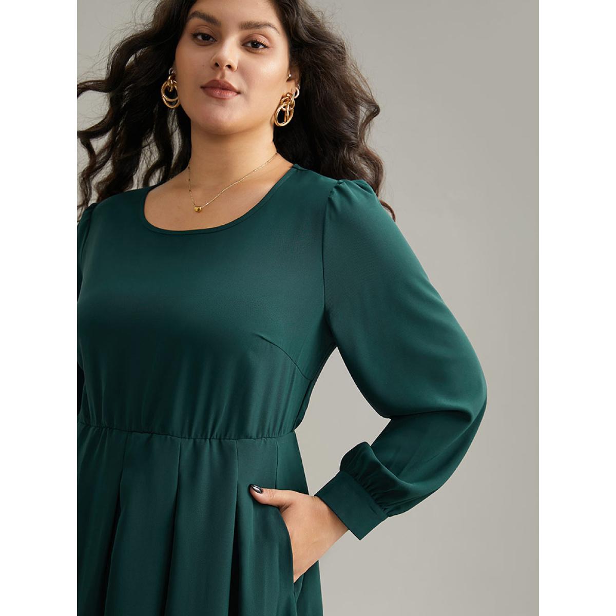 Plus Size Static-Free Plain Pleated Pocket Dress DarkGreen Women Elegant Plain Round Neck Long Sleeve Curvy Midi Dress BloomChic 26/4X Product Image