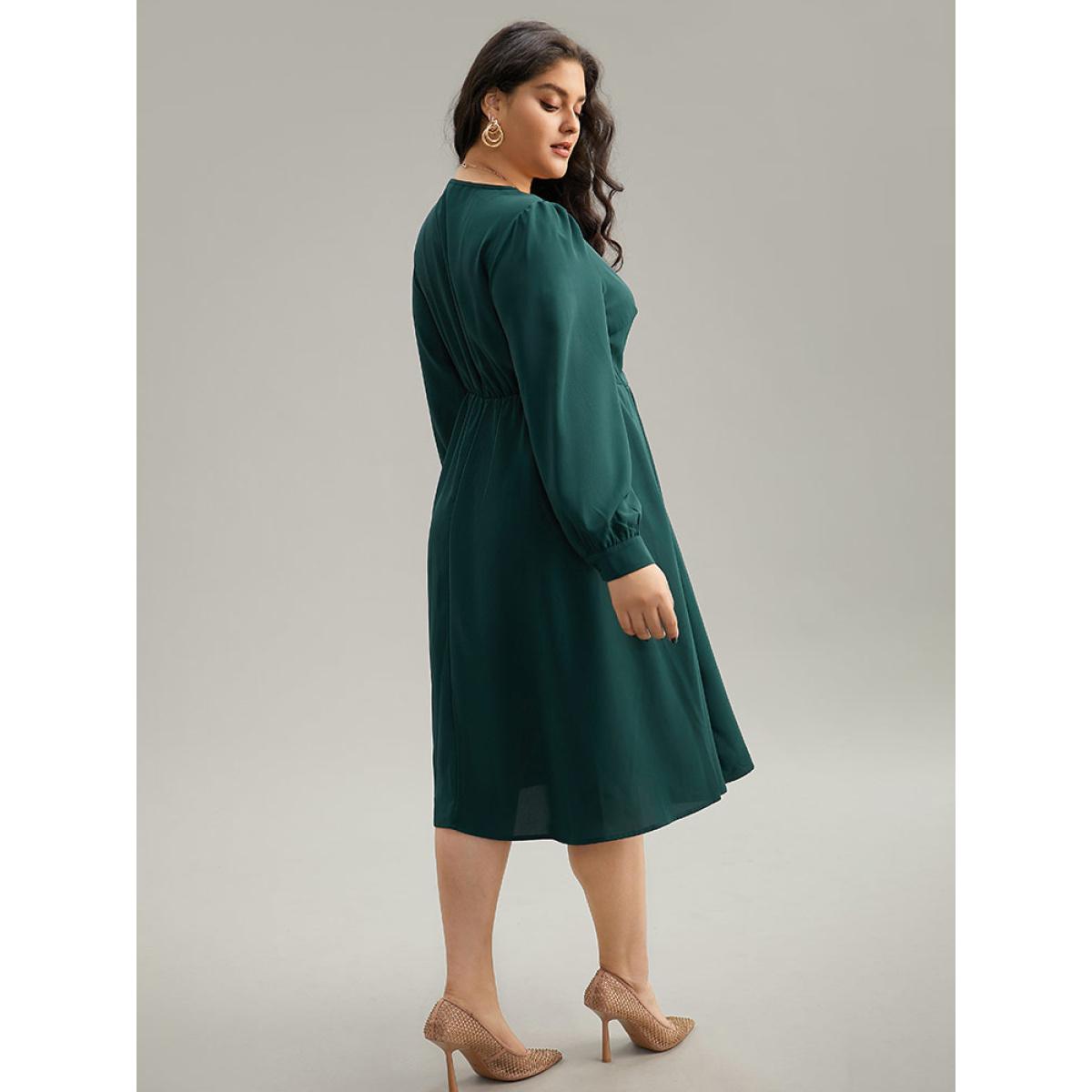 Plus Size Solid Plisse Button Detail Shirred Dress DarkGreen Women Elegant Elastic cuffs V-neck Long Sleeve Curvy Midi Dress BloomChic 18-20/2X