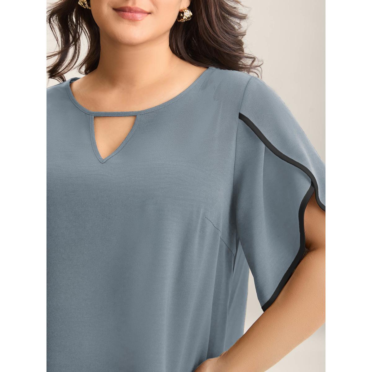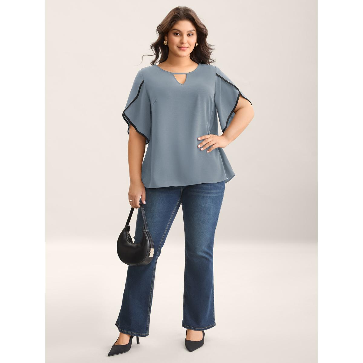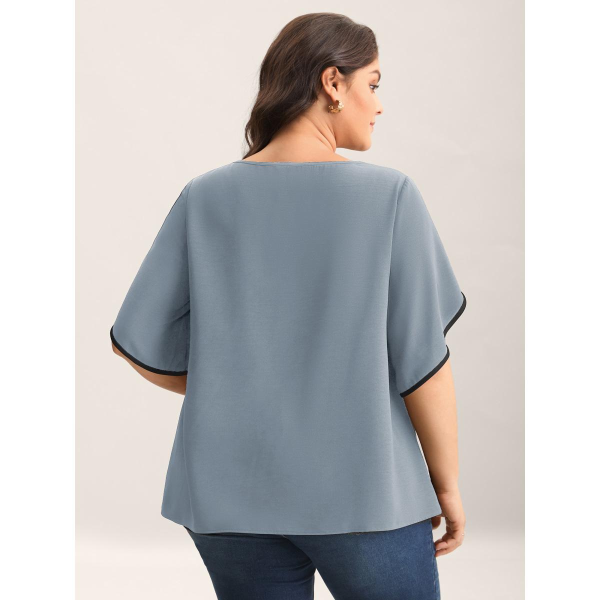 Plus Size Stone Color Contrast Petal Sleeve Shirt Women Office Half Sleeve Round Neck Office Blouses BloomChic 12/L