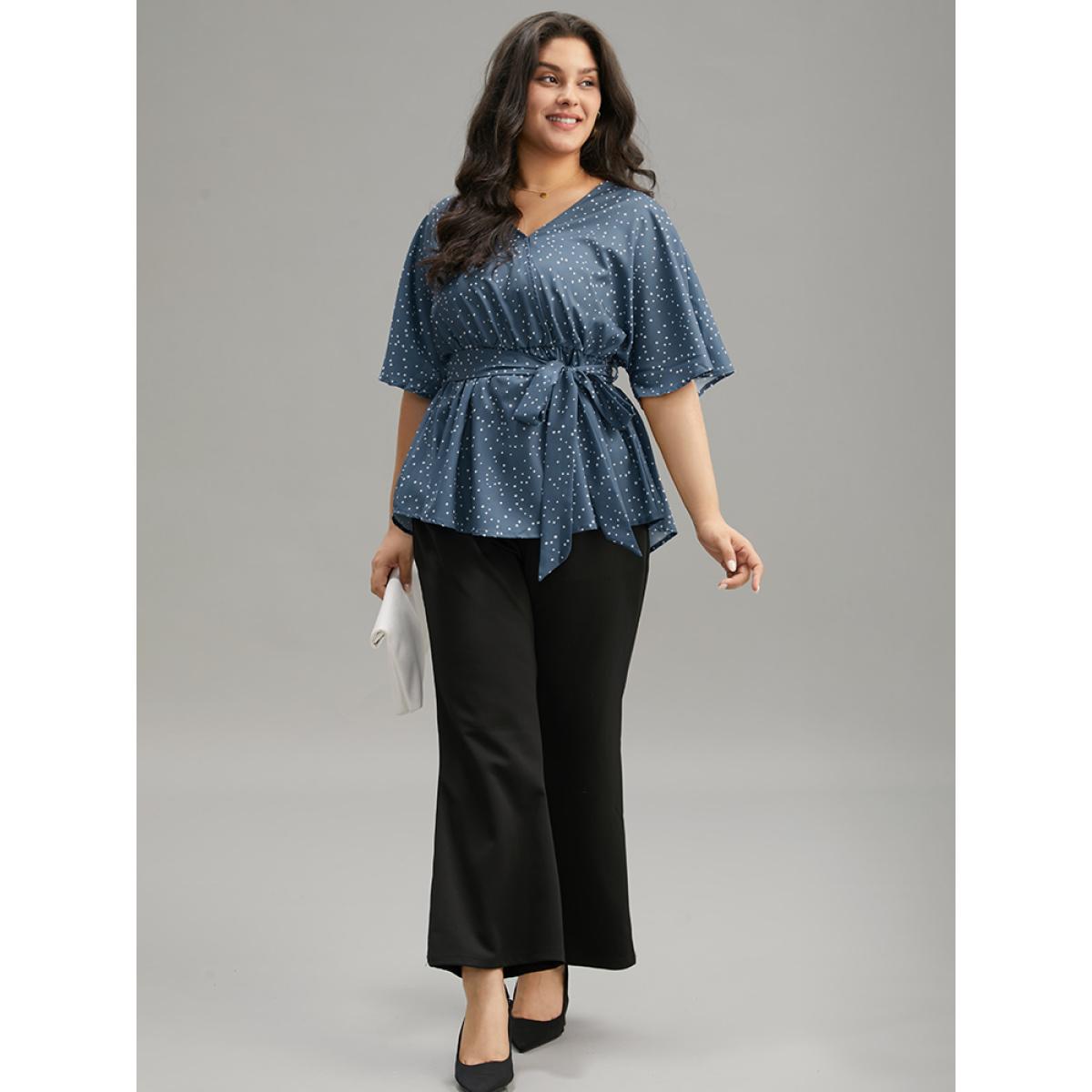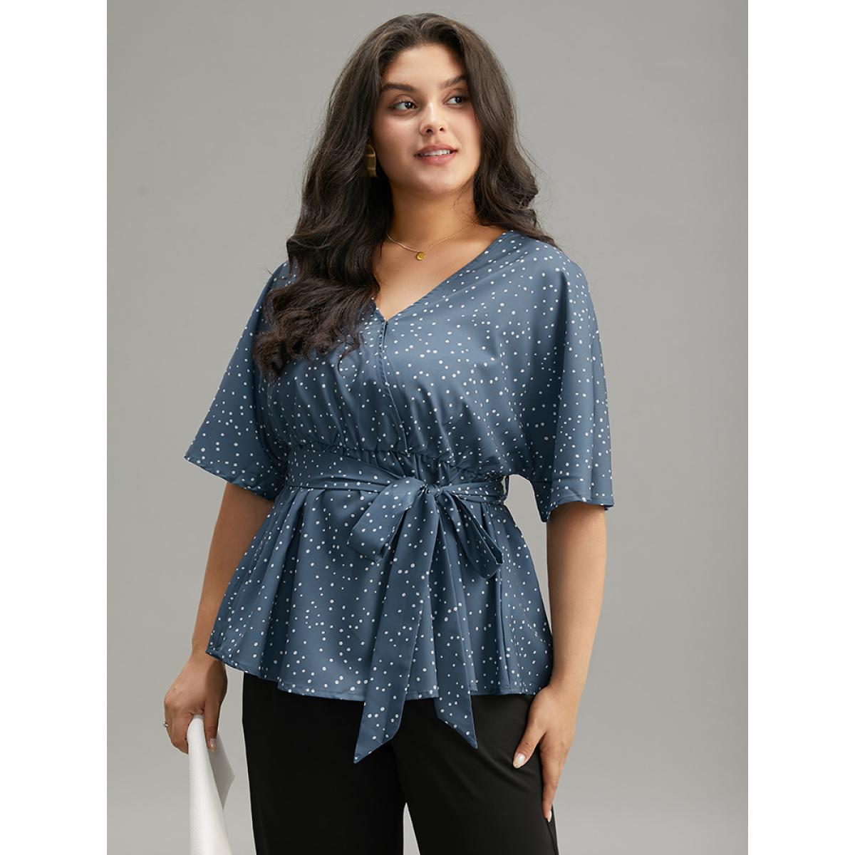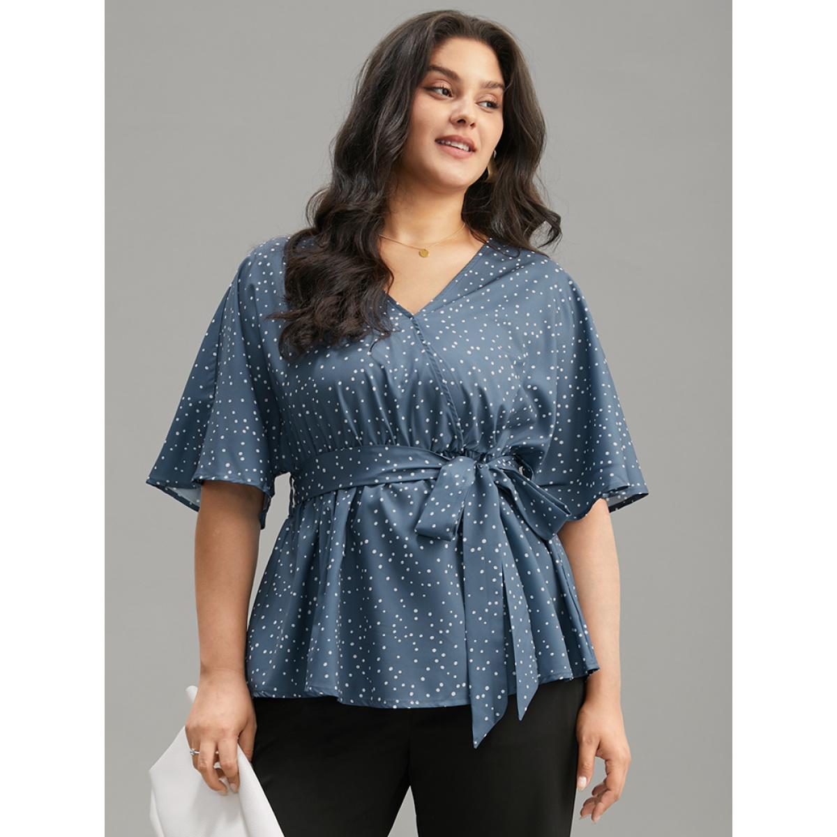 Plus Size Stone Polka Dot Flutter Sleeve Wrap Belted Blouse Women Office Short sleeve V-neck Work Blouses BloomChic 26/4X