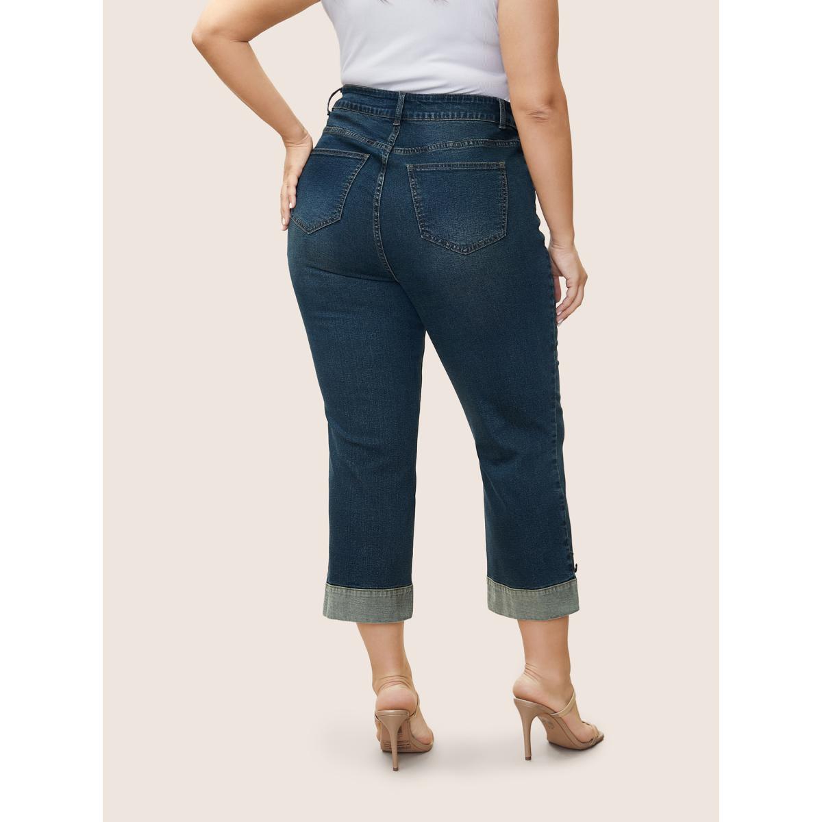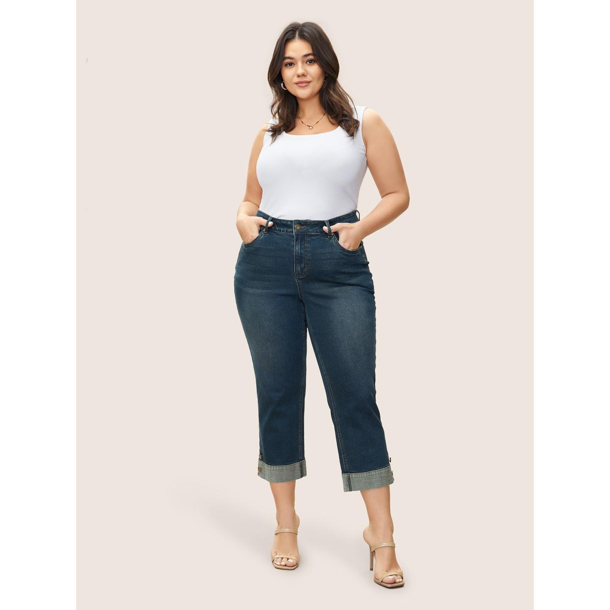 Plus Size Straight Leg Patchwork Hem Metal Button Detail Jeans Women Aegean Casual Plain Non High stretch Slanted pocket Jeans BloomChic 20/2X