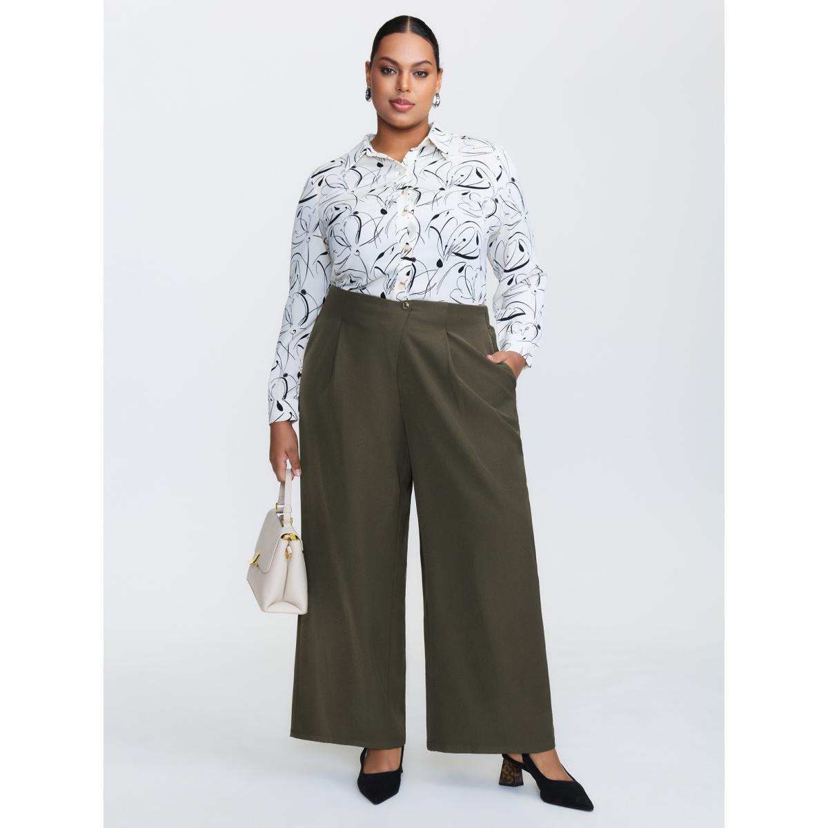 Plus Size Solid Pleated Button Detail Straight Leg Pants Women ArmyGreen Office Straight Leg High Rise Office Pants BloomChic 30/6X