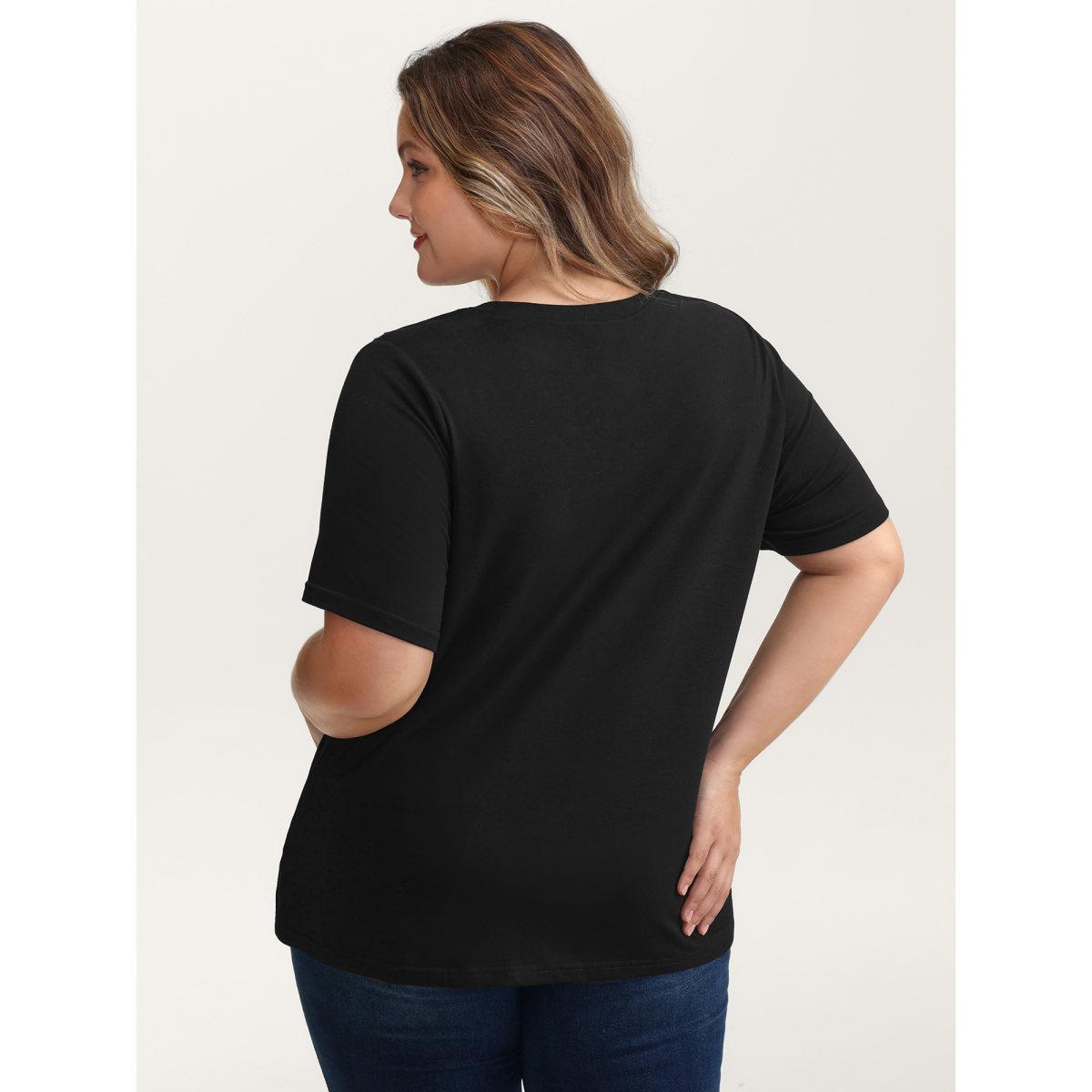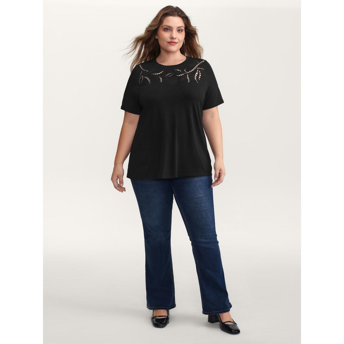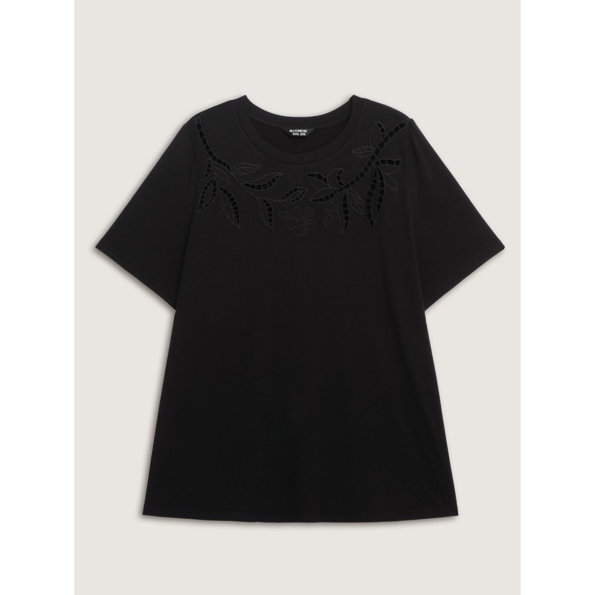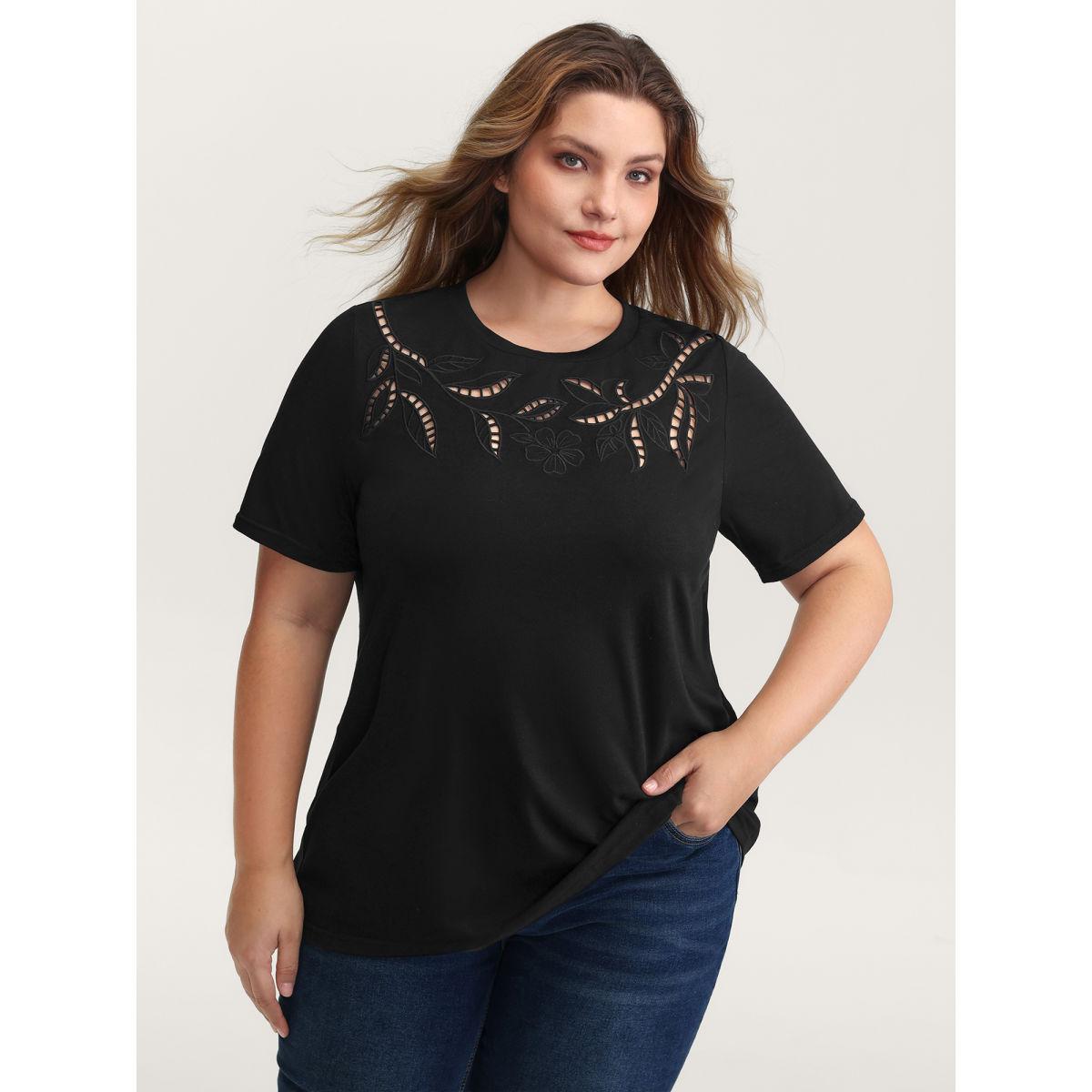 Plus Size Stretchy Embroidered Cut-Out T-Shirt Black Women Leisure Broderie anglaise Plants Round Neck Casual T-shirts BloomChic 12/L