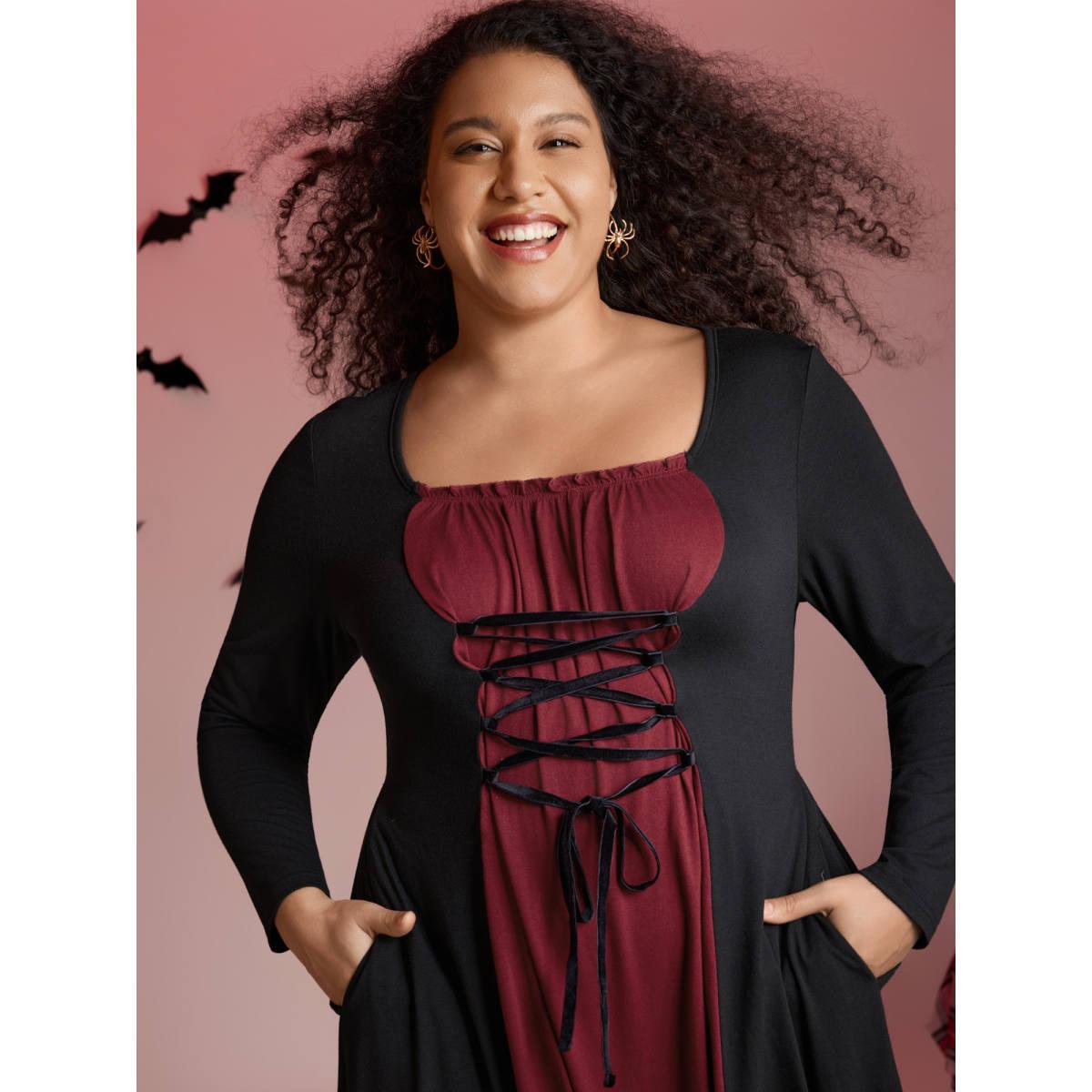 Plus Size Stretchy Knit Adjustable Tie Frill Trim Midi Dress Black Women Timeless Wraparound straps Party Curvy Bloomchic 30/6X