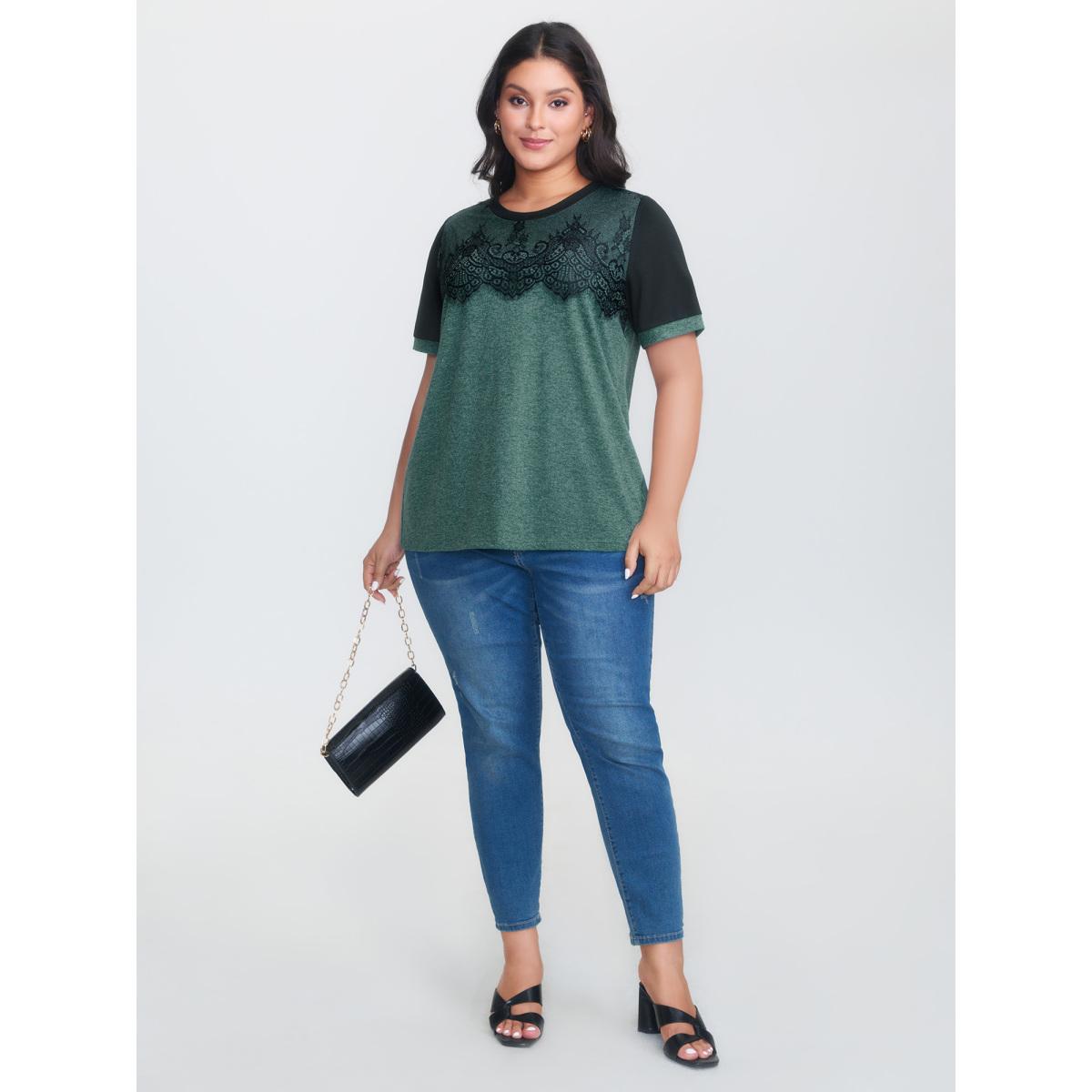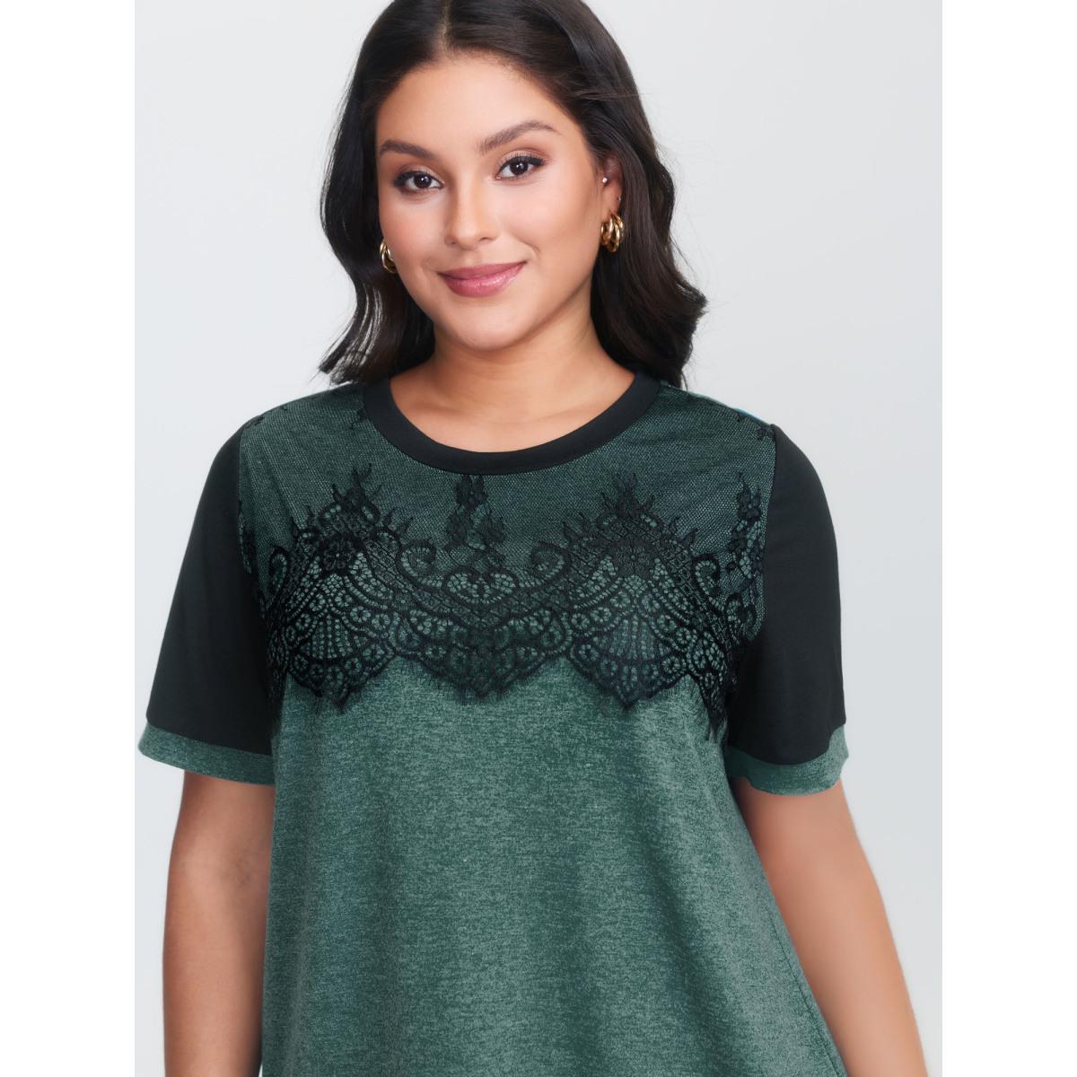 Plus Size Stretchy Scalloped Lace Color Contrast T-Shirt DarkSlateGray Women Timeless Contrast Plain Round Neck Elegant T-shirts BloomChic 10/M