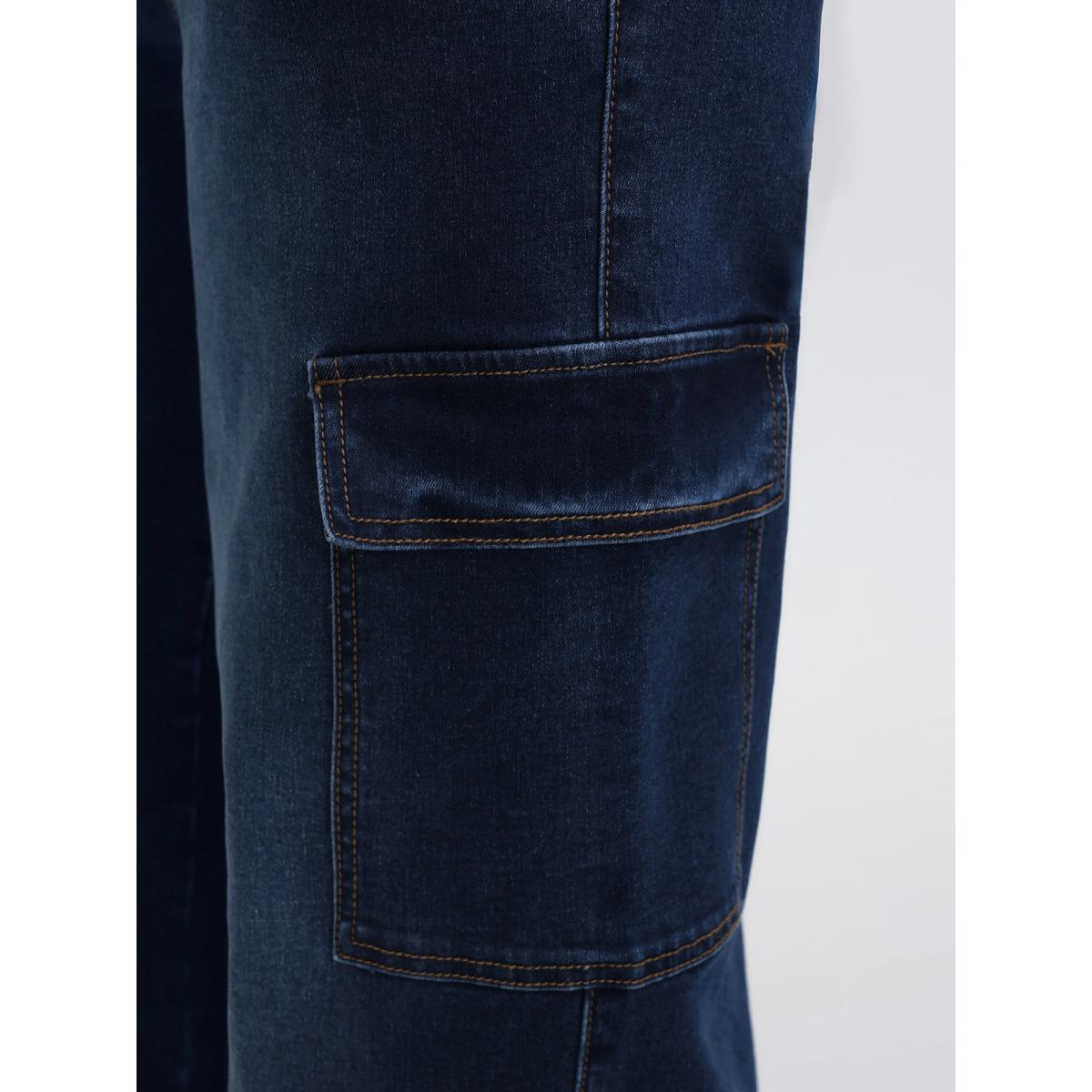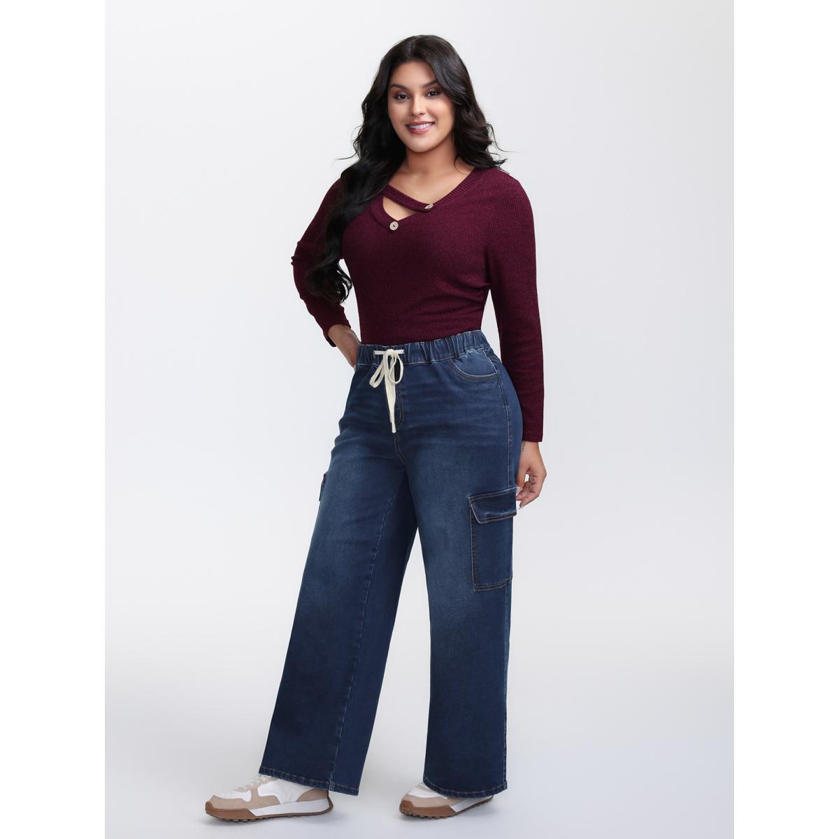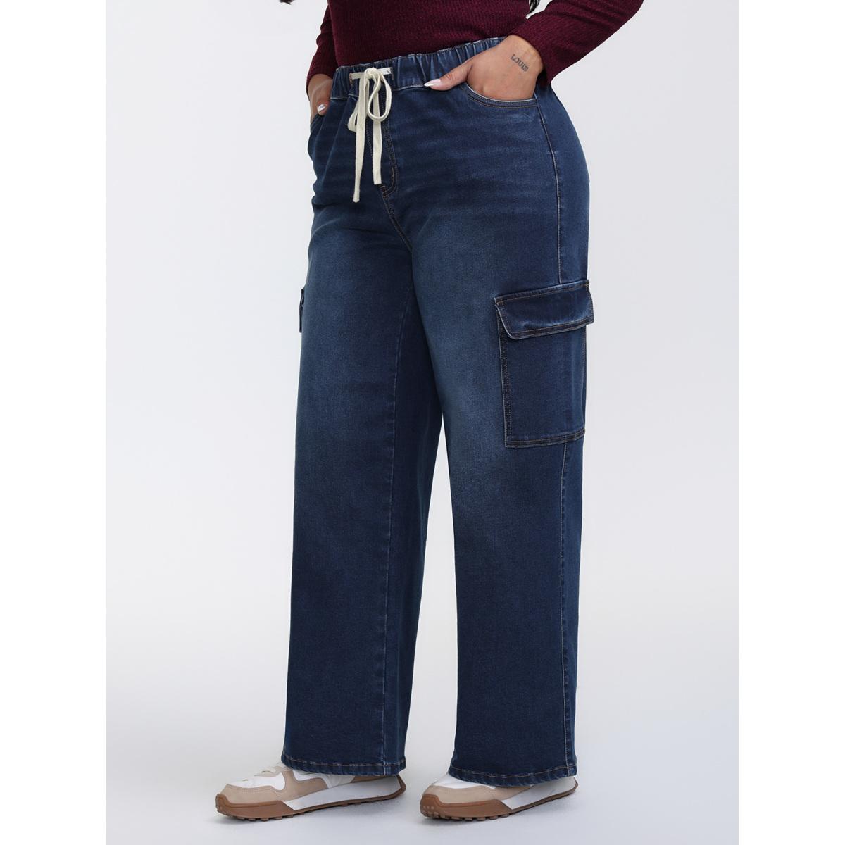 Plus Size Stretchy Waist Drawstring Wide-Leg Jeans Women Midblue Leisure Medium stretch Slanted pocket Jeans BloomChic 26/4X