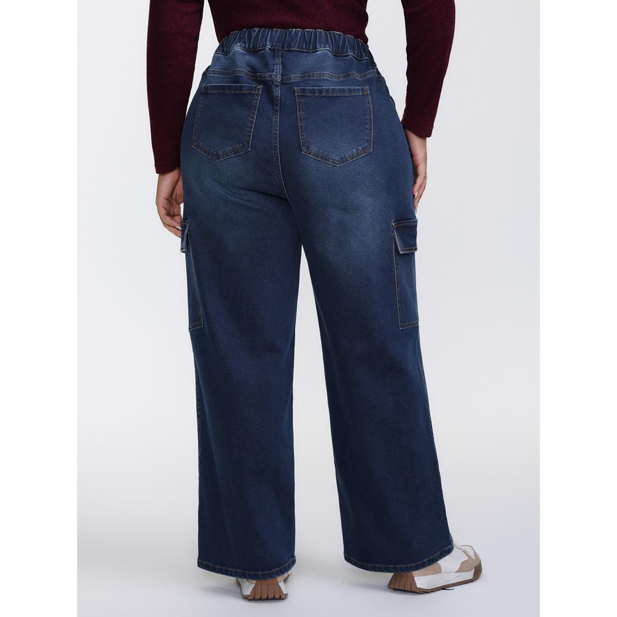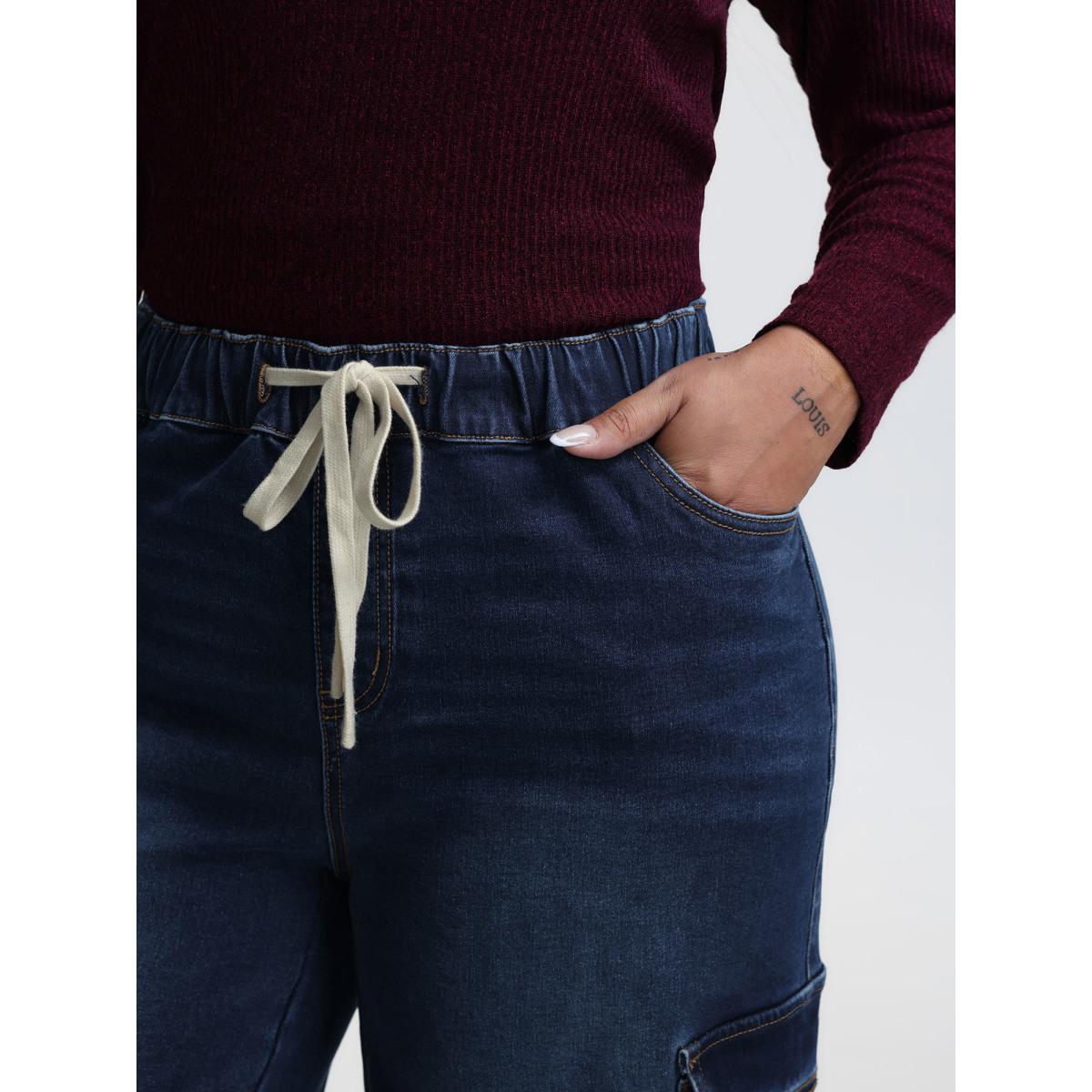 Plus Size Stretchy Waist Drawstring Wide-Leg Jeans Women Midblue Leisure Medium stretch Slanted pocket Jeans BloomChic 26/4X Product Image