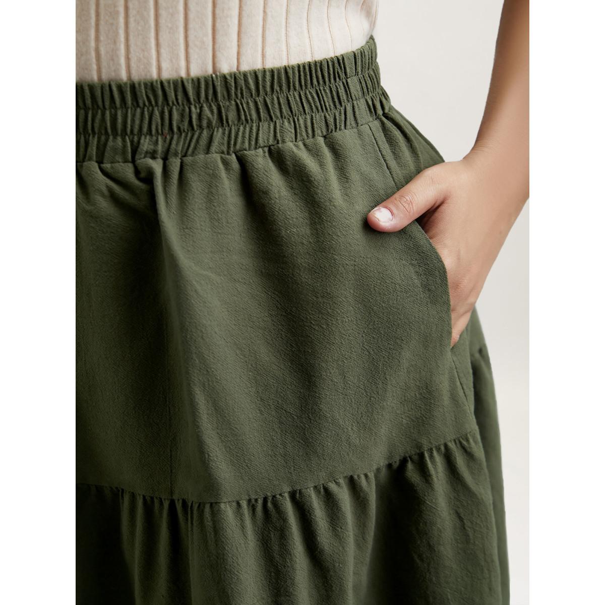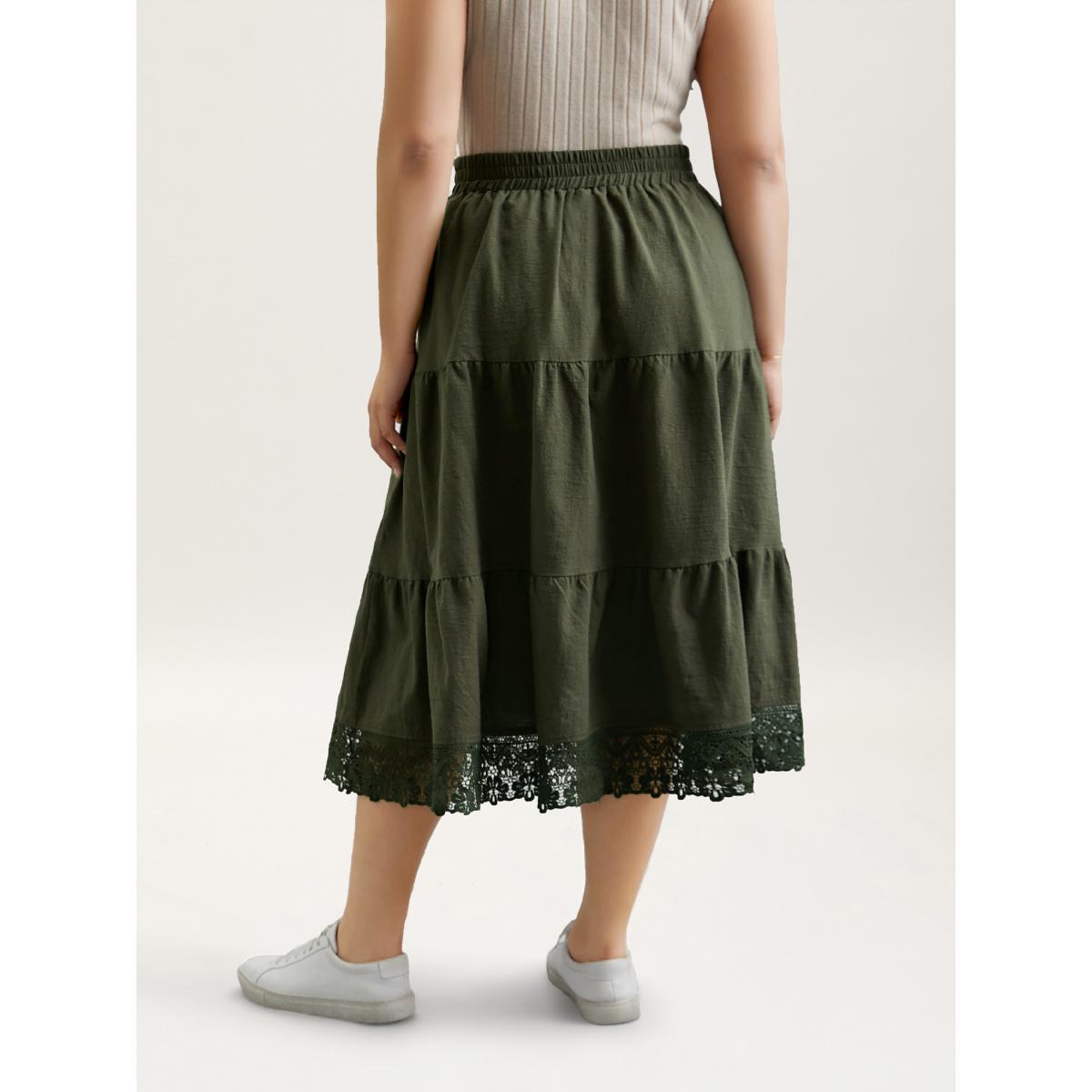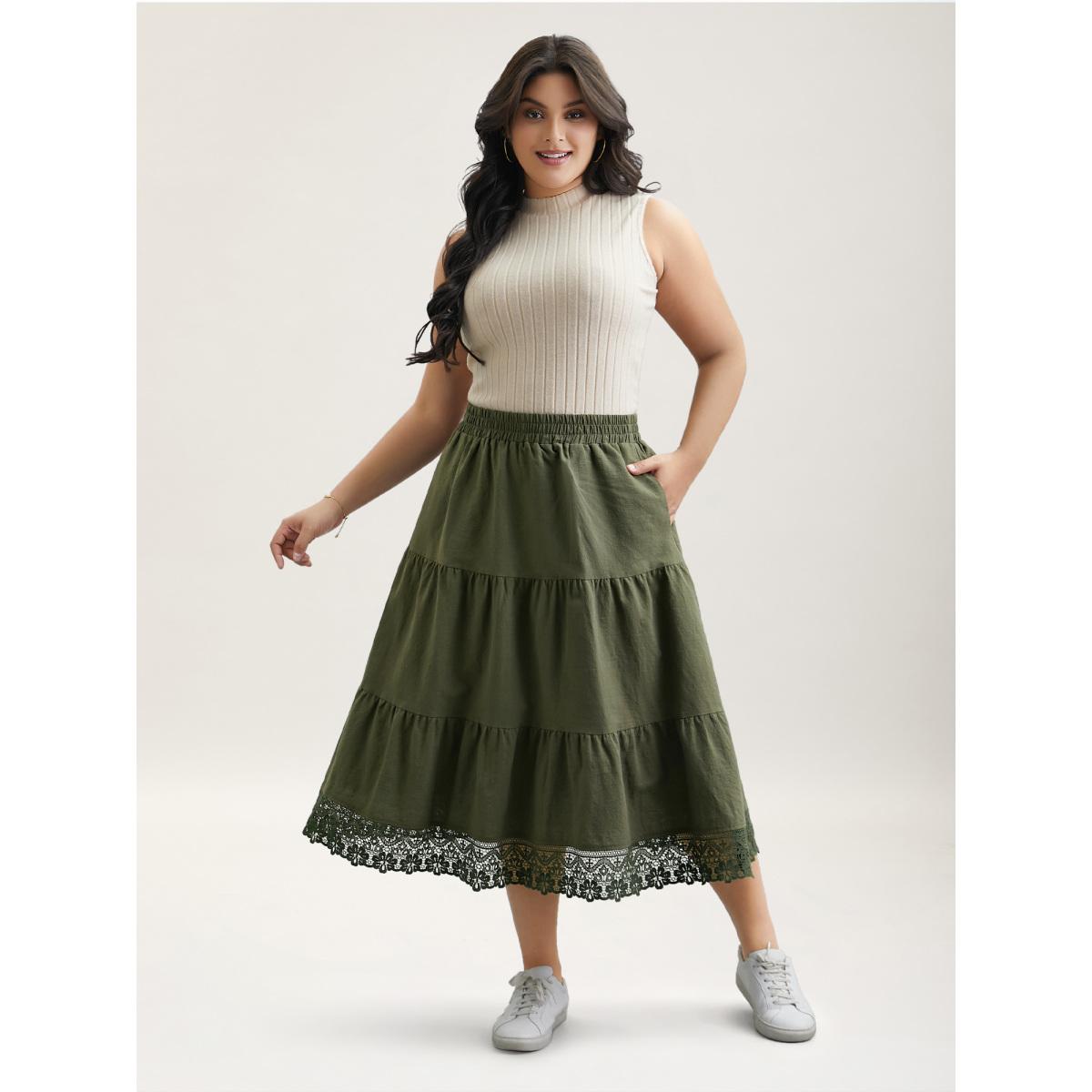 Plus Size Stretchy Waist Lace Tiered Midi Skirt Women ArmyGreen Elegant Gathered No stretch Side seam pocket Everyday Skirts BloomChic 28/5X