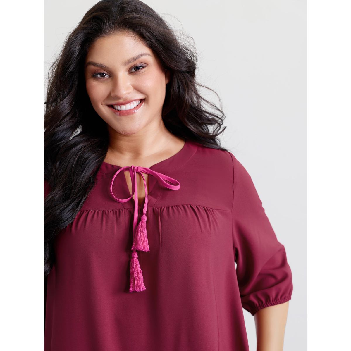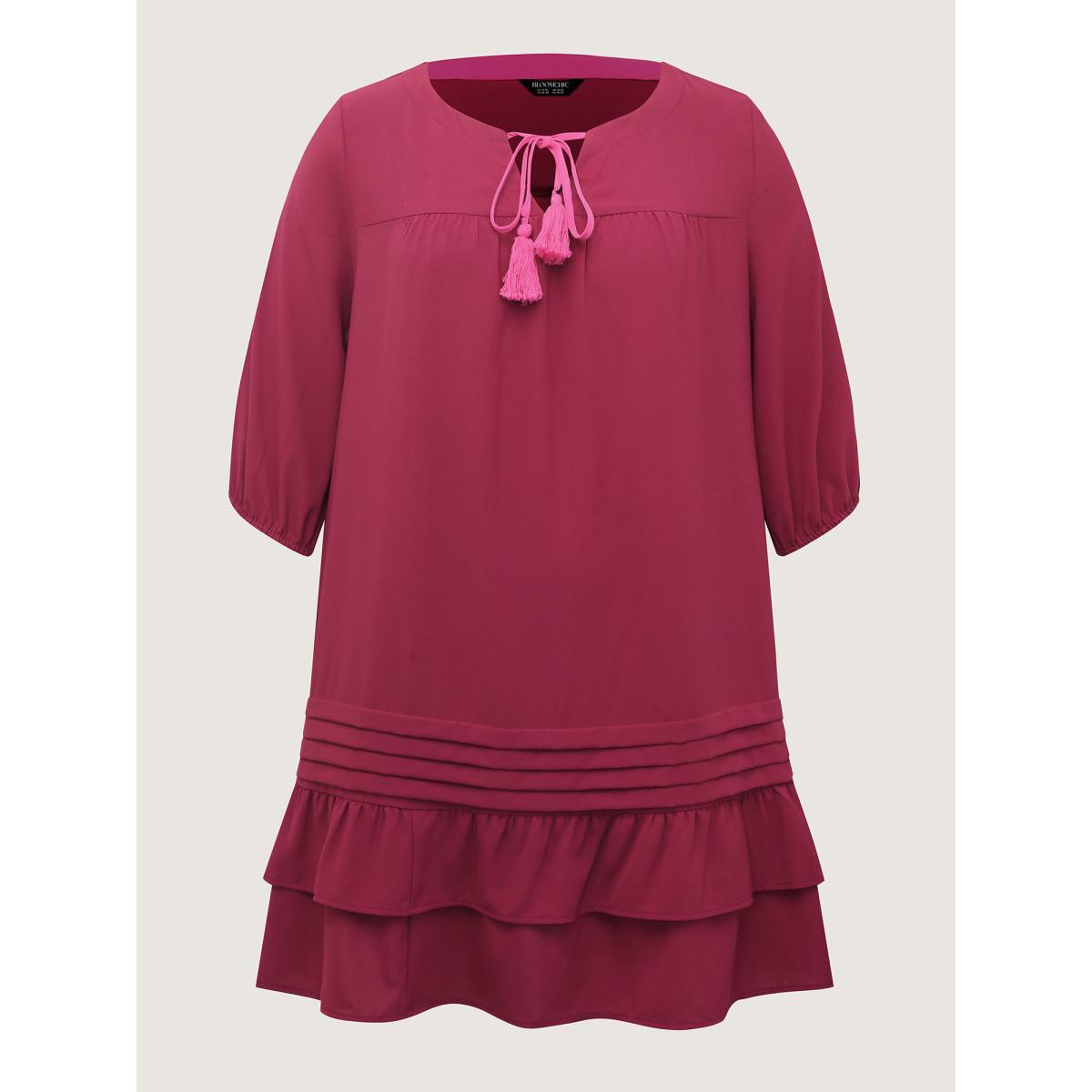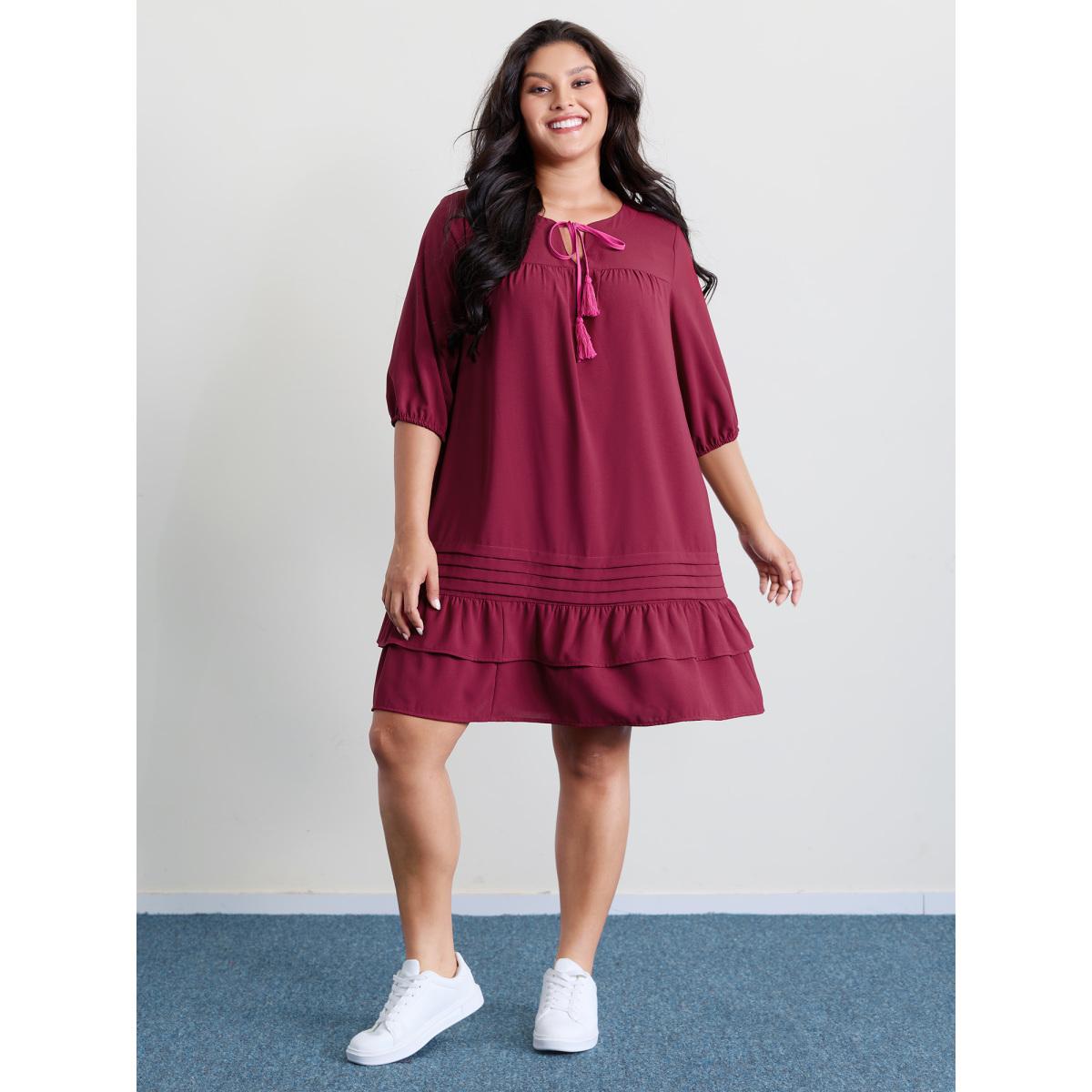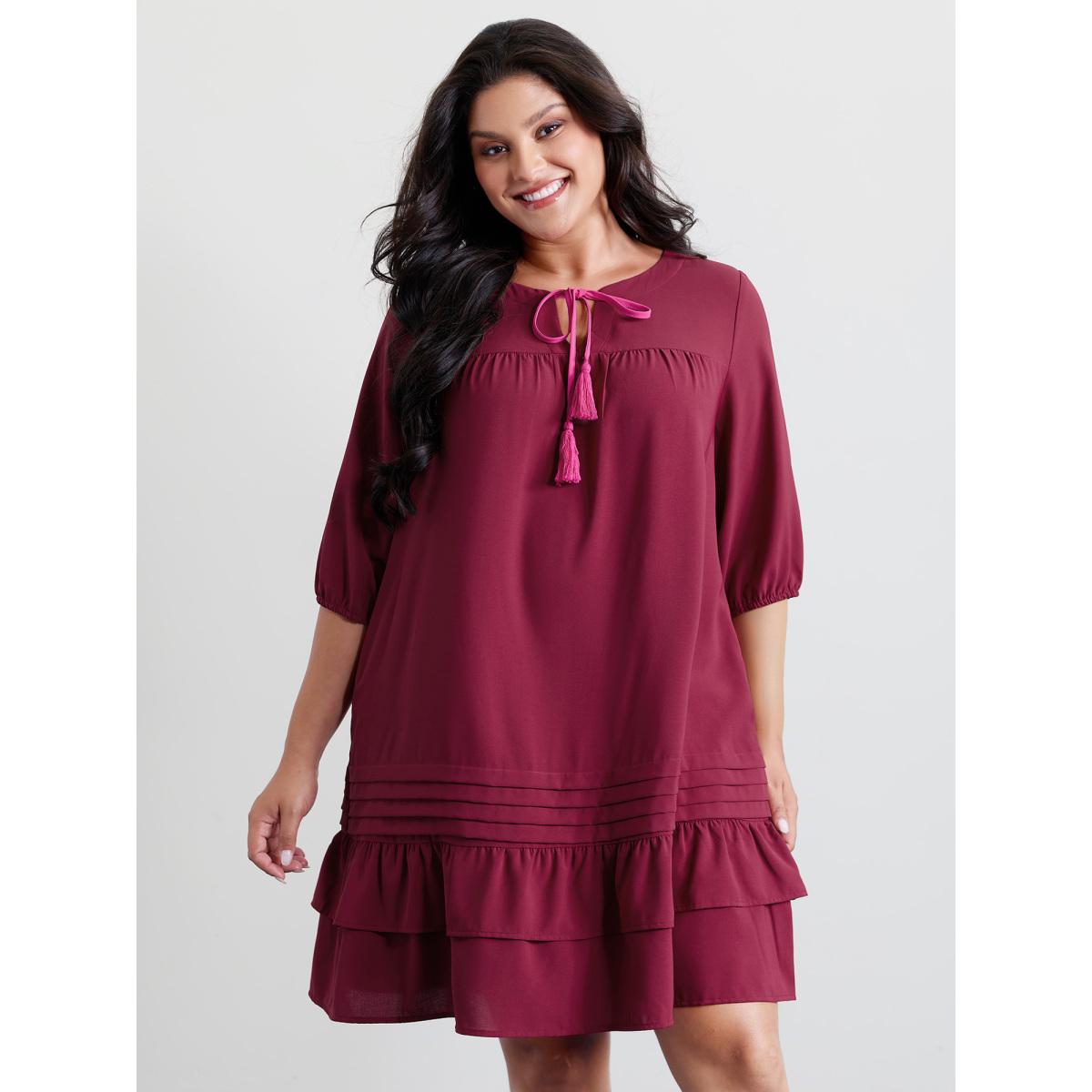 Plus Size Stretchy Waist Tiered Tie Knee-Length Dress Burgundy Women Playful Flat collar with V-notch Elbow-length sleeve Curvy BloomChic 12/L