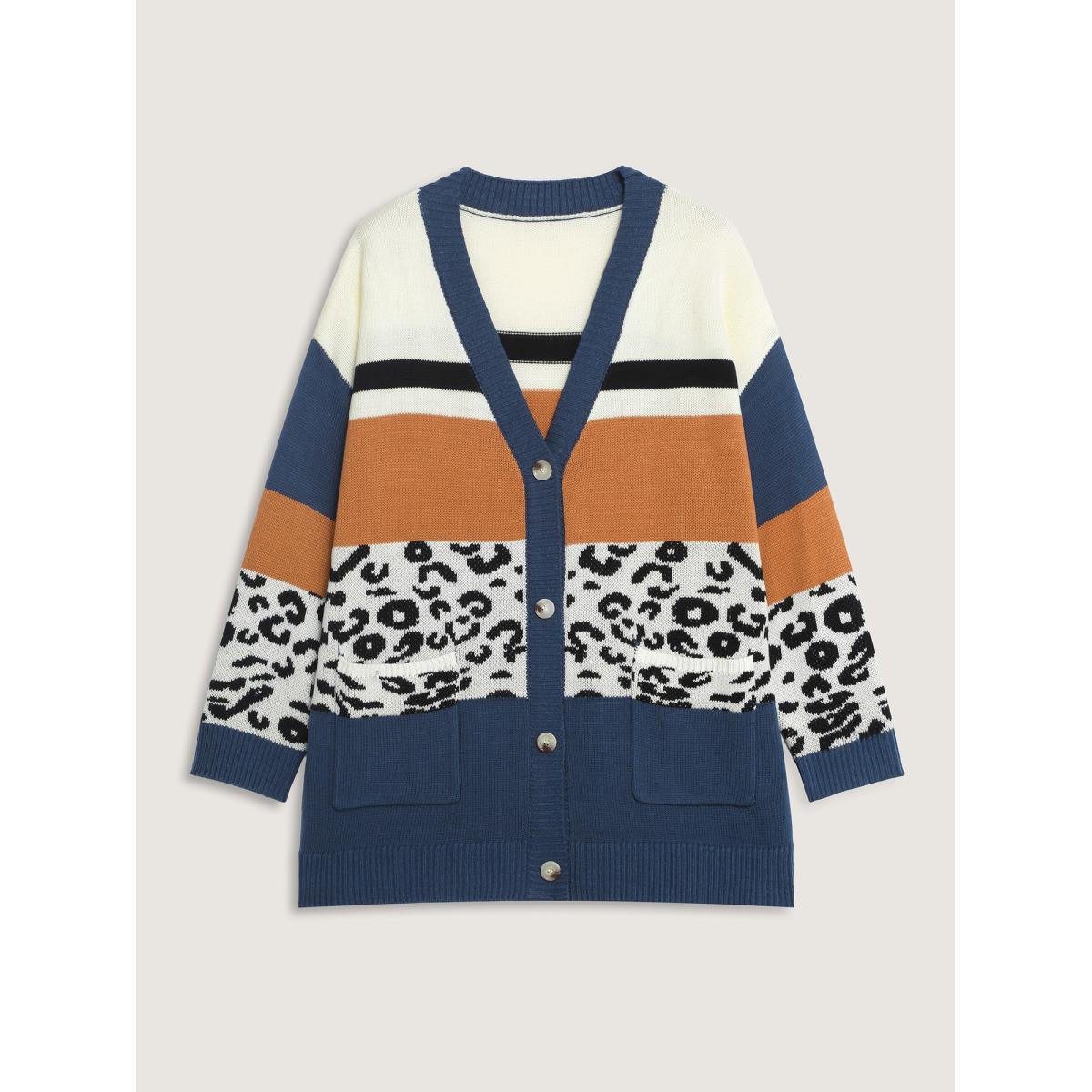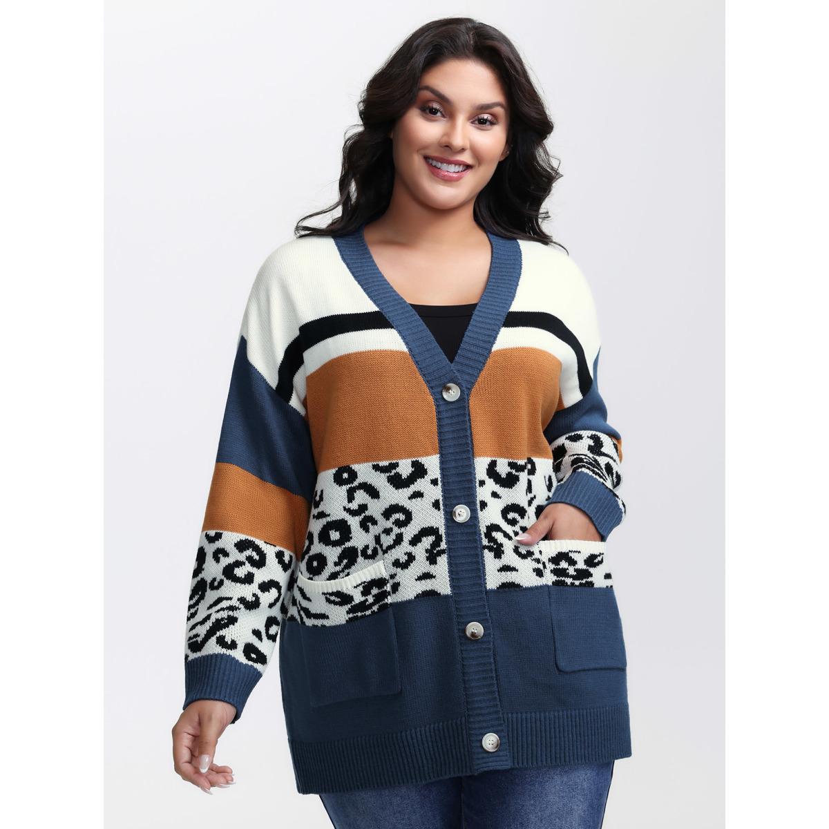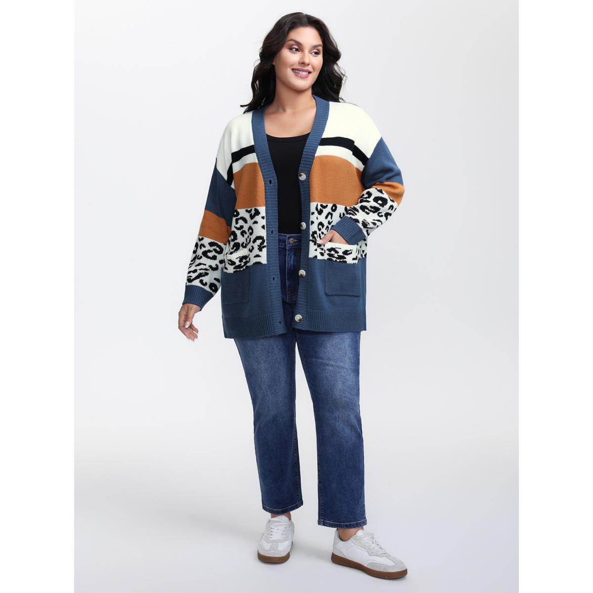 Plus Size Leopard Colorblock Patchwork Patched Pocket Cardigan Multicolor Women Casual Loose Long Sleeve Dailywear Cardigans BloomChic 28/5X