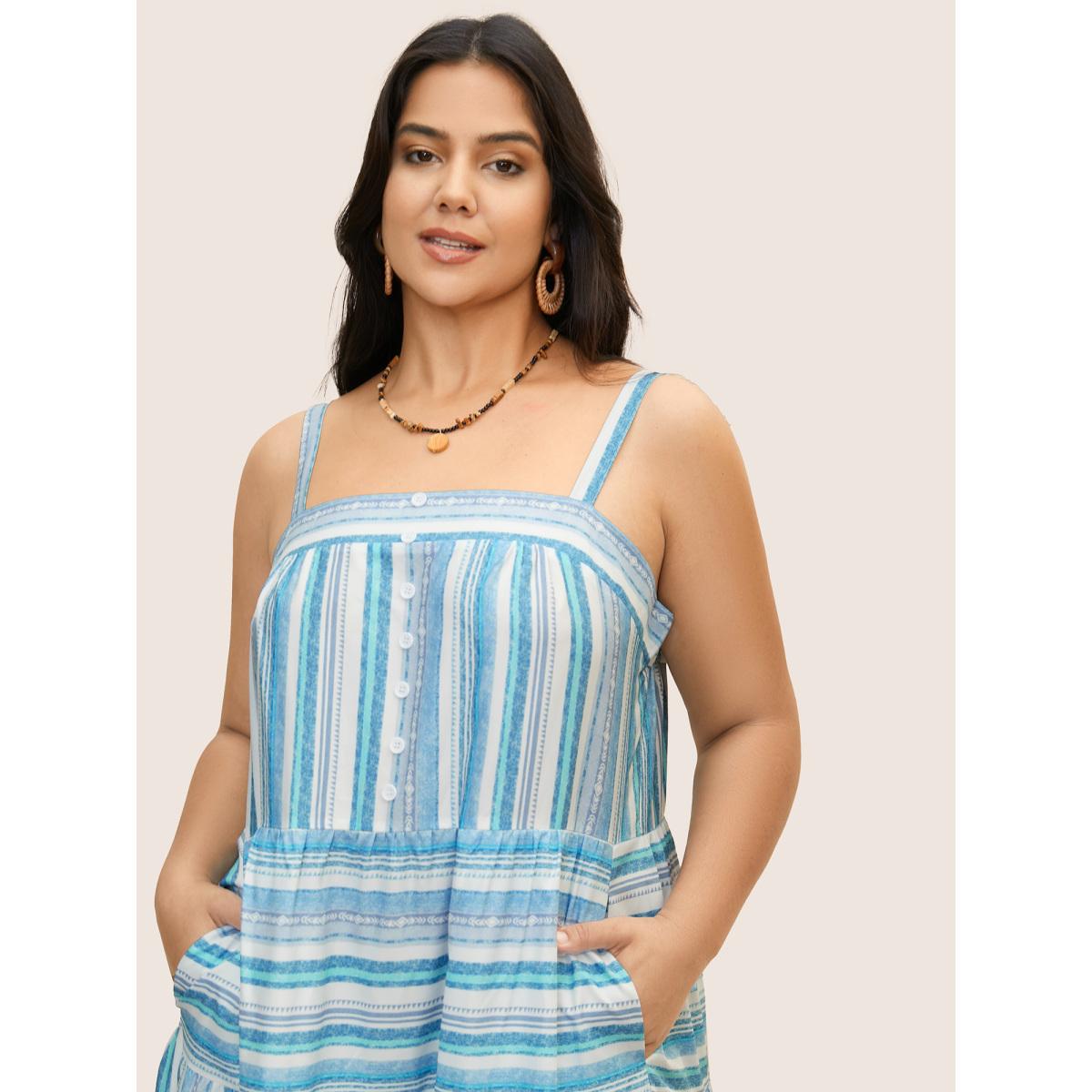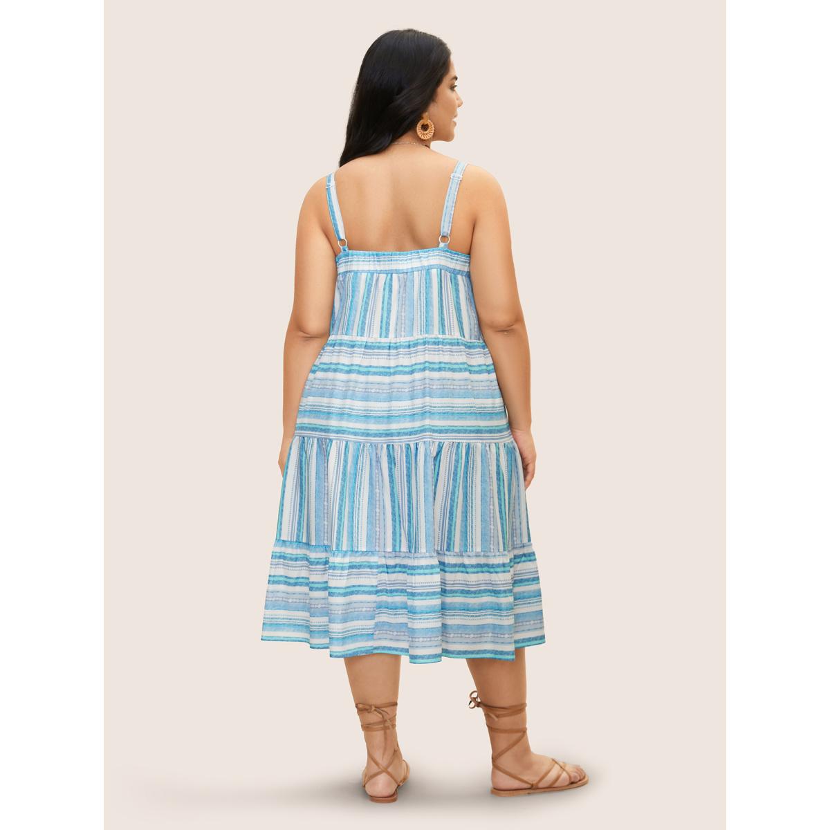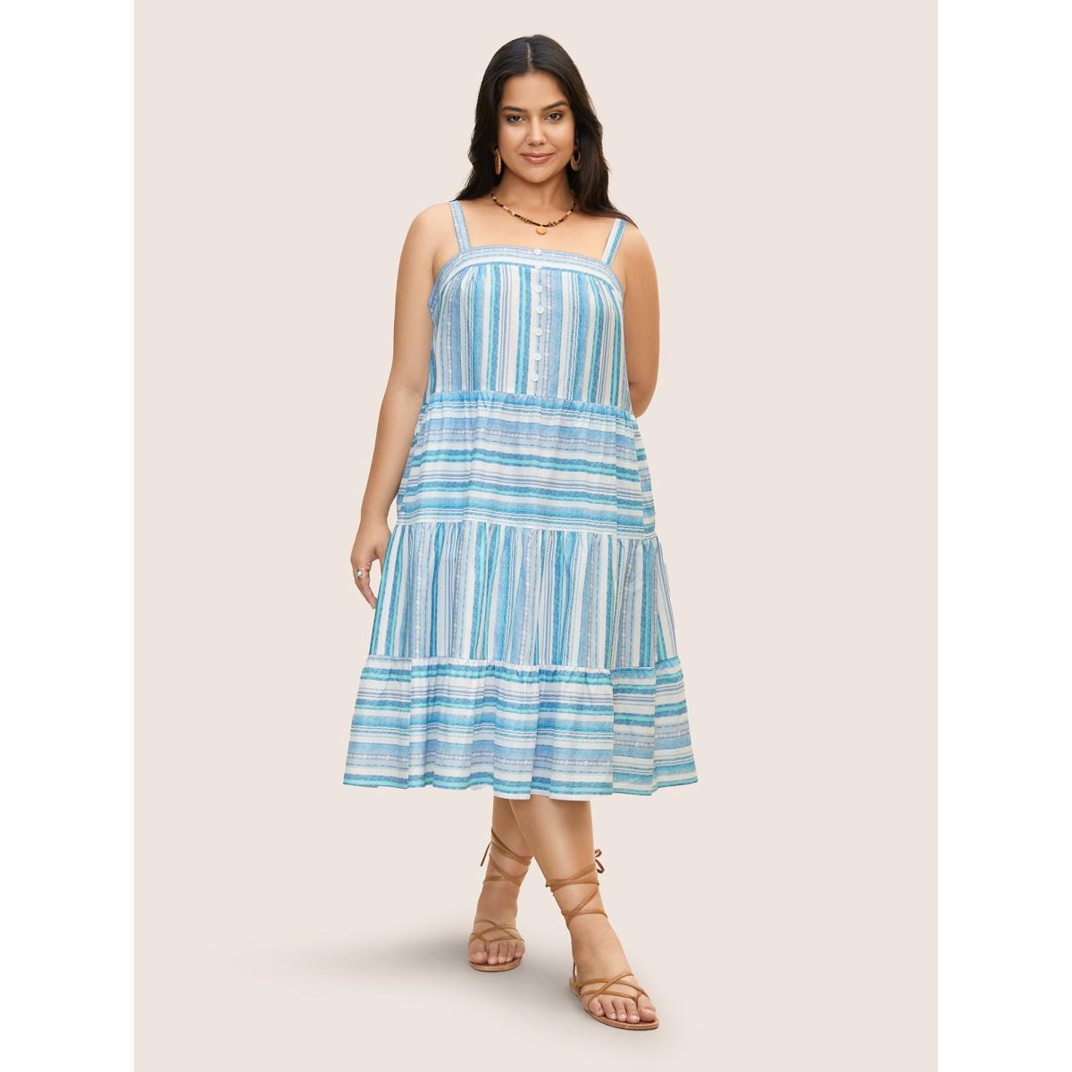Plus Size Striped Button Detail Ruffle Layered Hem Dress Cerulean Women Resort Gathered Square Neck Sleeveless Curvy BloomChic 30/6X