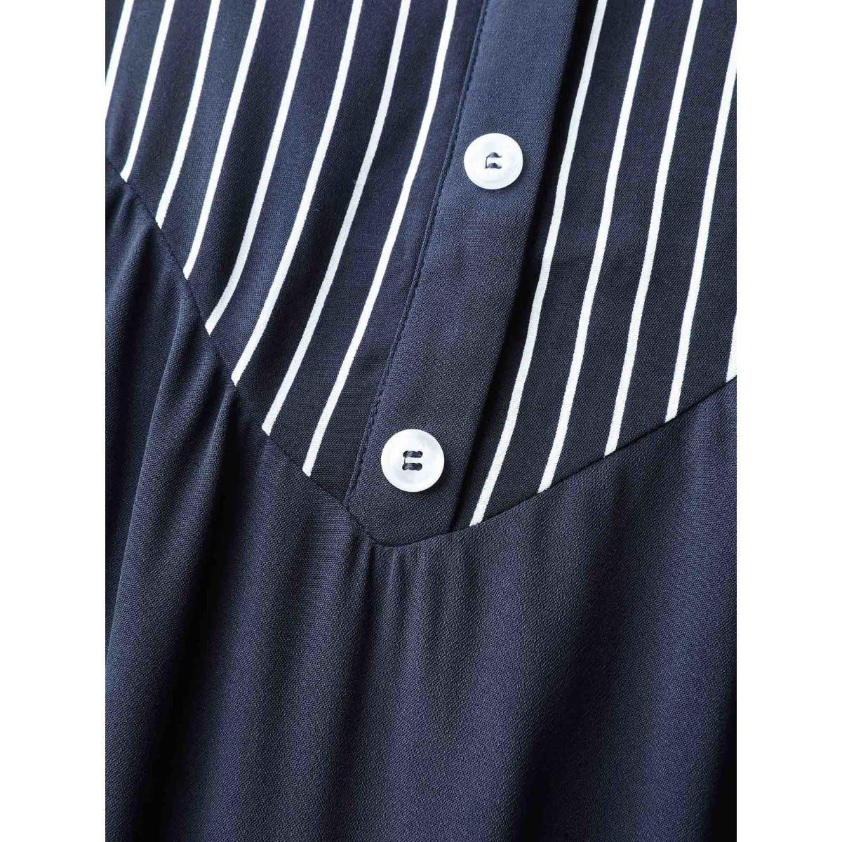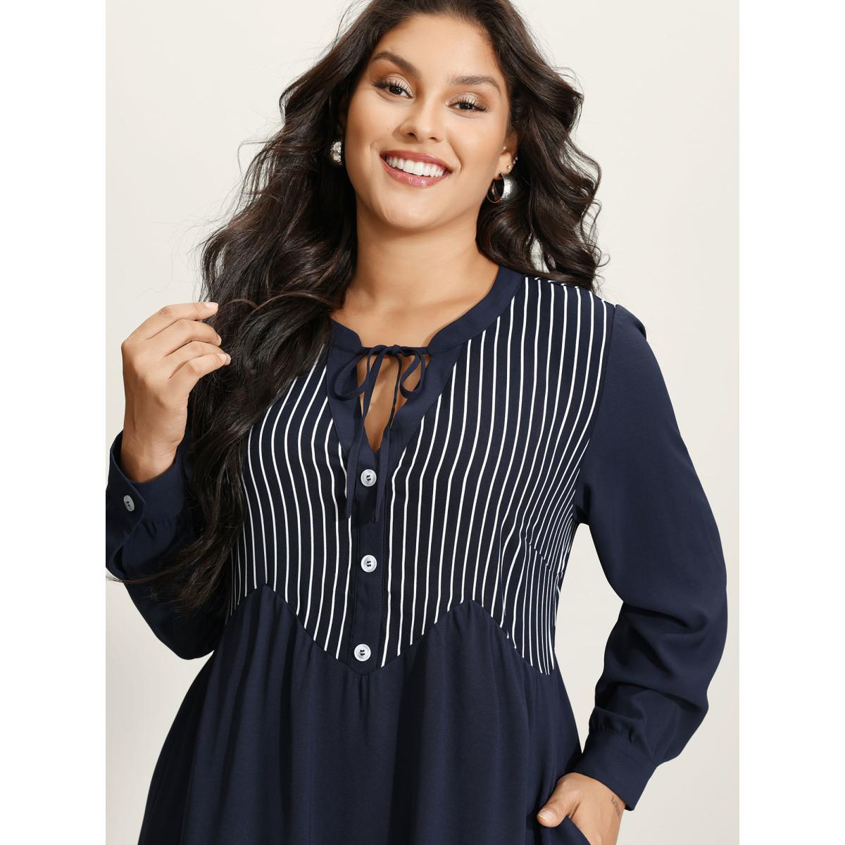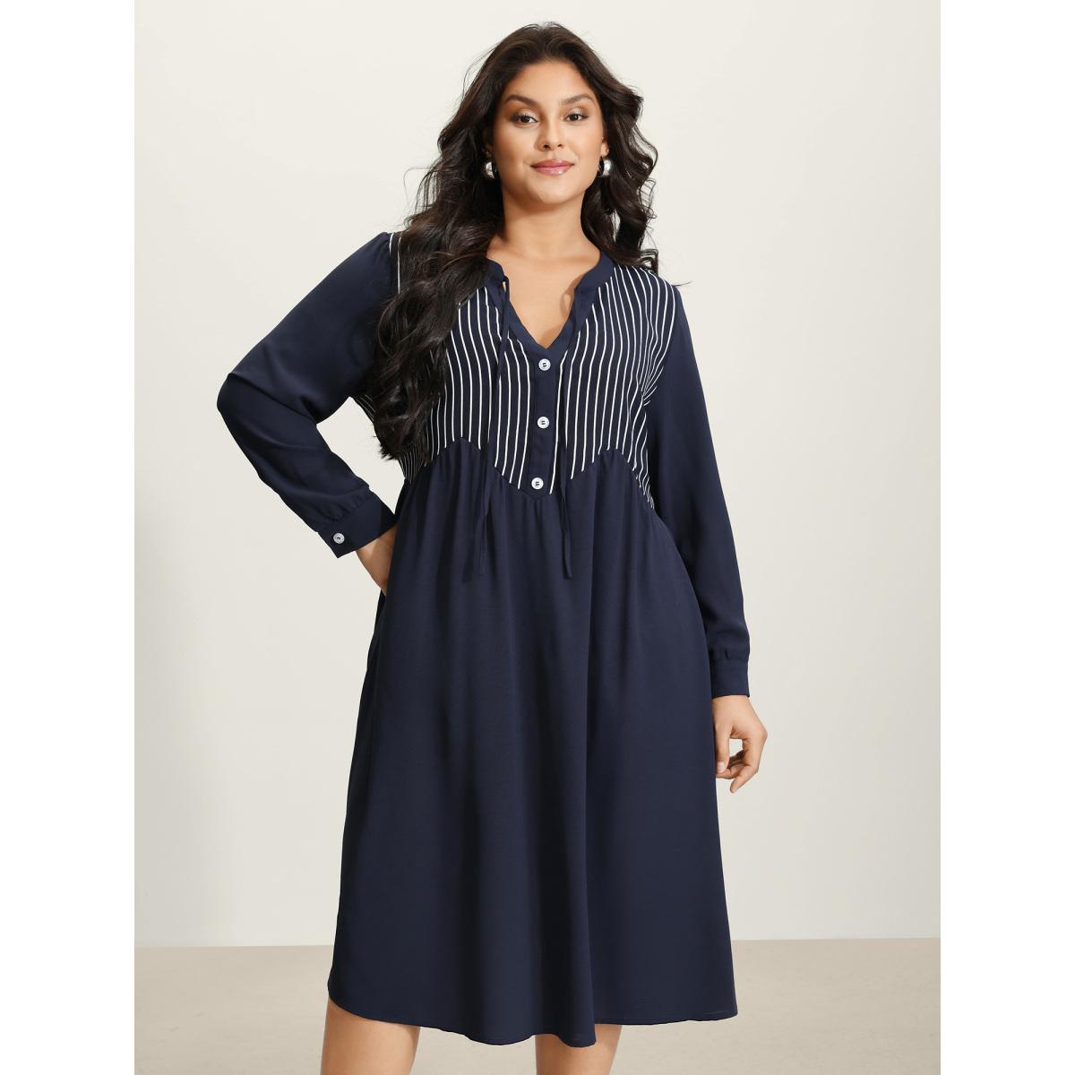 Plus Size Striped Button Detail Stretchy Waist Midi Dress Indigo Women Office Tie knot Flat collar with V-notch Extra Long Sleeve Curvy BloomChic 18-20/2X