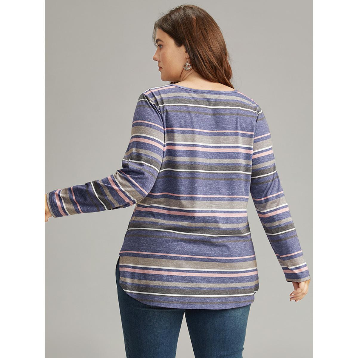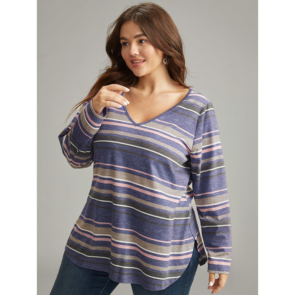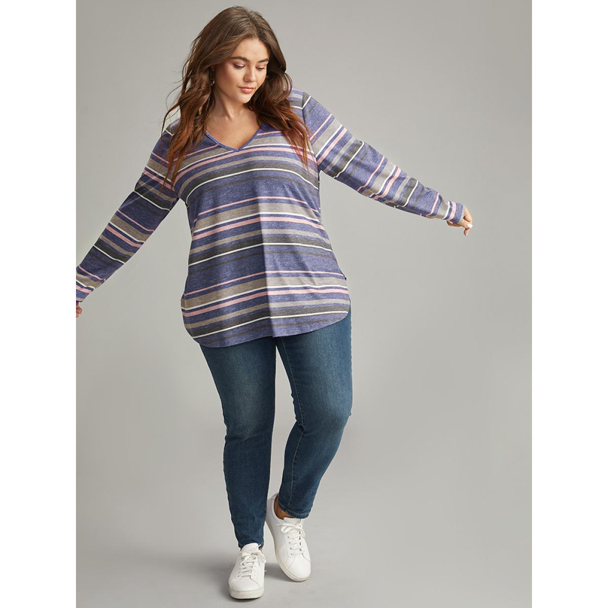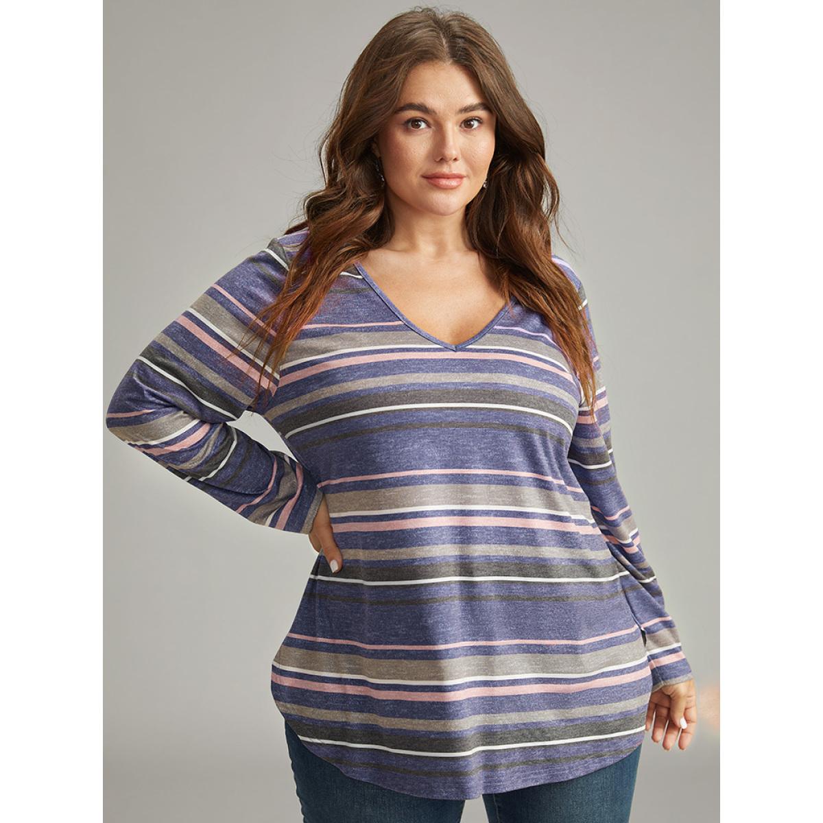 Plus Size Striped Contrast Heather Arc Hem T-shirt Indigo Women Casual Heather Striped V-neck Everyday T-shirts BloomChic 26/4X
