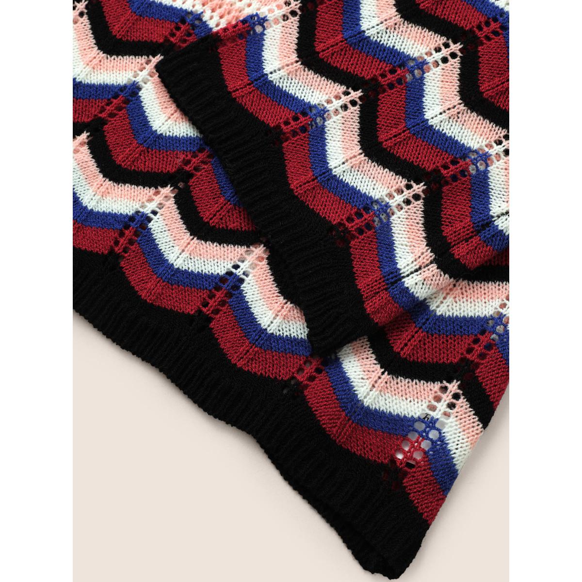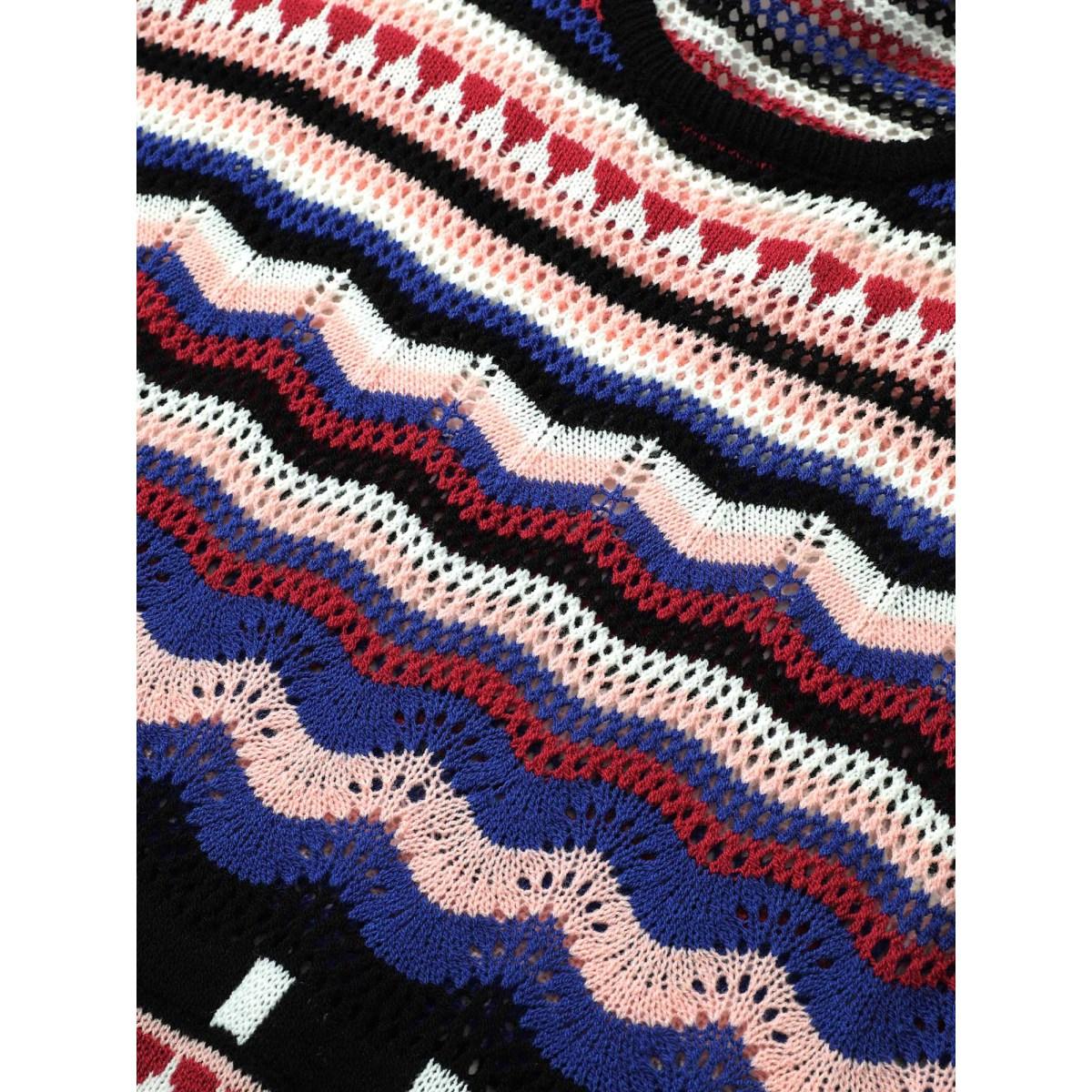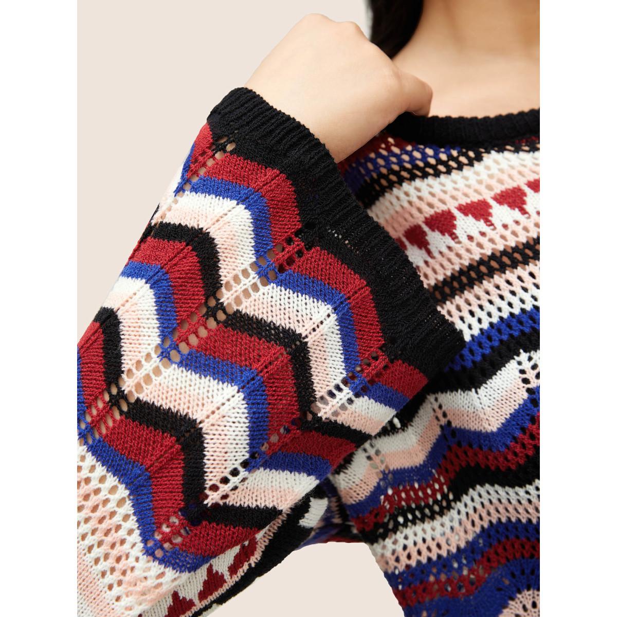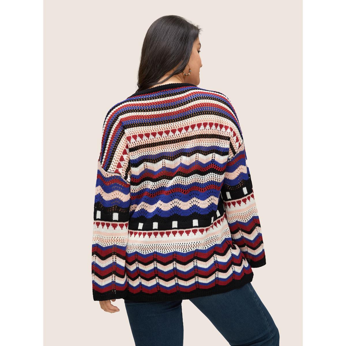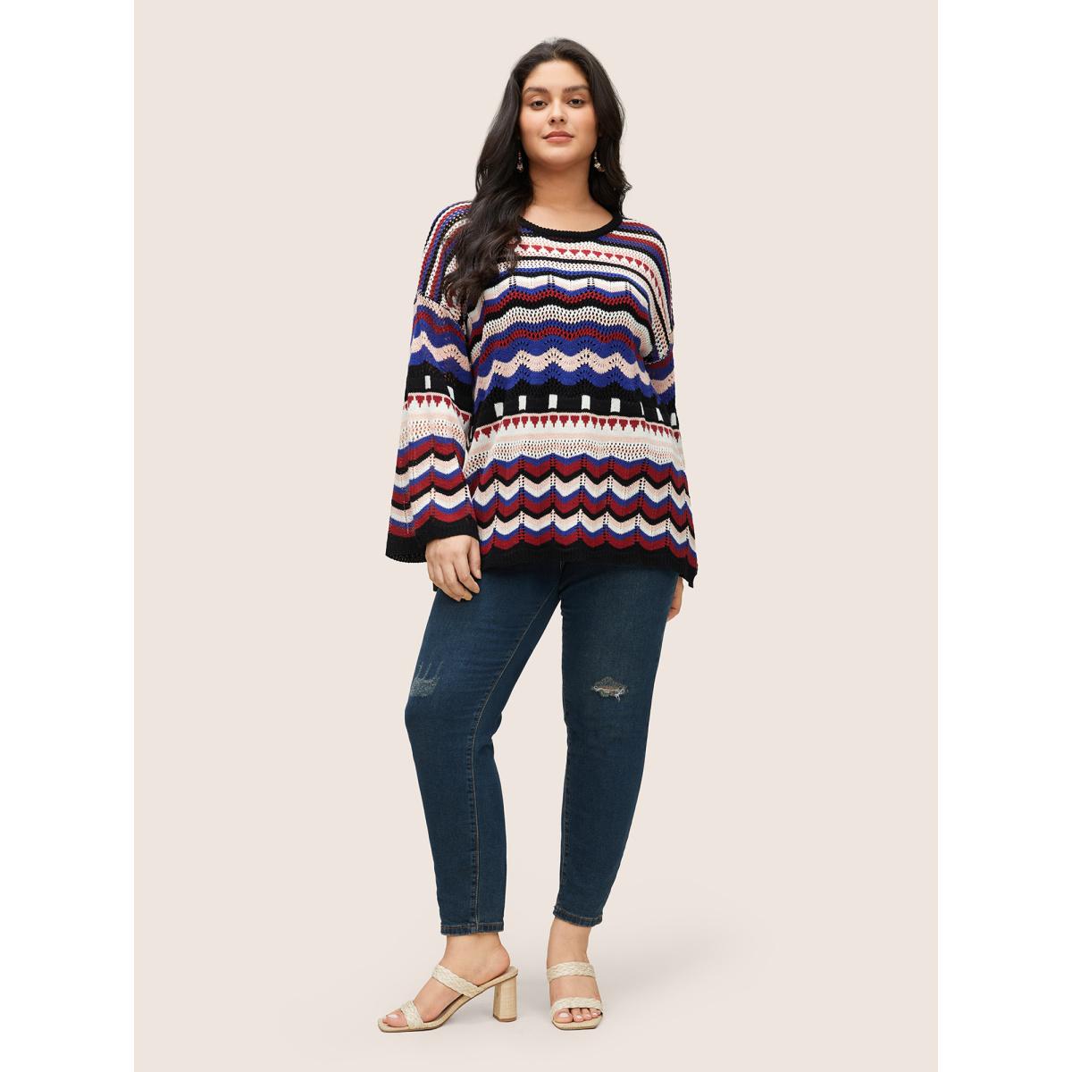 Plus Size Striped Contrast Hollow Out Drop Shoulder Pullover DarkBlue Women Resort Long Sleeve Round Neck Vacation Pullovers BloomChic 10/M