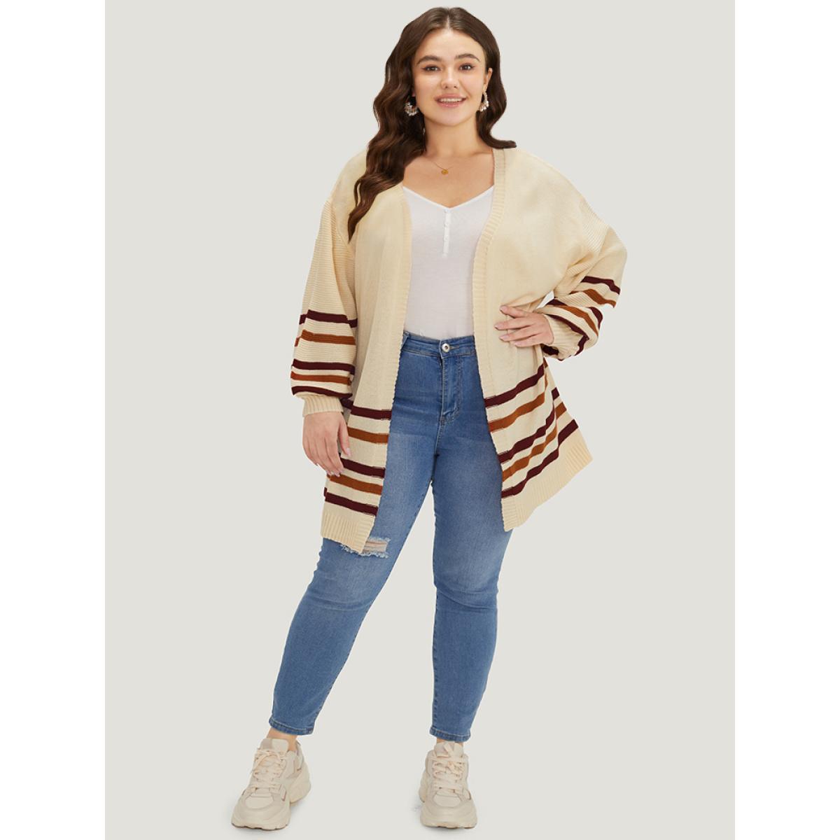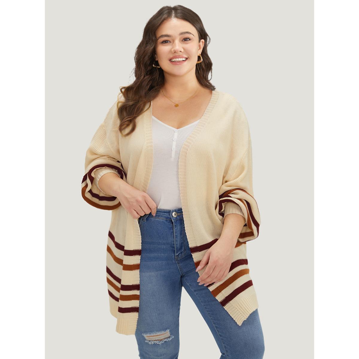 Plus Size Striped Contrast Open Front Cardigan Apricot Women Casual Loose Long Sleeve Dailywear Cardigans BloomChic 18-20/2X