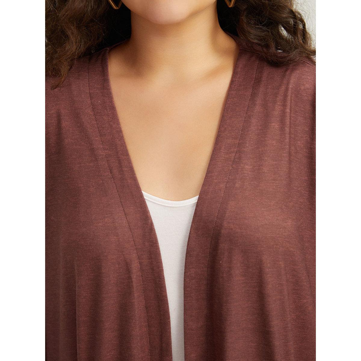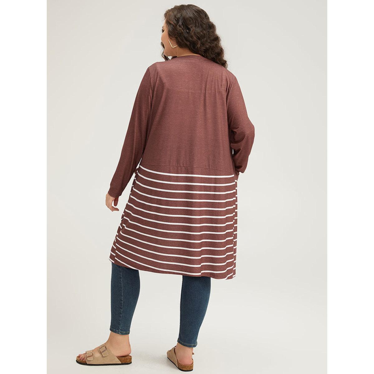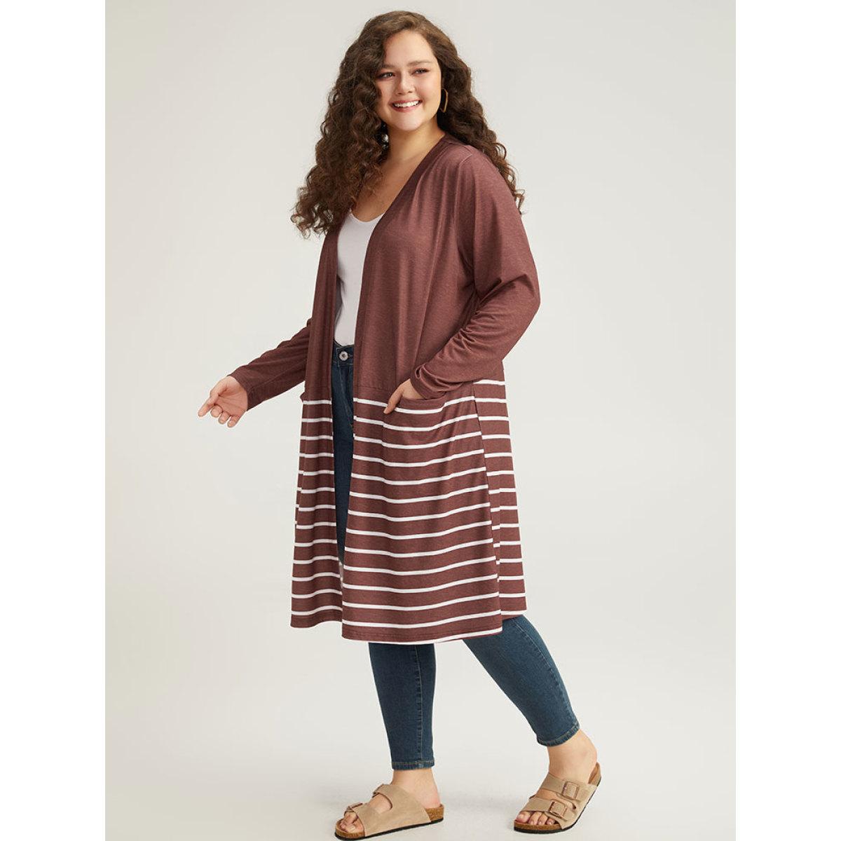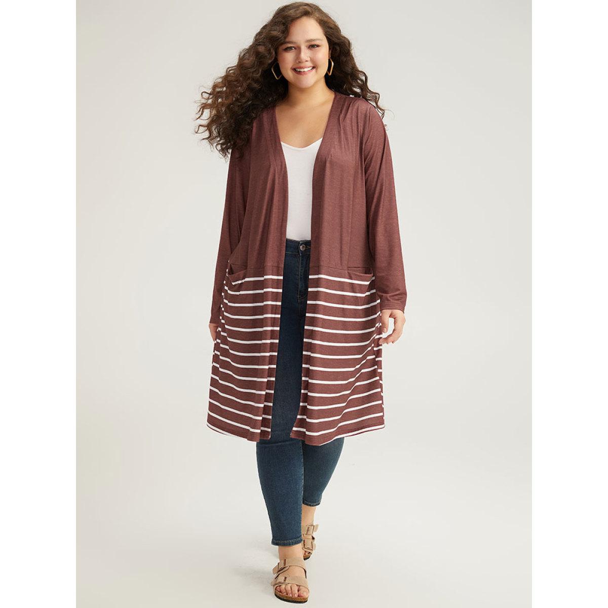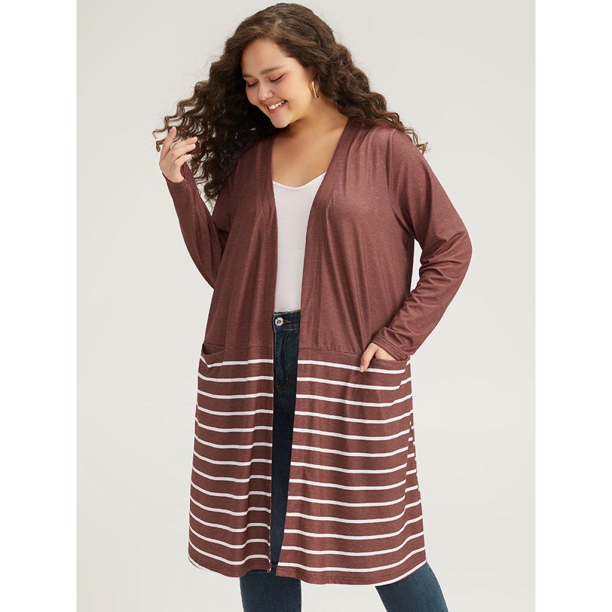 Plus Size Striped Contrast Pocket Open Front Kimono Women DarkBrown Casual Contrast Pocket Dailywear Kimonos BloomChic 18-20/2X