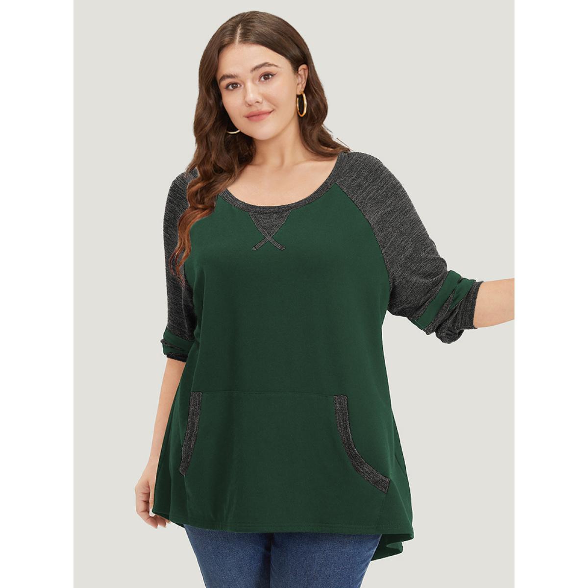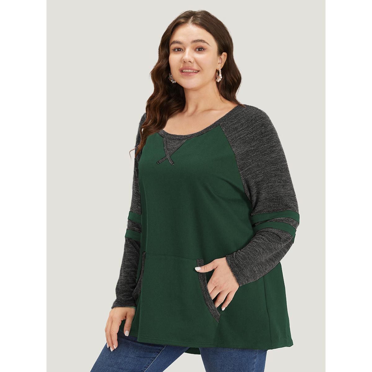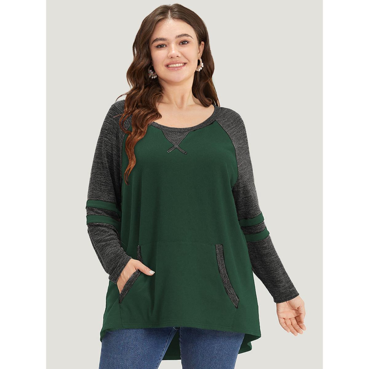 Plus Size Striped Contrast Pocket Raglan Sleeve High Low Hem Sweatshirt Women DarkGreen Casual Contrast Round Neck Everyday Sweatshirts BloomChic 12/L