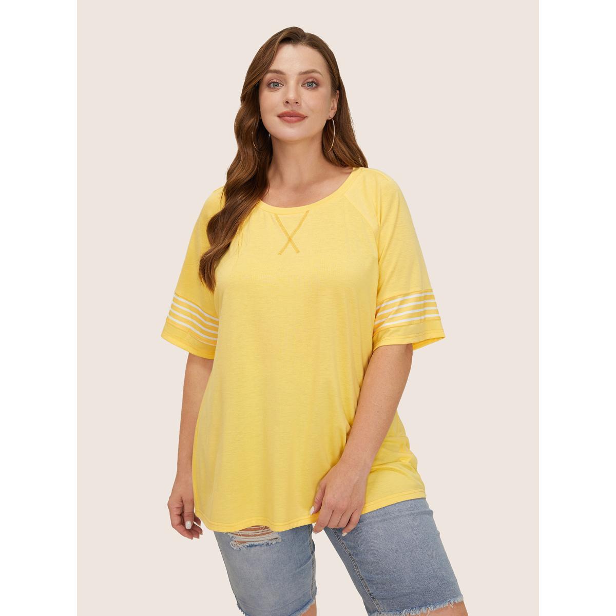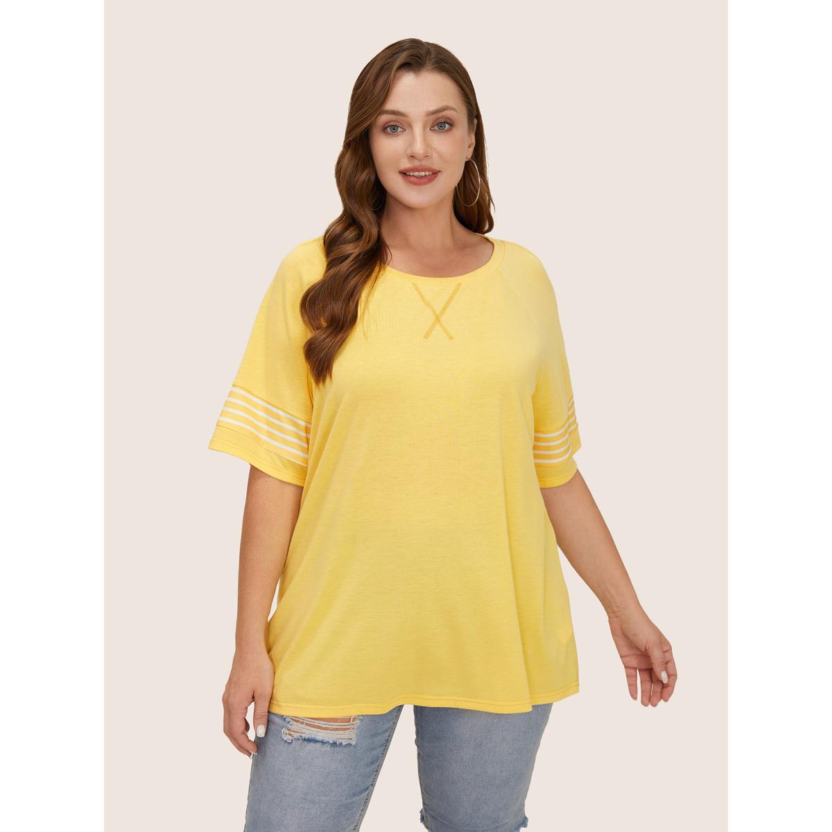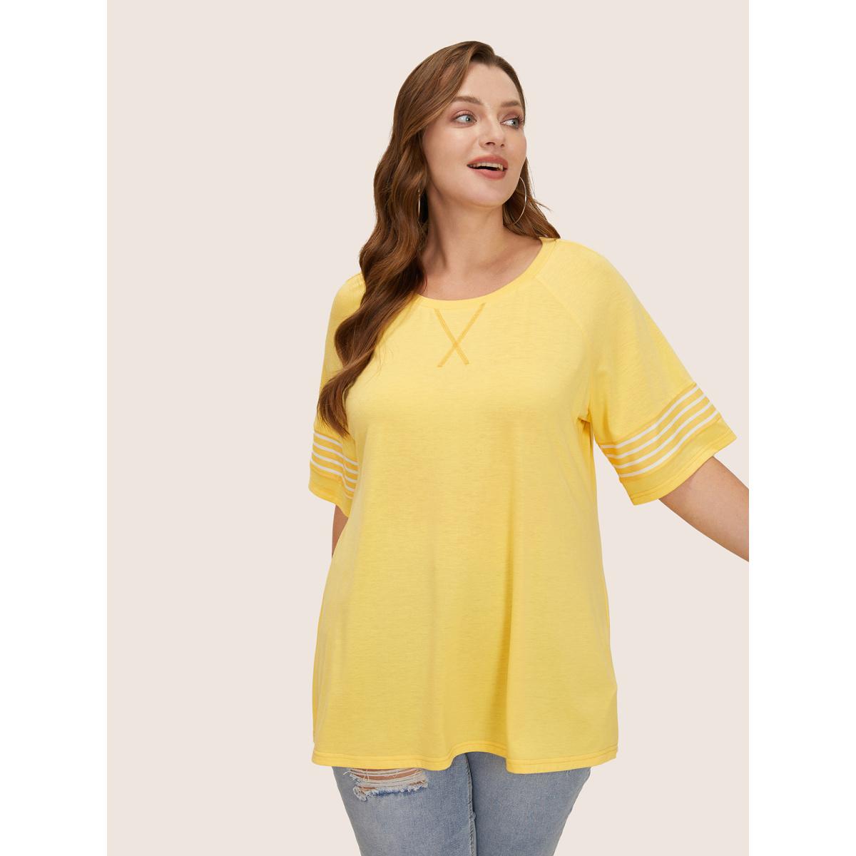 Plus Size Striped Contrast Raglan Sleeve Crew Neck T-shirt Yellow Women Casual Plain Everyday T-shirts BloomChic 18-20/2X