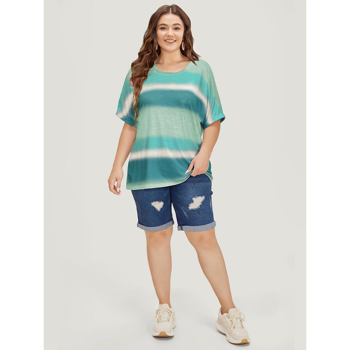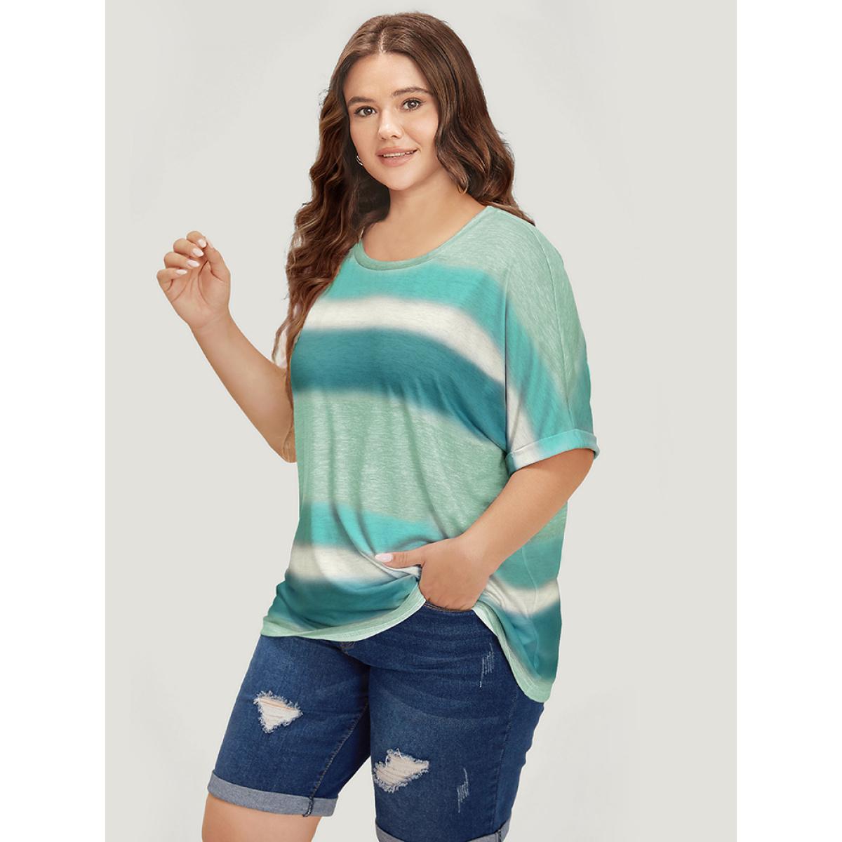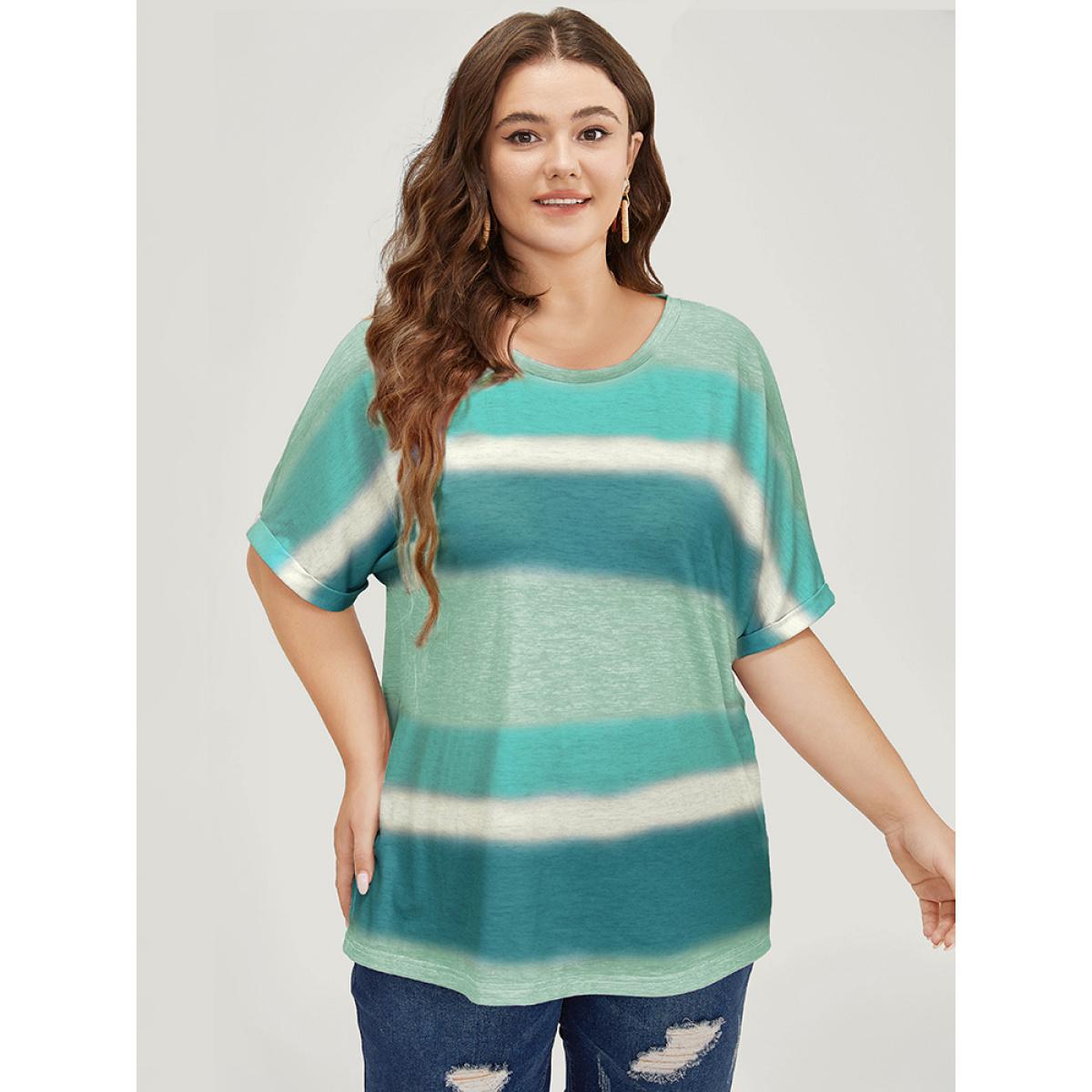 Plus Size Striped Contrast Roll Dolman Sleeve T-shirt Teal Women Casual Contrast Striped Round Neck Everyday T-shirts BloomChic 12/L