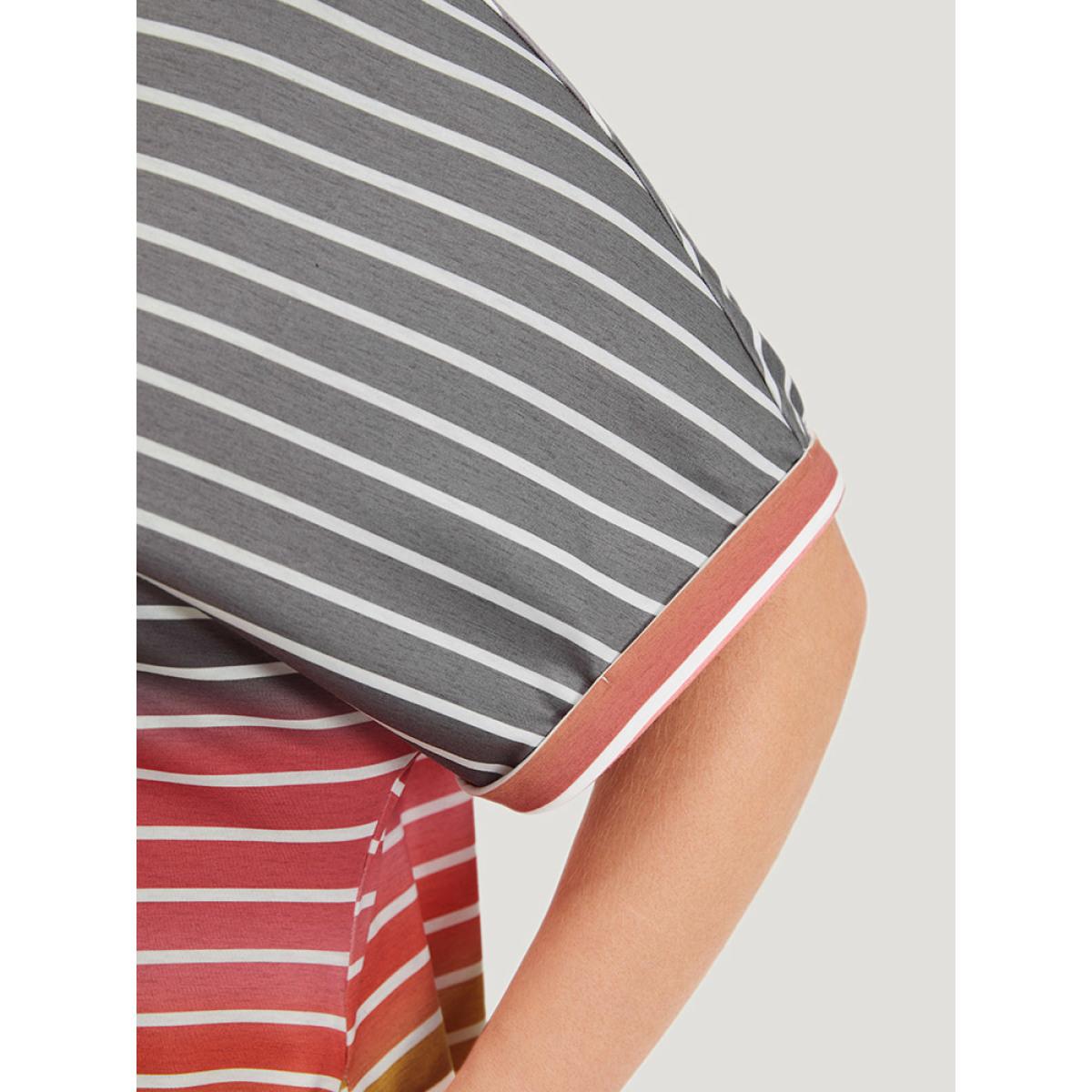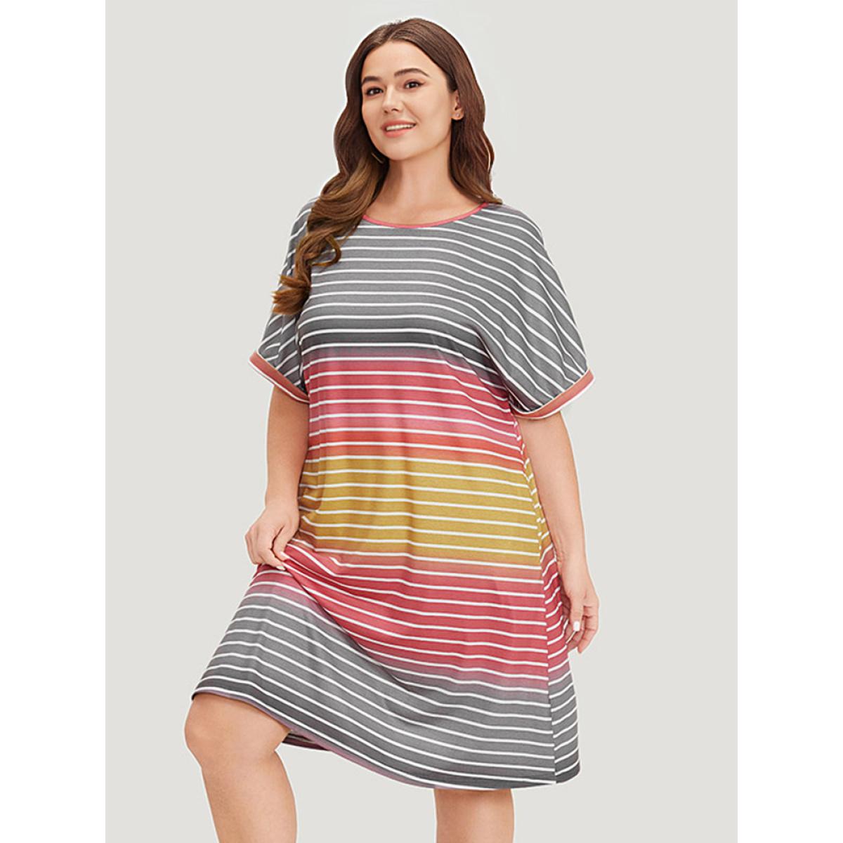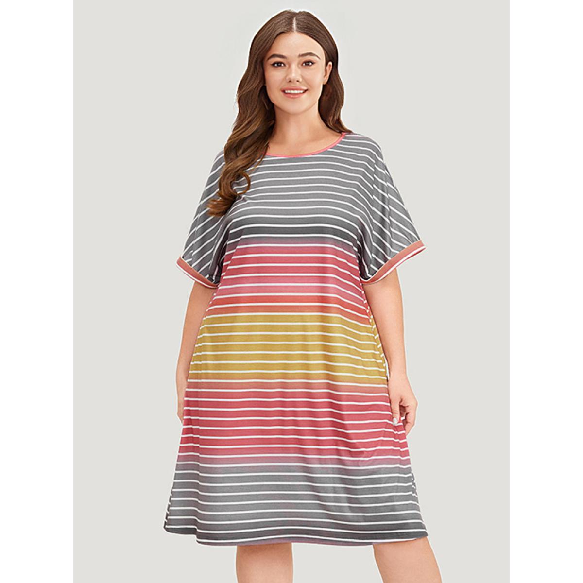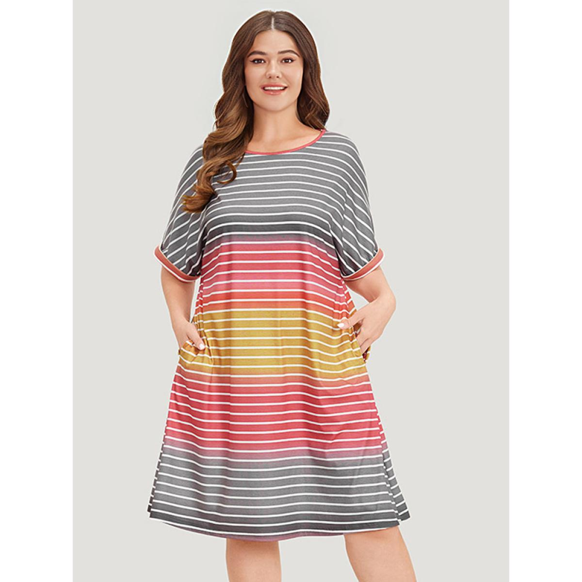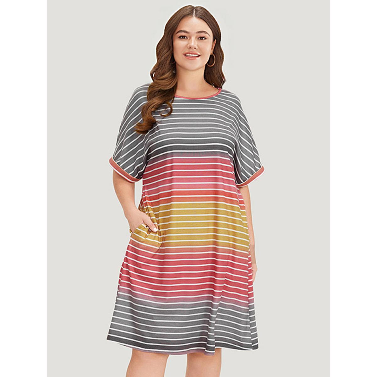 Plus Size Striped Contrast Roll Pocket Dolman Sleeve Dress Multicolor Women Casual Plain Round Neck Short sleeve Curvy Knee Dress BloomChic 14-16/1X